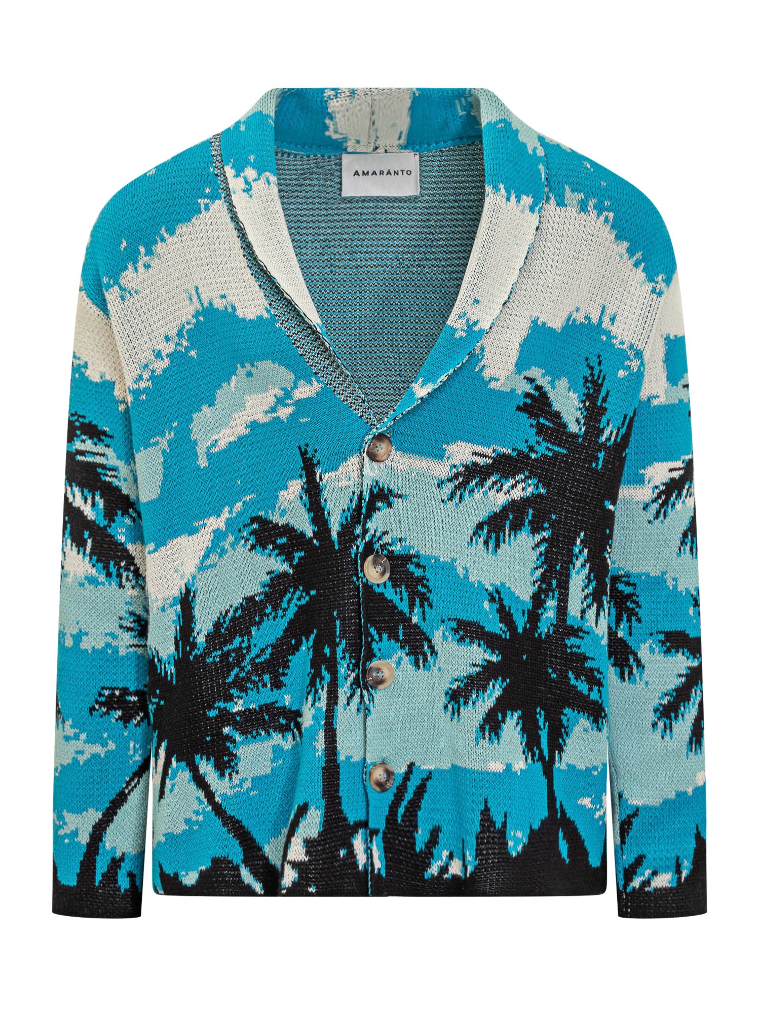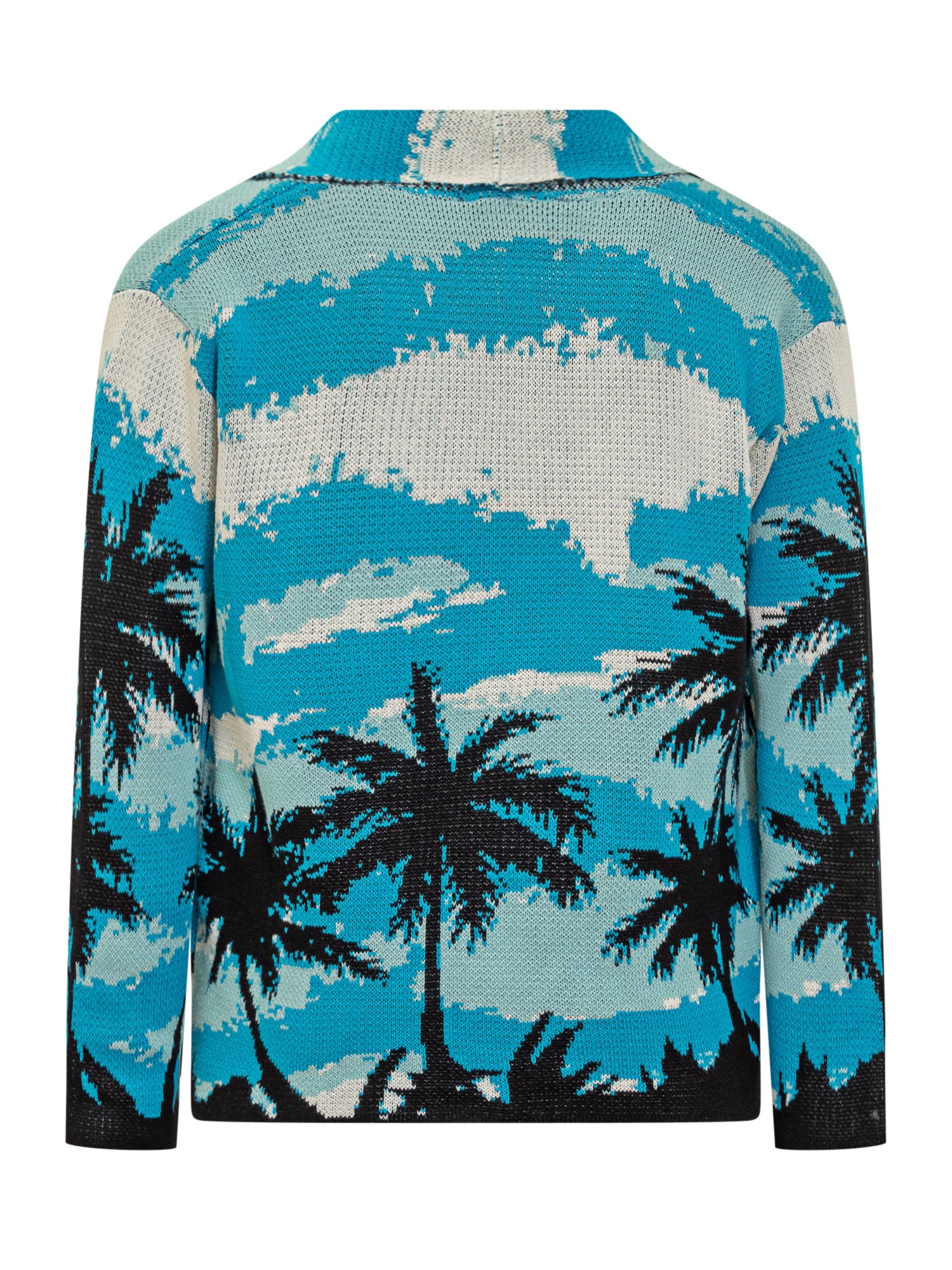 Blue cotton cardigan. Patterned palms in jacquard. V-neck. Button fastening.