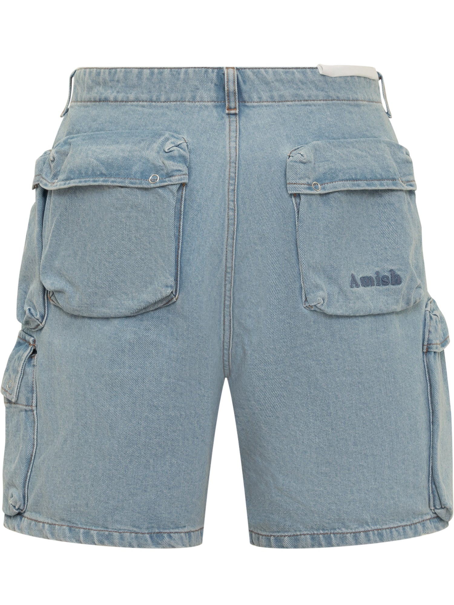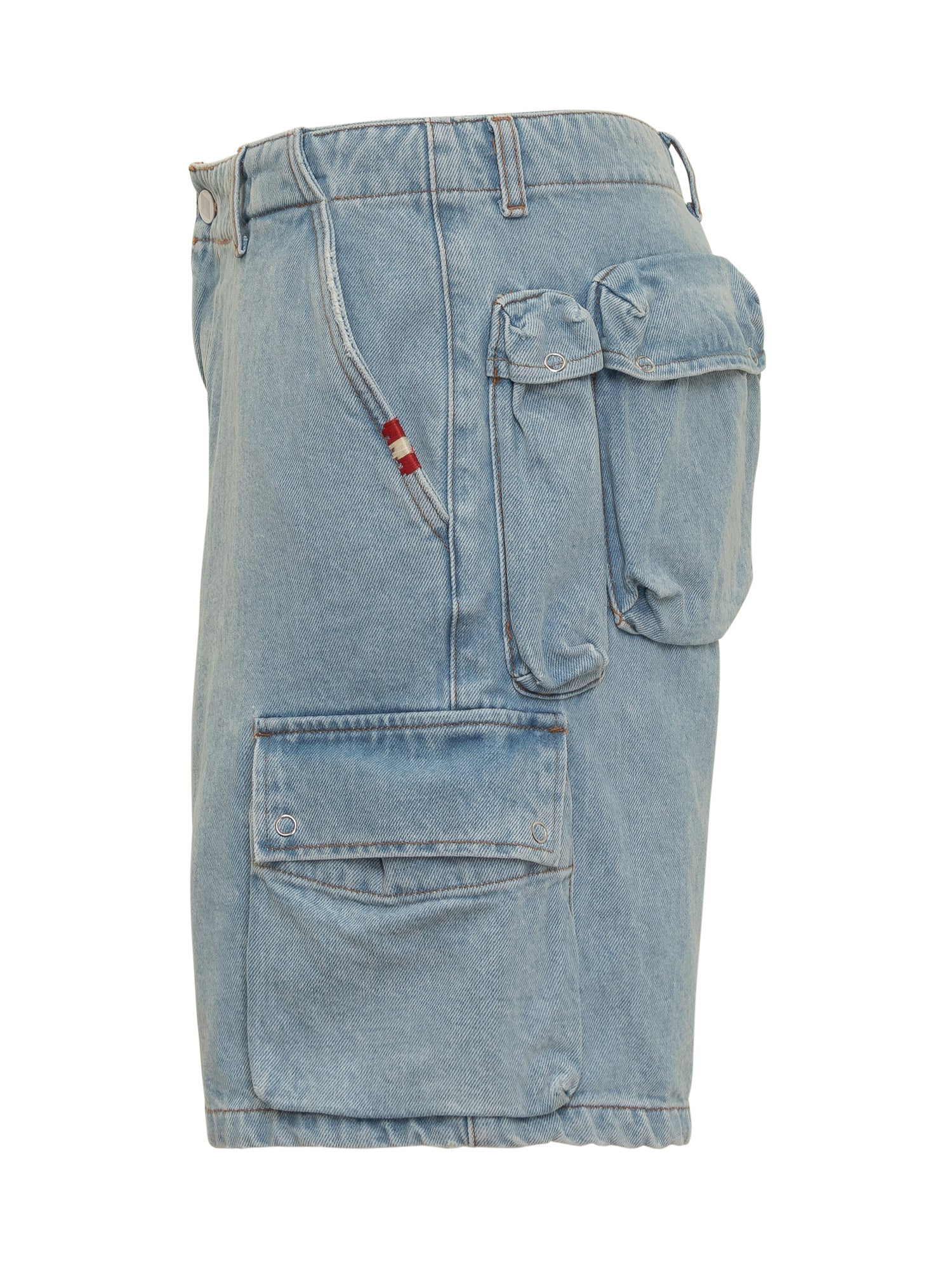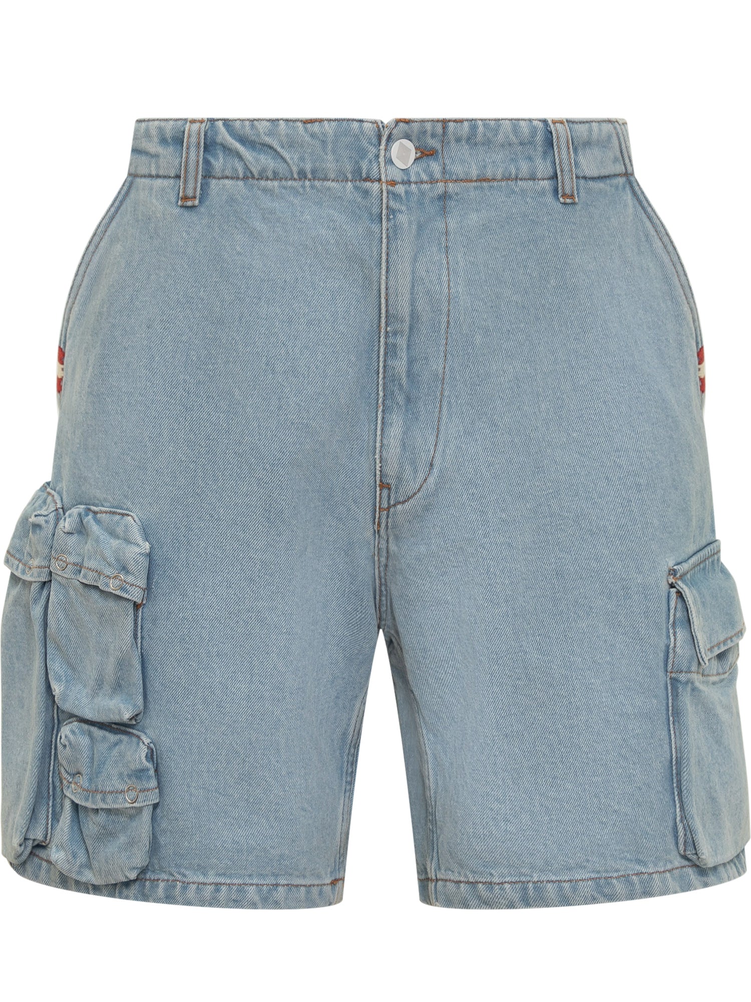 Denim cargo bermuda shorts. Button and zipper closure. Belt loops. Two pockets on front. All over cargo pockets. Embroidered logo on front and back.