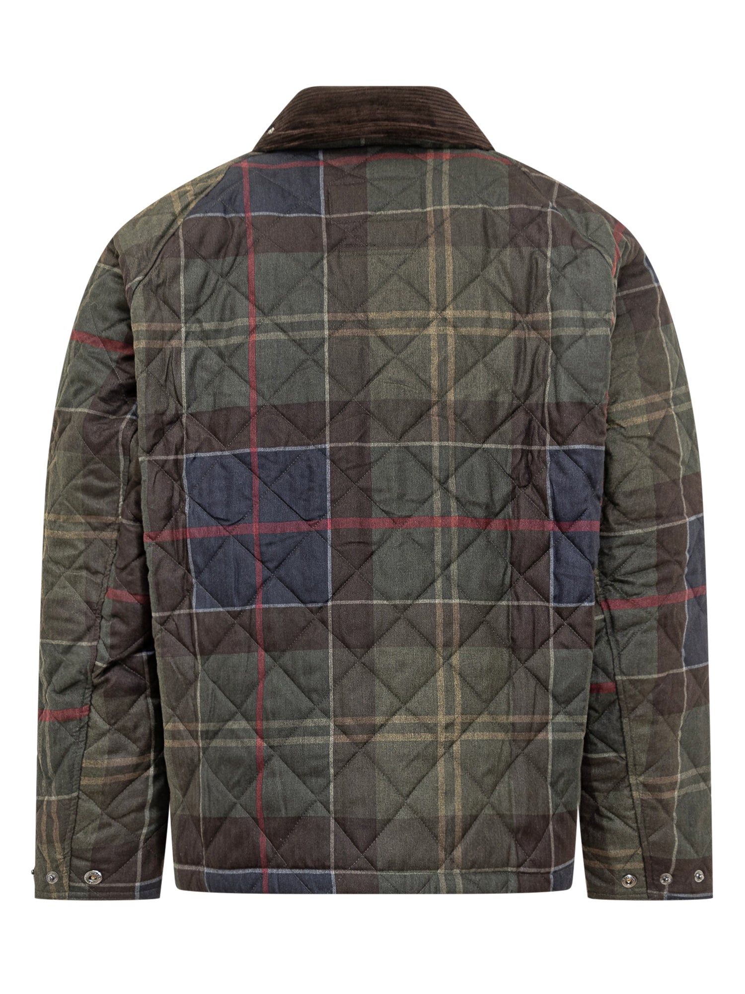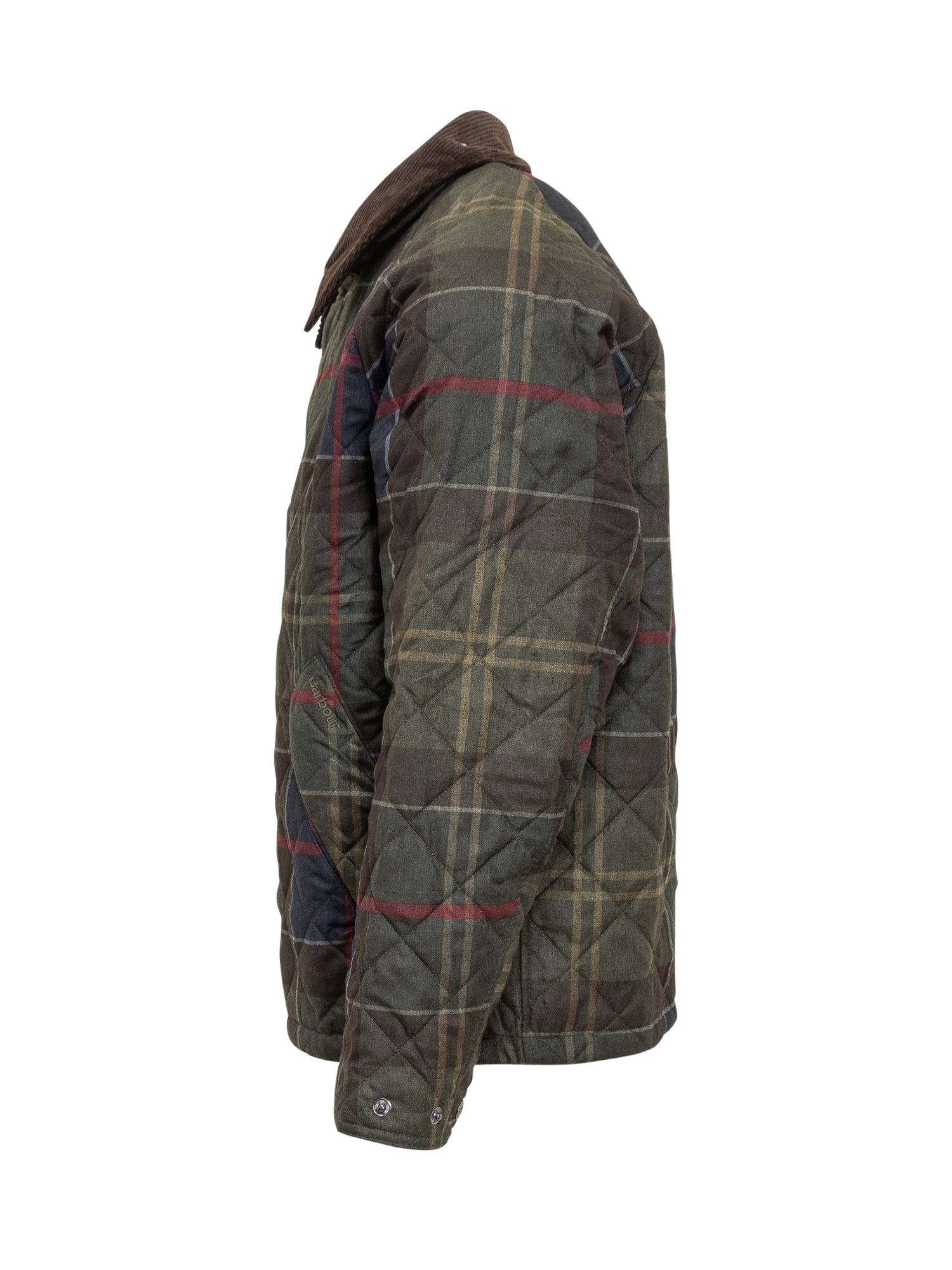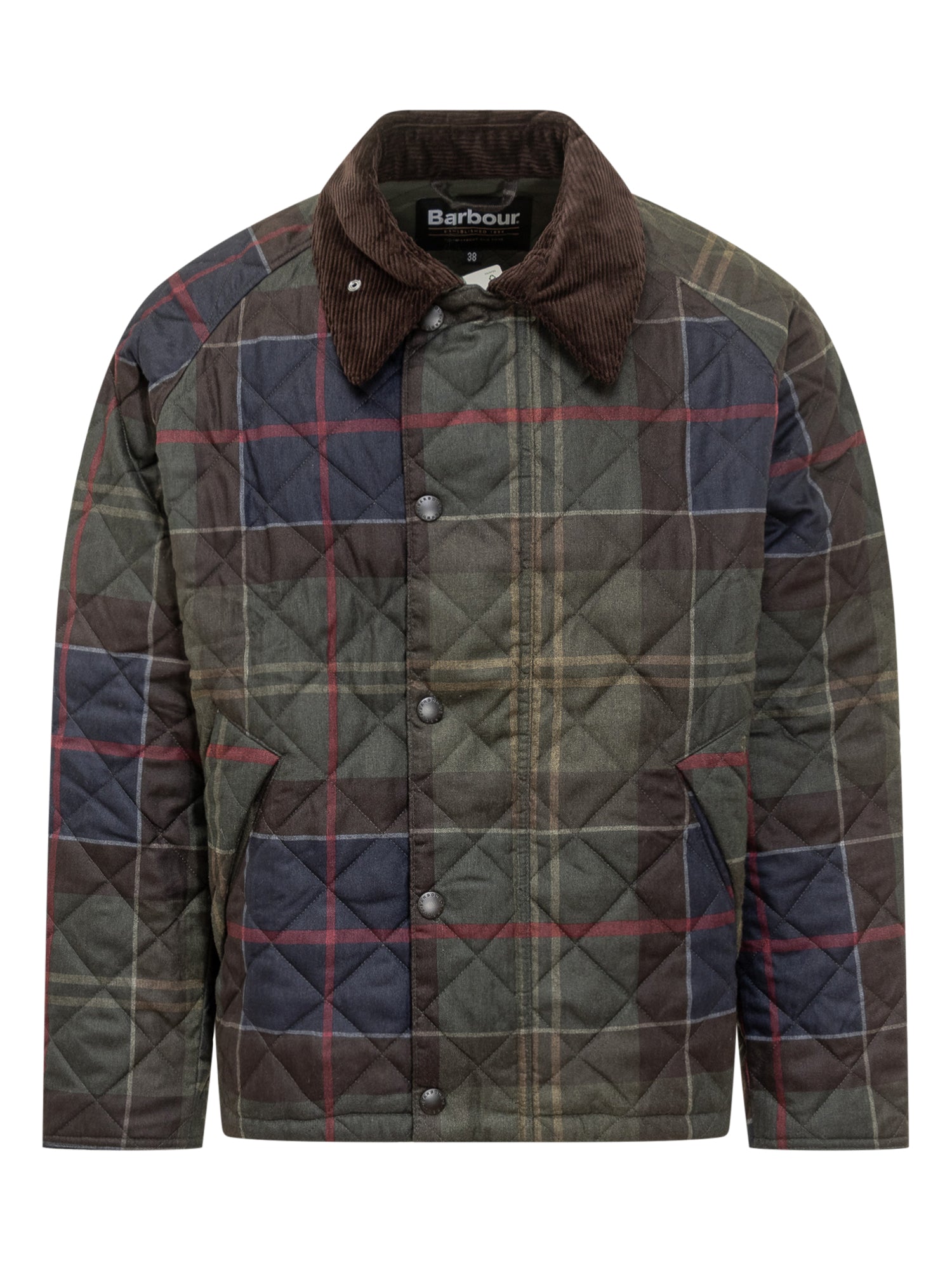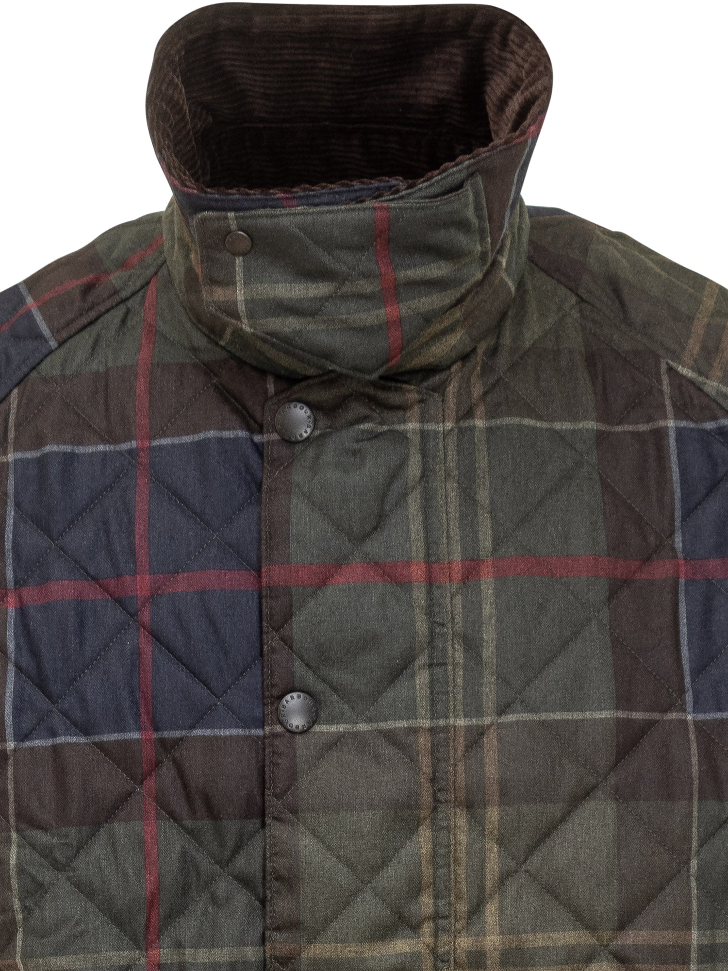 Barbour Heritage quilted jacket with signature tartan pattern and corduroy collar.