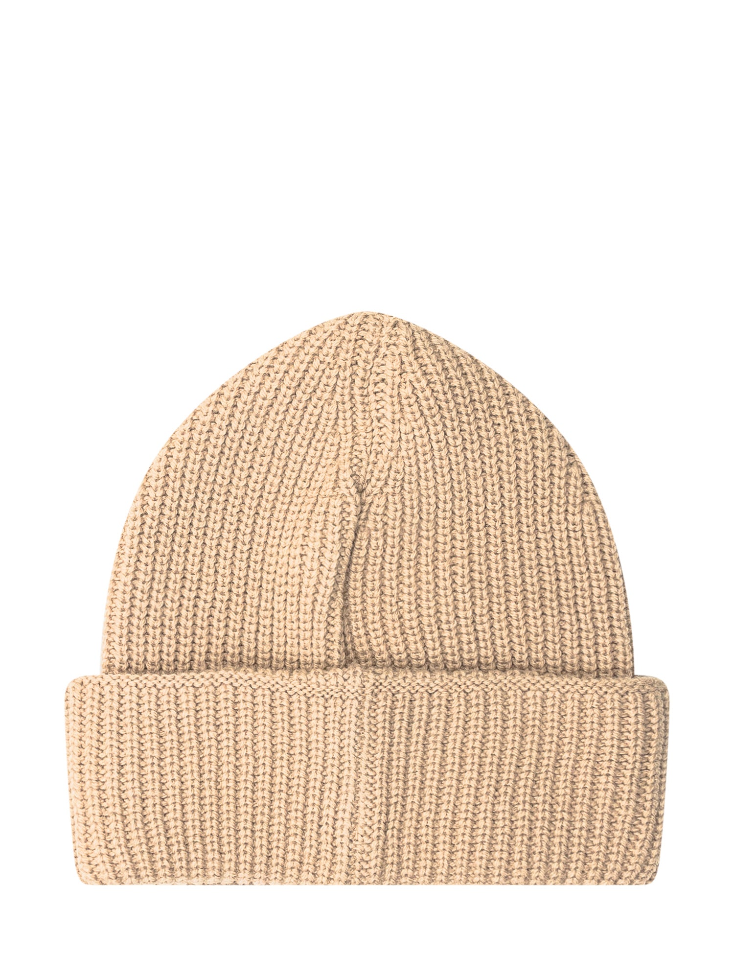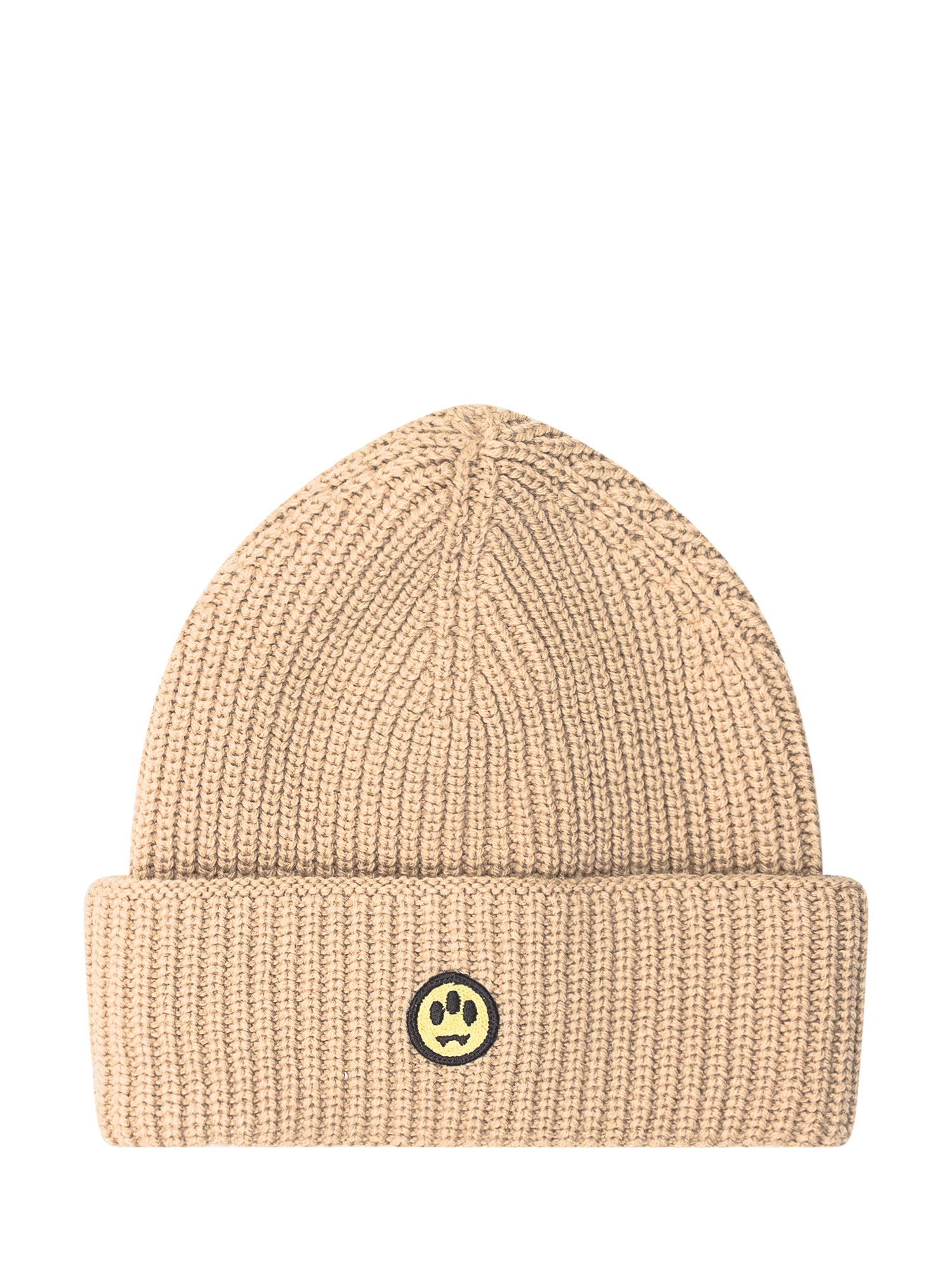 Barrow beige ribbed knit beanie with fold-over brim and yellow smile logo patch.