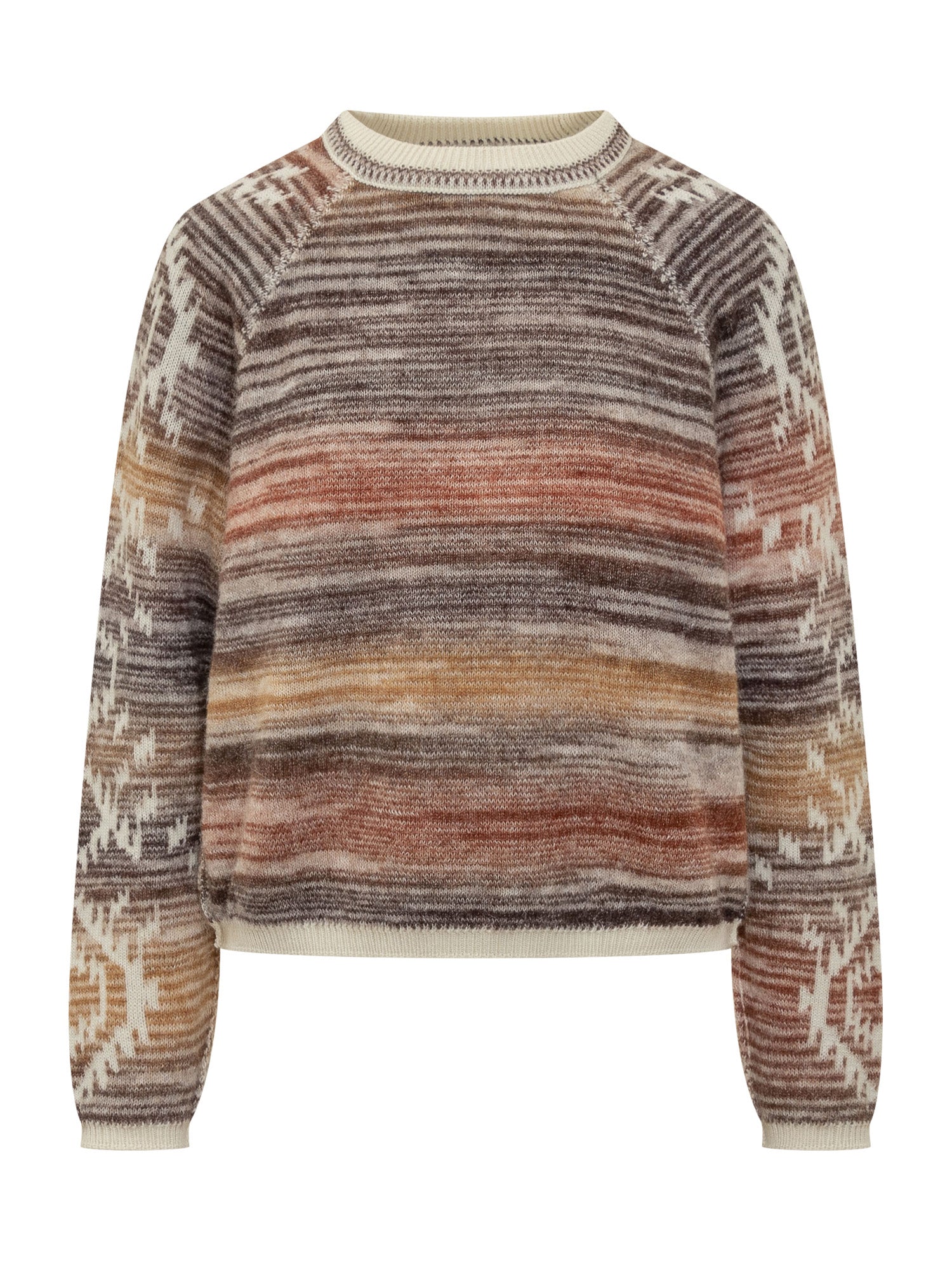 Ba&sh soft knit sweater featuring gradient stripes in warm tones and jacquard pattern on the sleeves.
