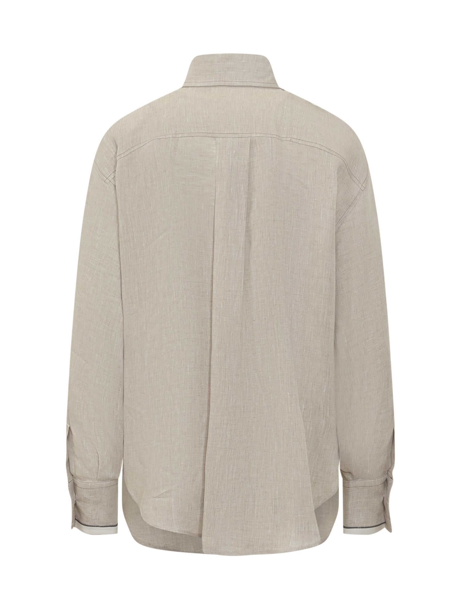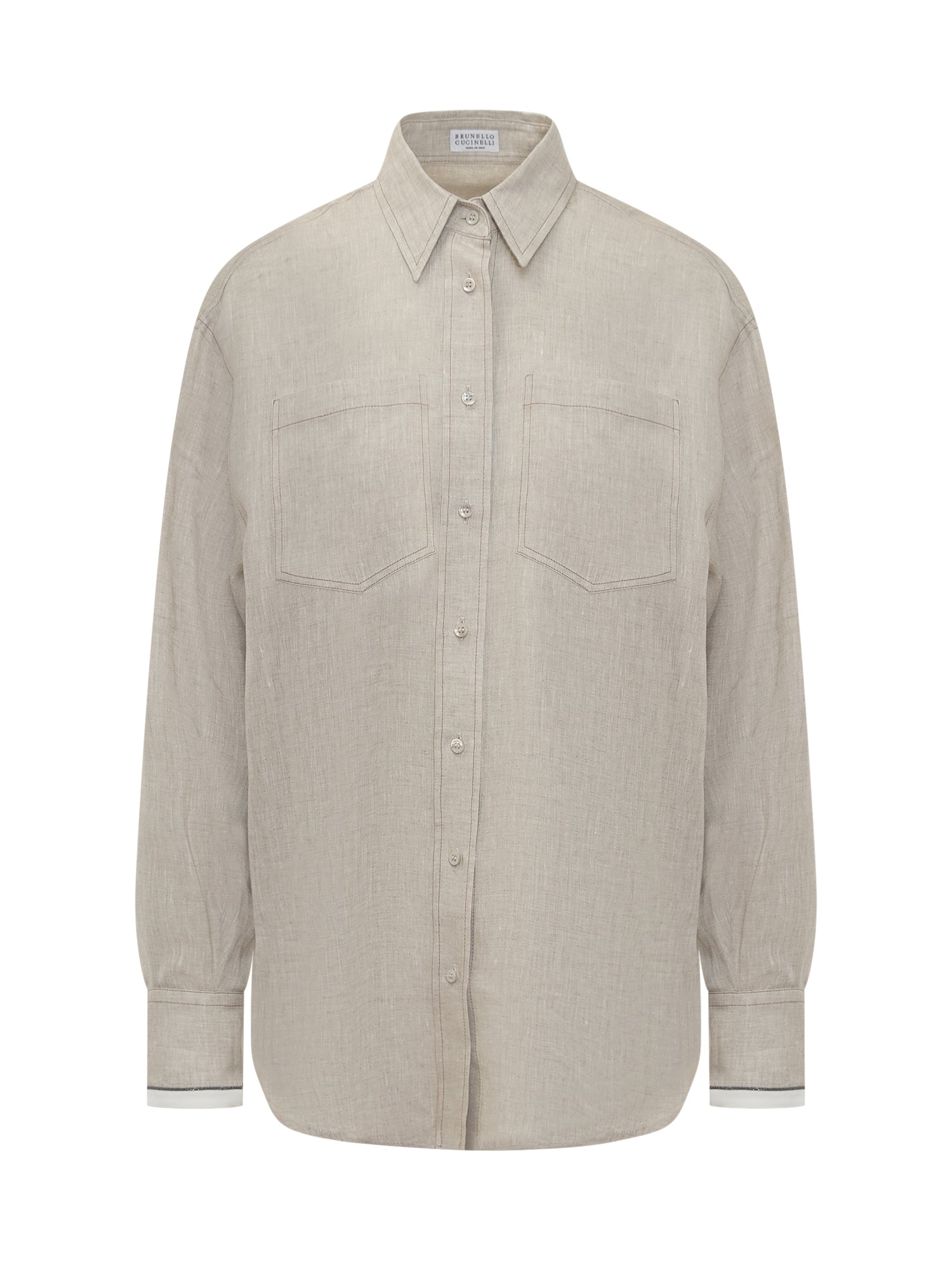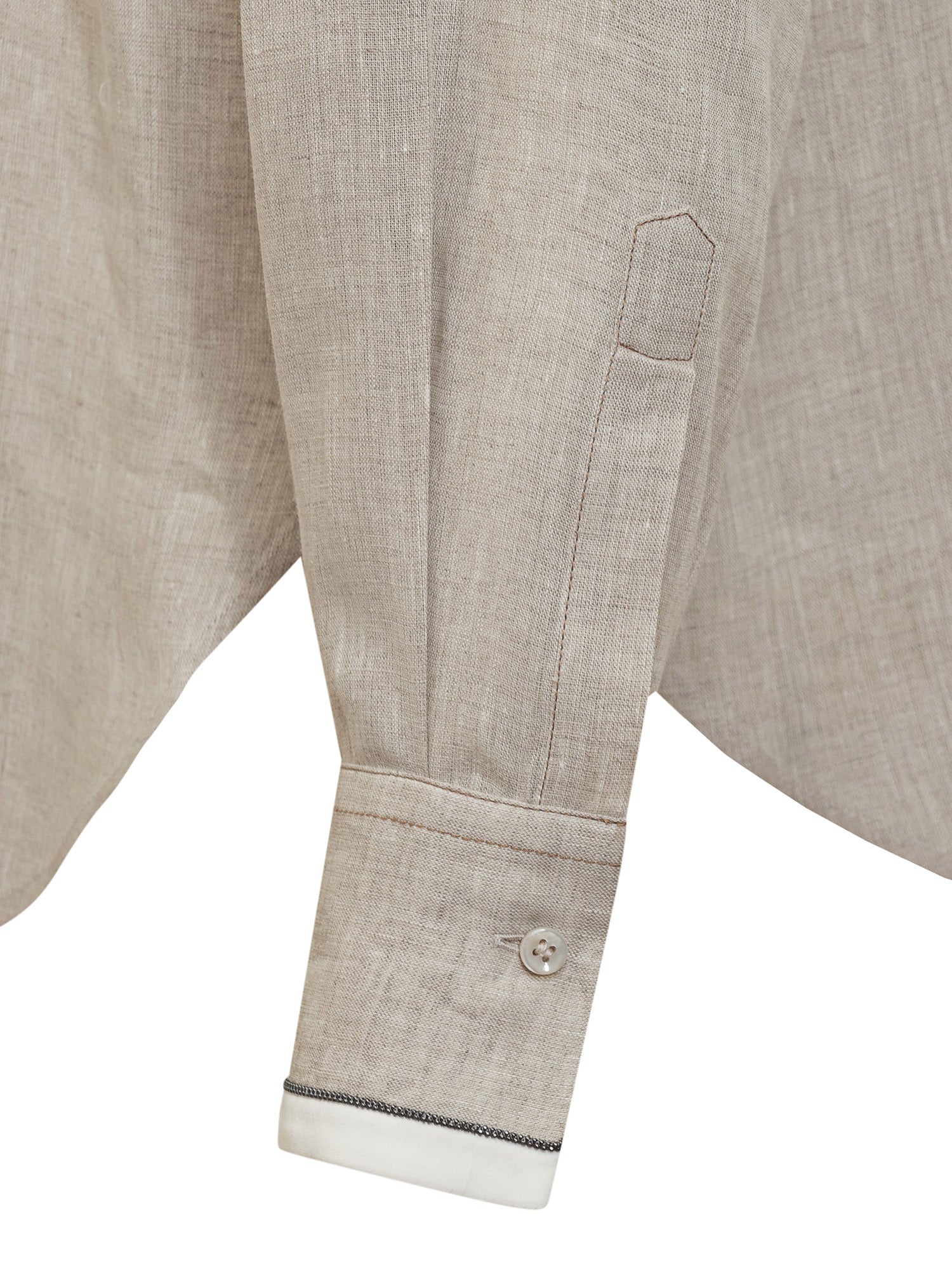 Long-sleeved shirt in linen. Classic collar. Button fastening. Cuffs with button and contrasting pattern. Two chest pockets. Contrast stitching.