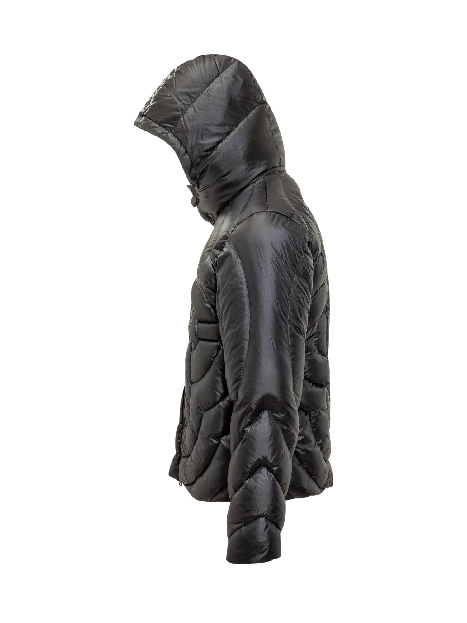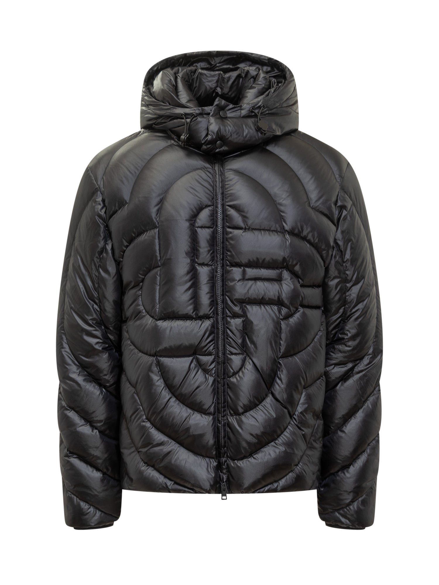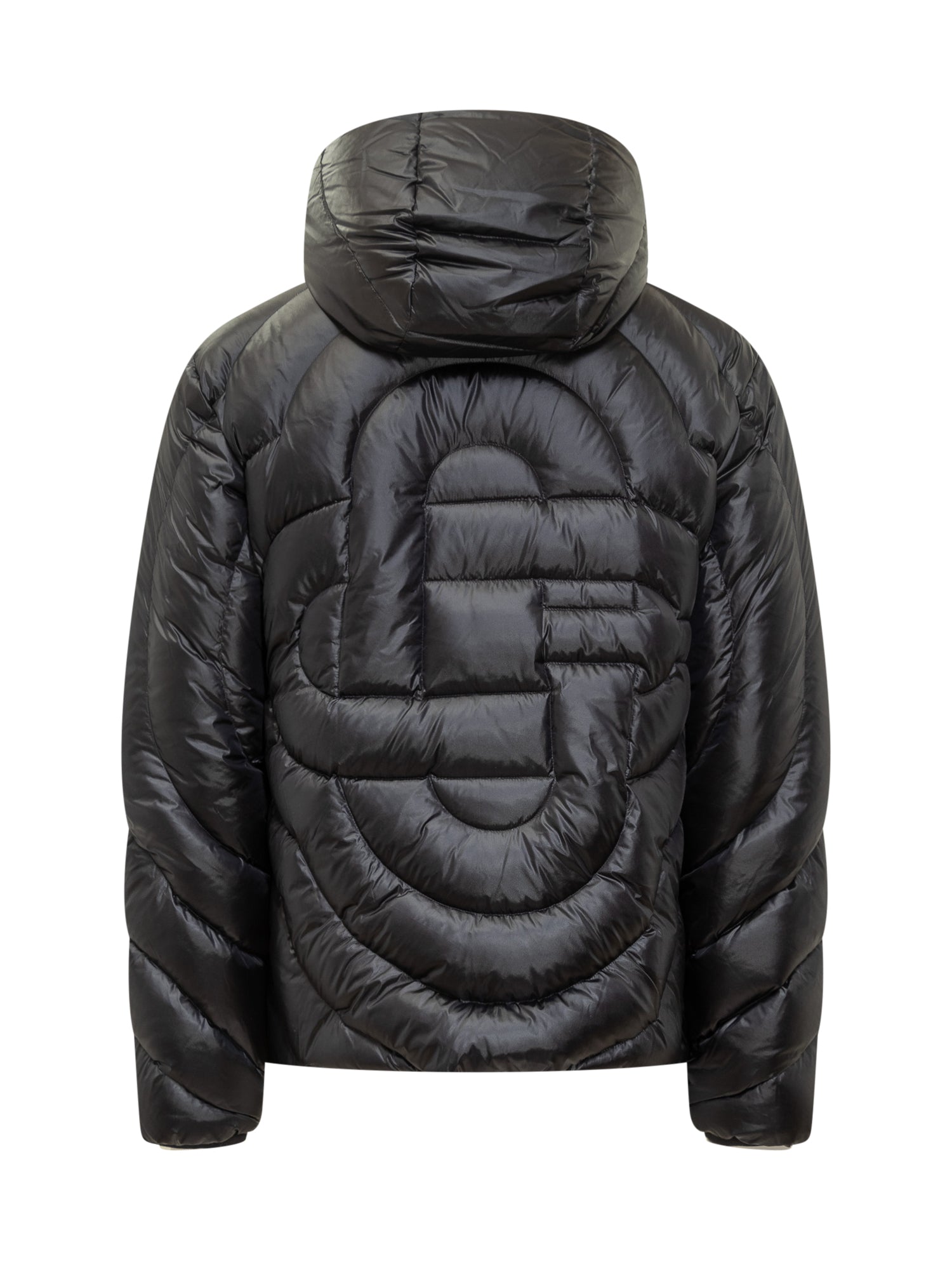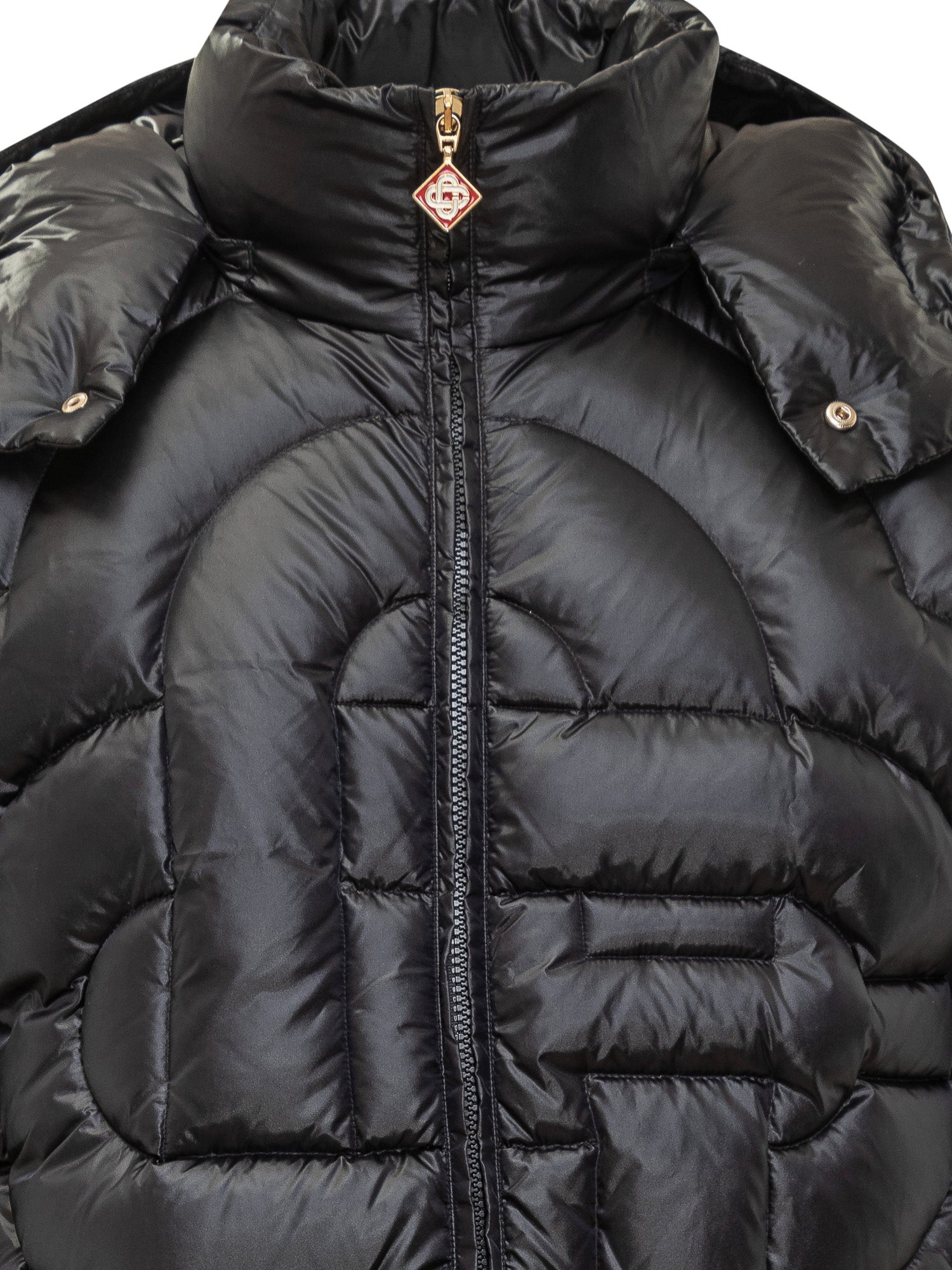 Casablanca black nylon down jacket with quilted logo, hood and zip closure. Modern and warm design.