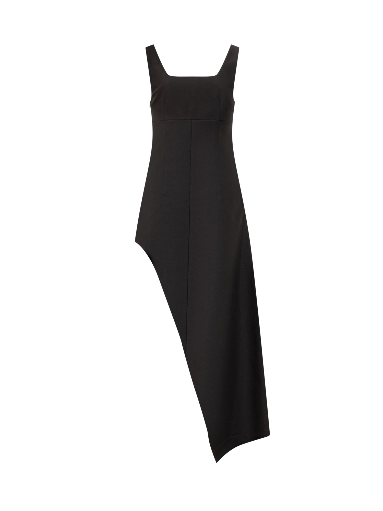 Square neckline. Sleeveless with shoulder straps. Zip closure. Asymmetrical design.