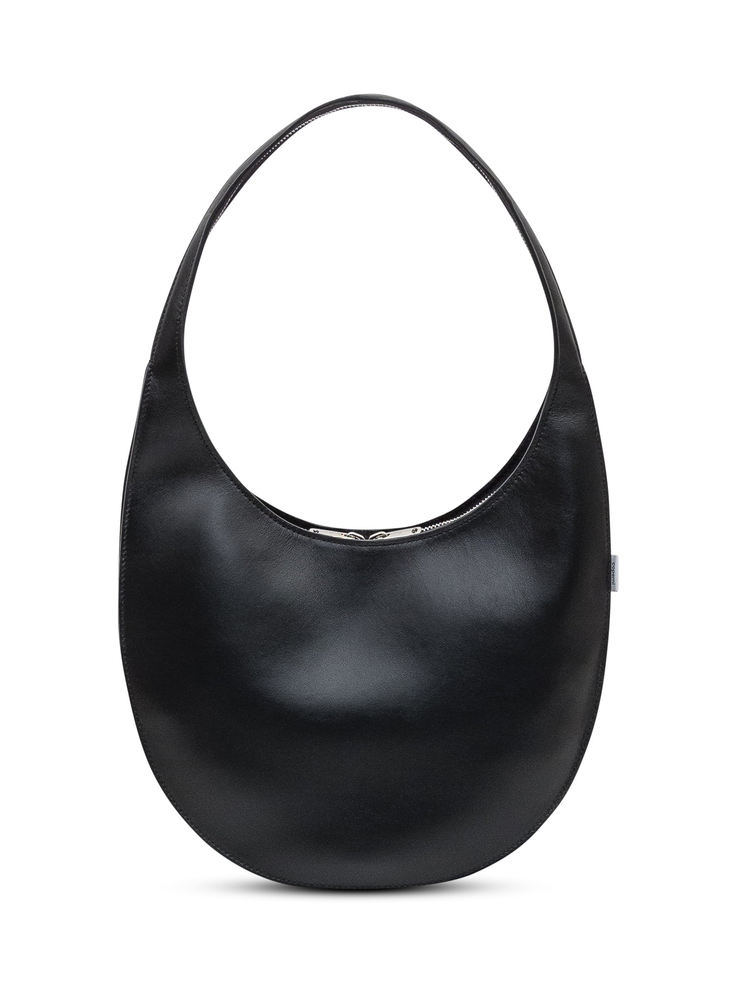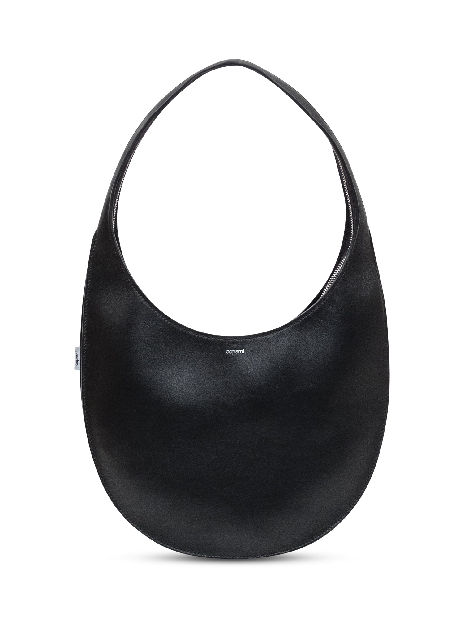 Smooth black leather shoulder bag with a crescent shape and minimal logo on the front.