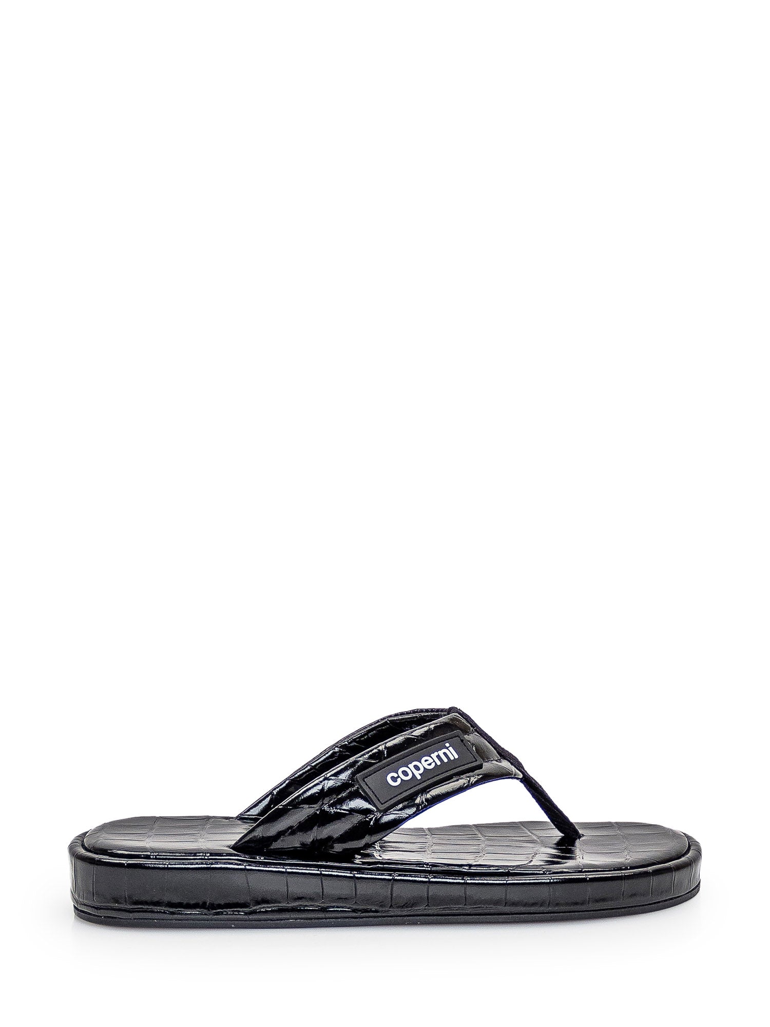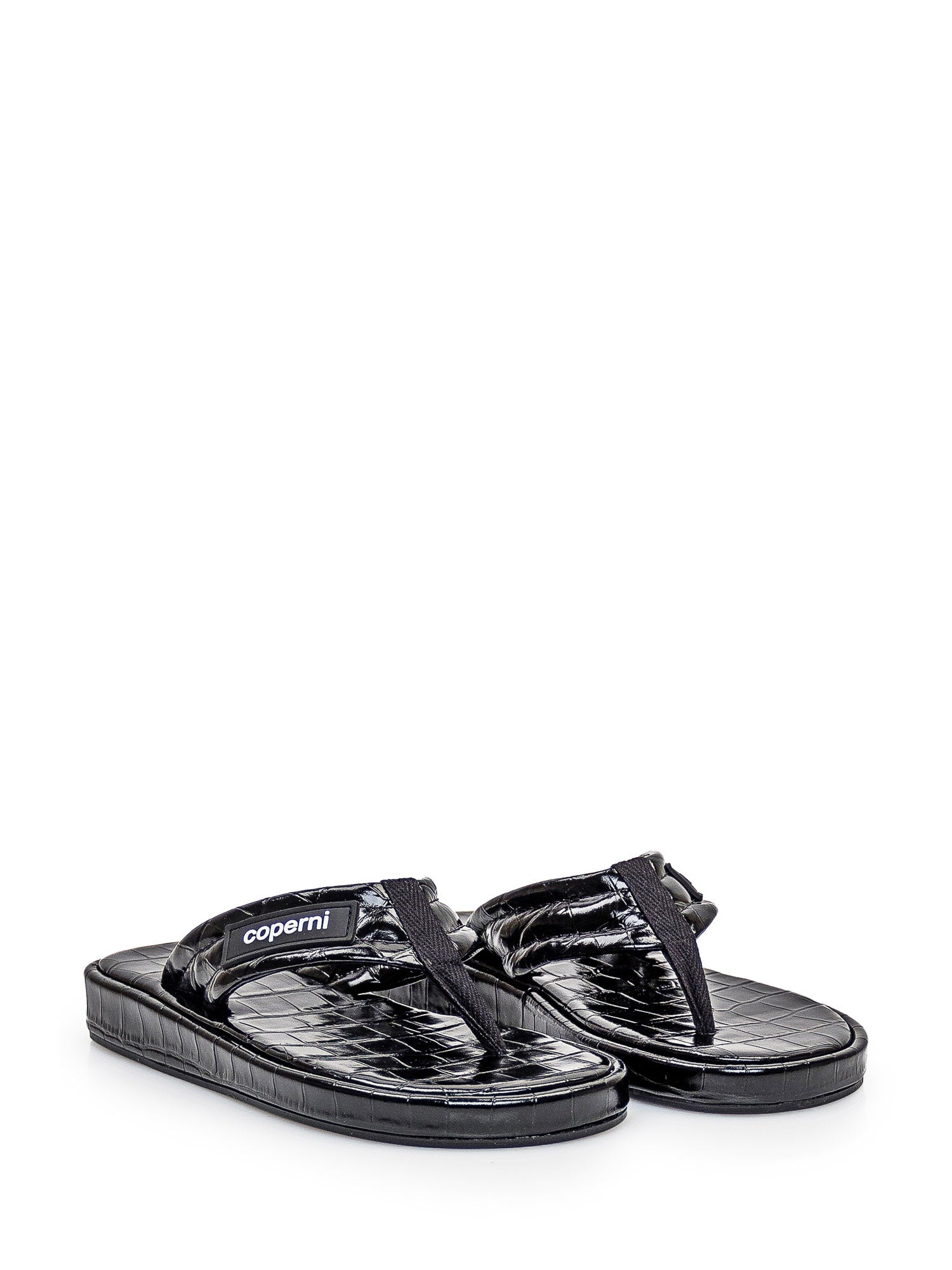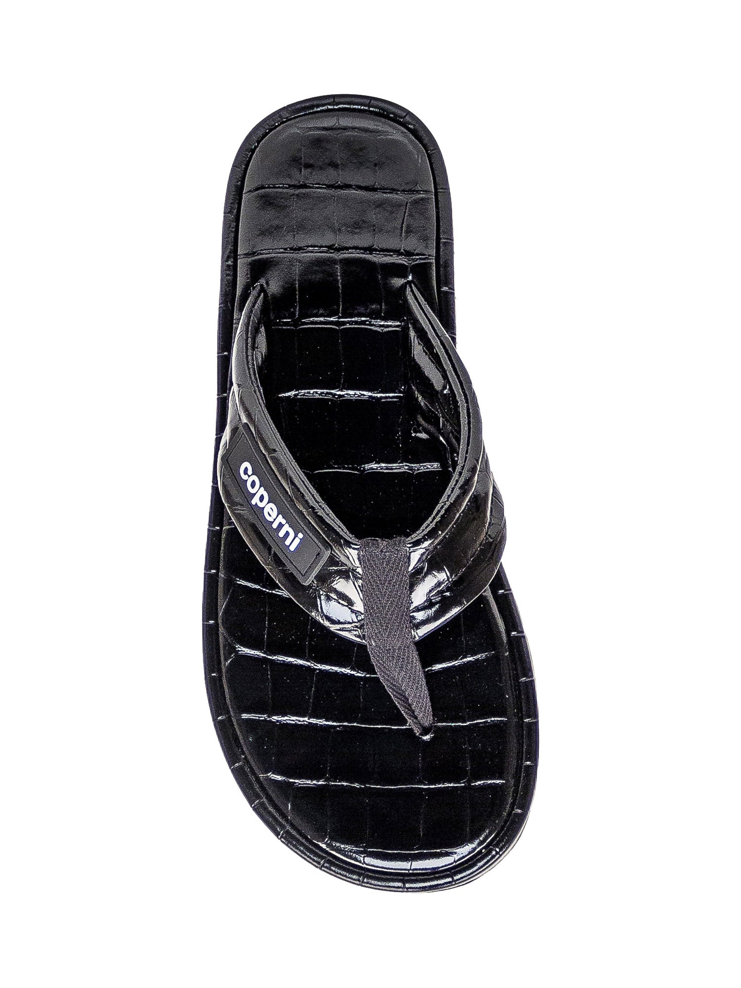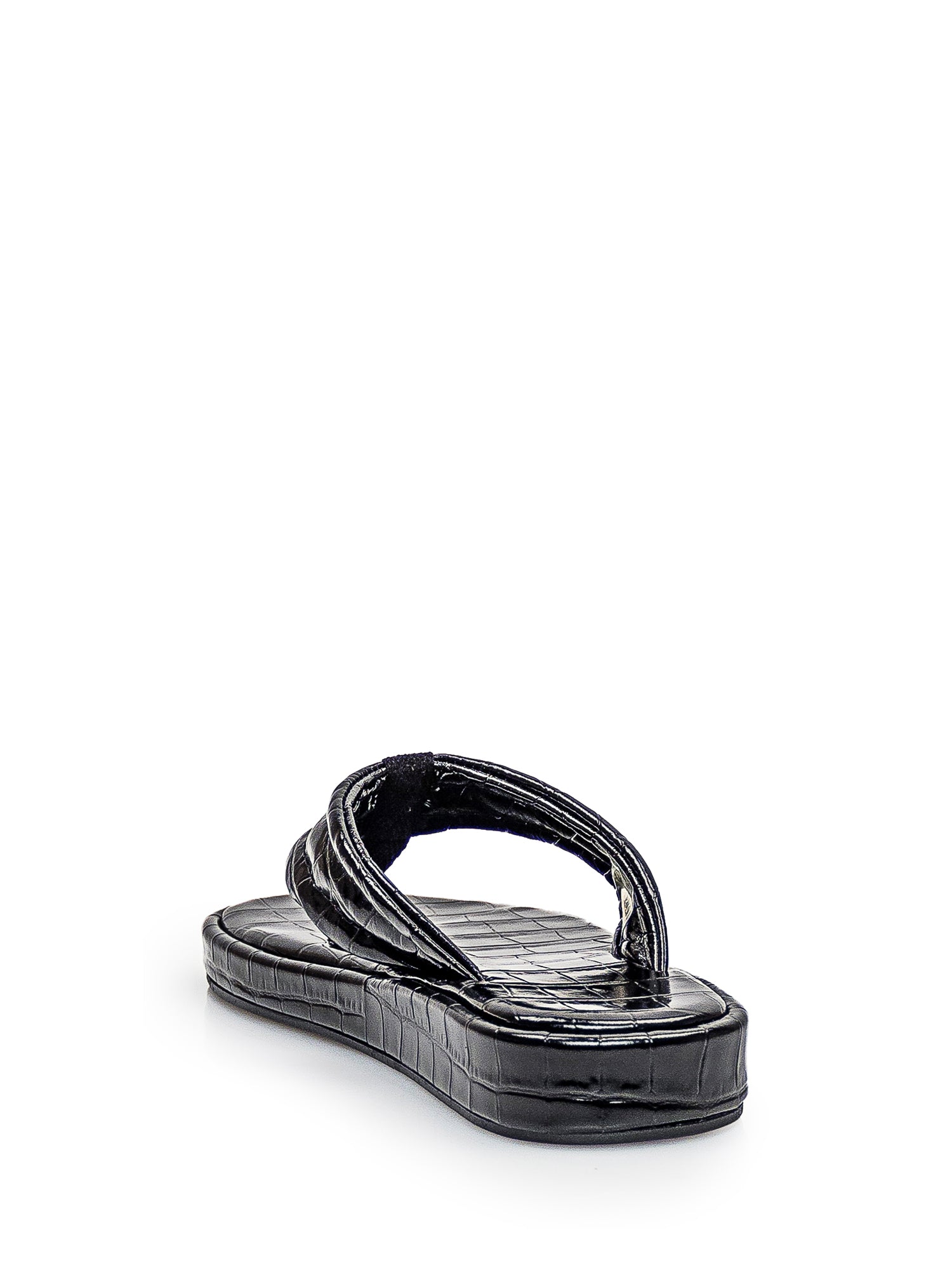 Flats black leather with crocodile pattern. Slip-on. Rubber logo patch on the front.