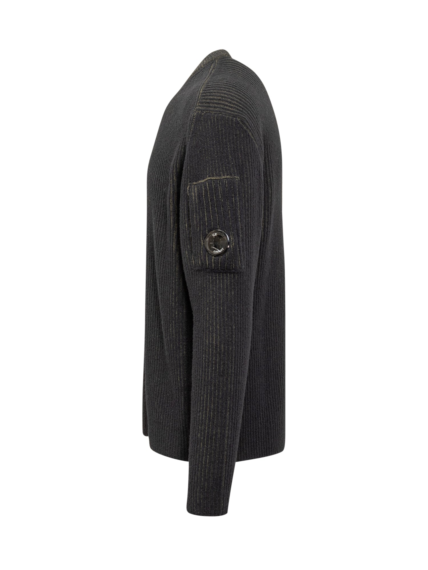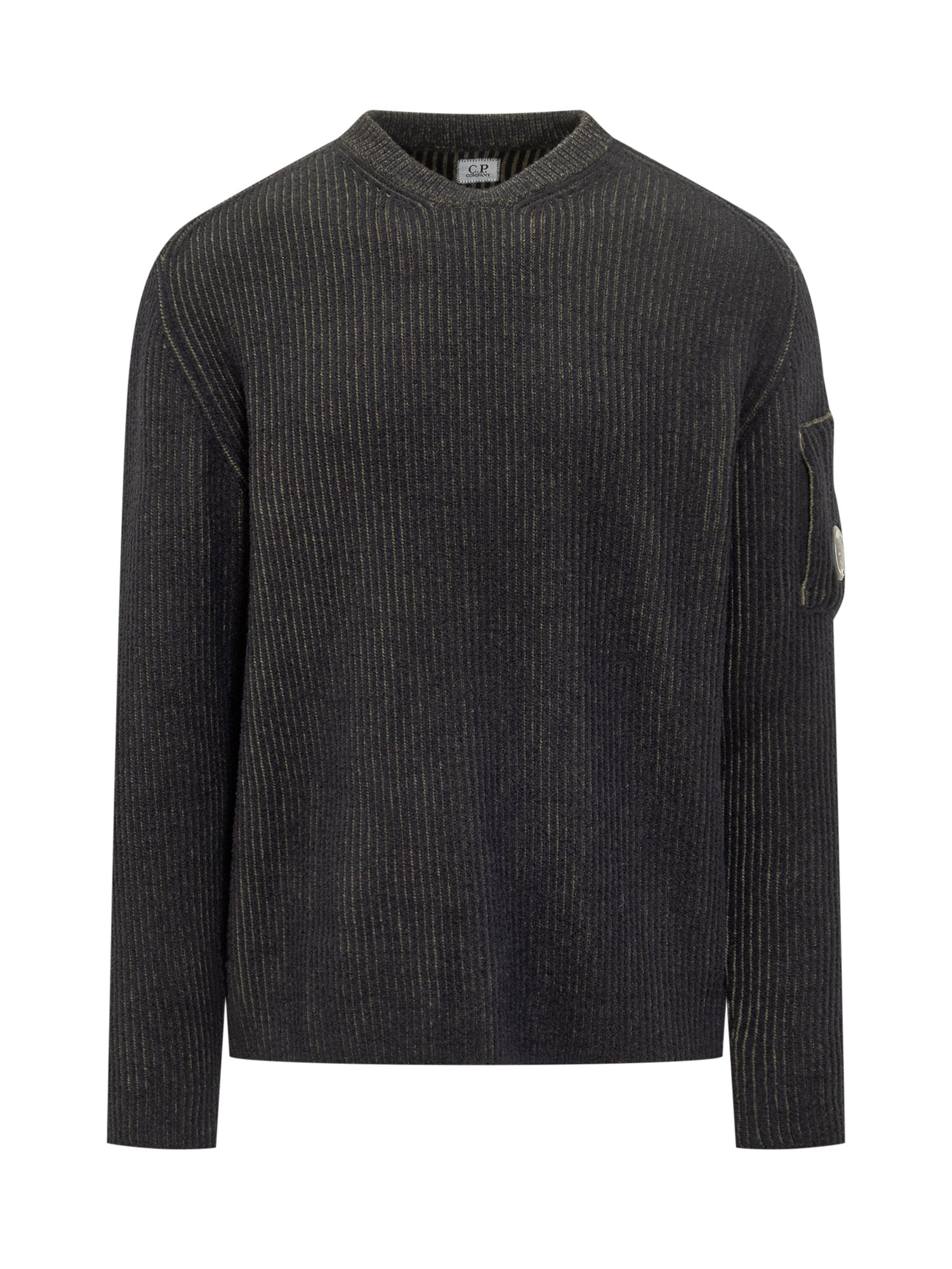 C.P. Company wool-blend ribbed sweater featuring a sleeve pocket with the signature lens detail.