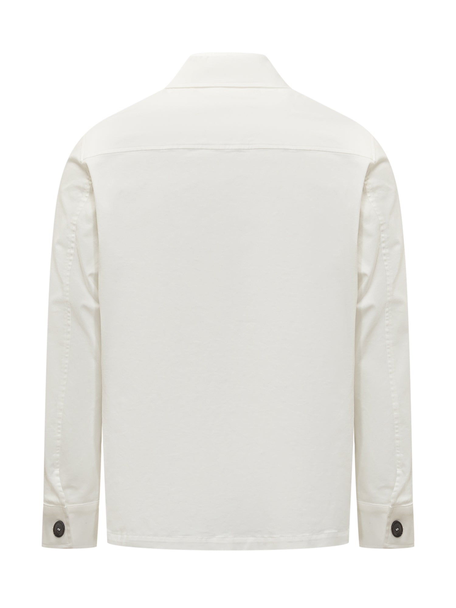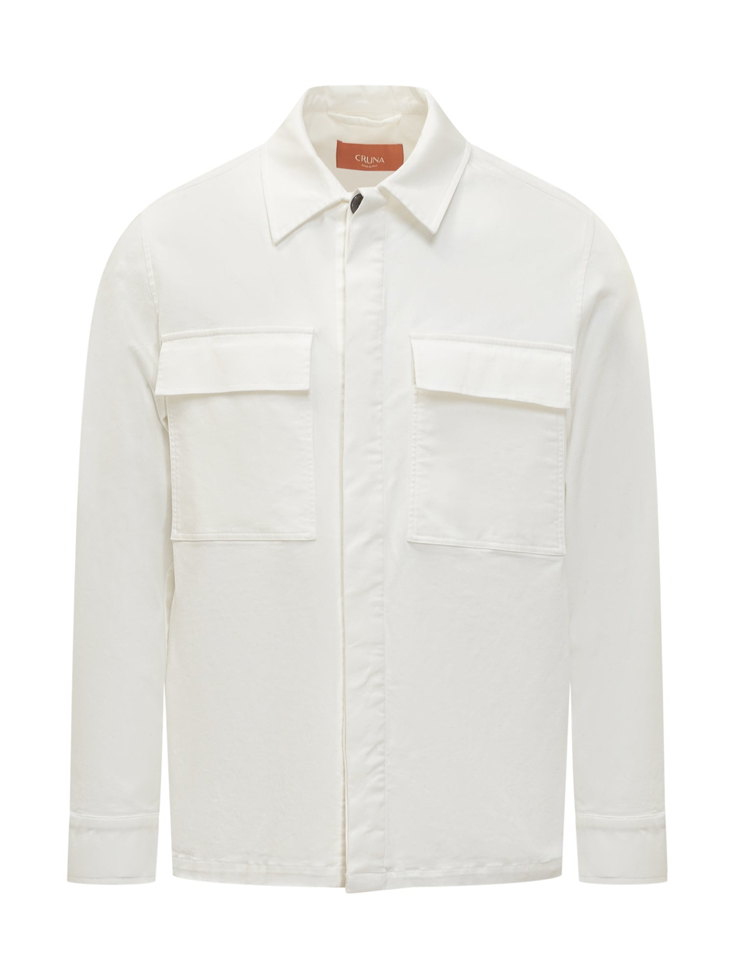 Cruna white cotton shirt with front pockets and hidden closure. Clean, modern design.