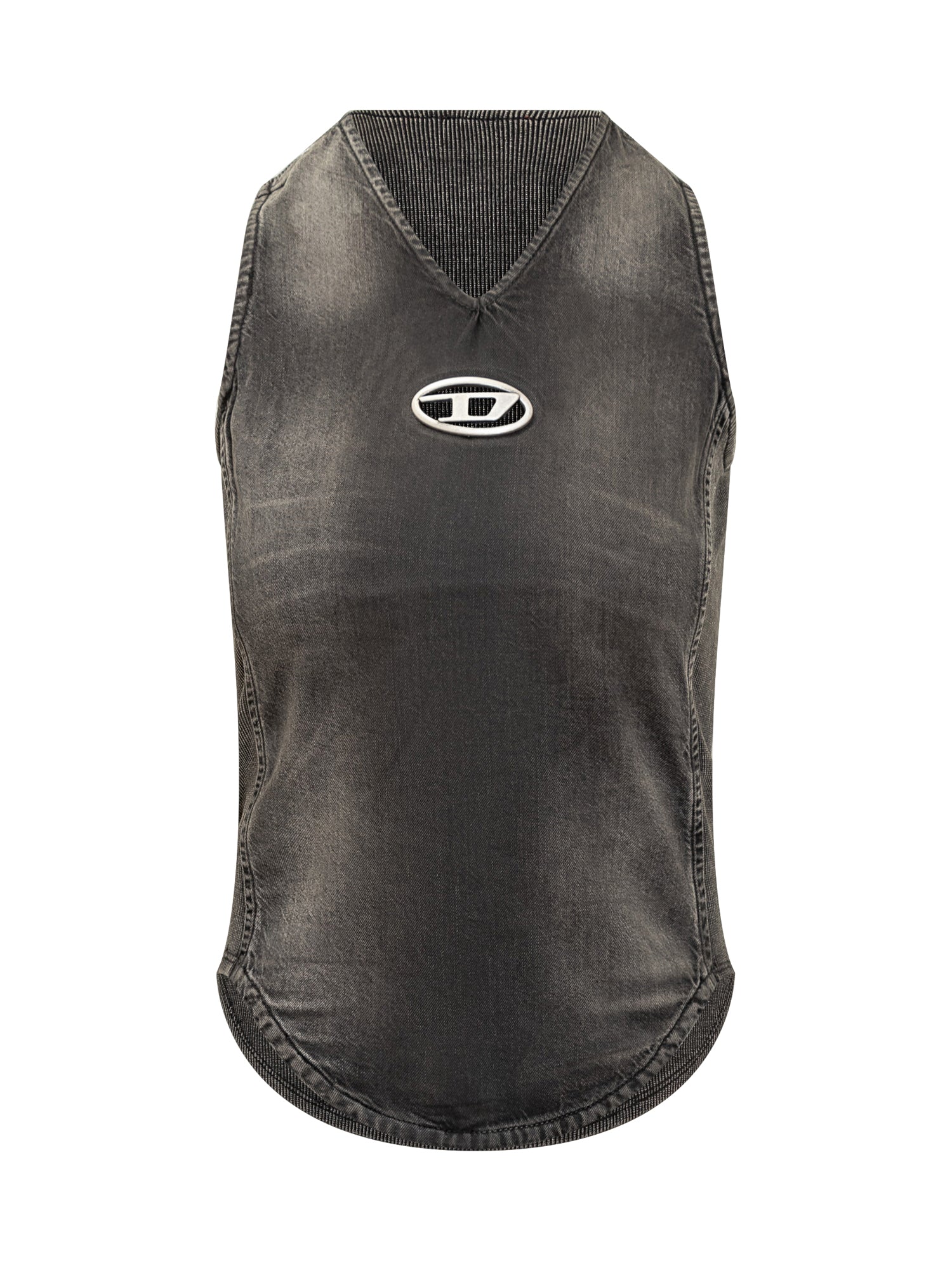 Diesel black denim top with vintage effect, V-neckline and front metal logo.