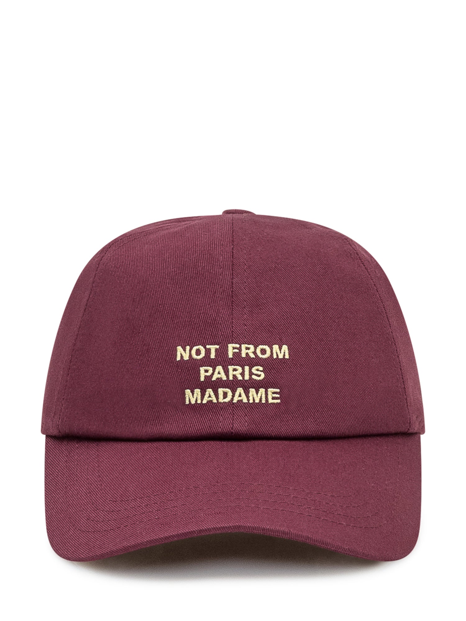 Bordeaux cap by Drôle de Monsieur featuring curved visor and Not From Paris Madame embroidery.