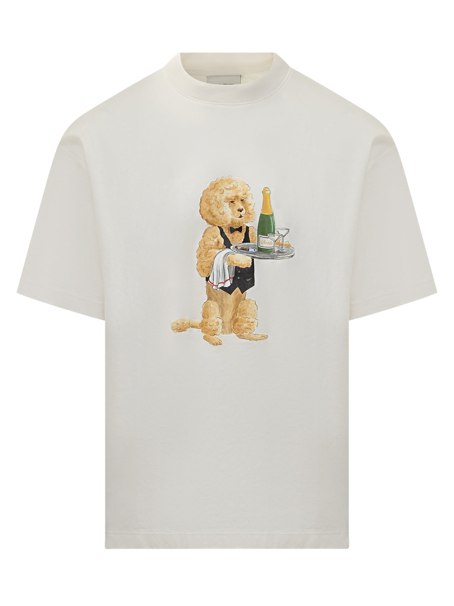 Drole de Monsieur white cotton T-shirt with playful dog waiter graphic on the front.