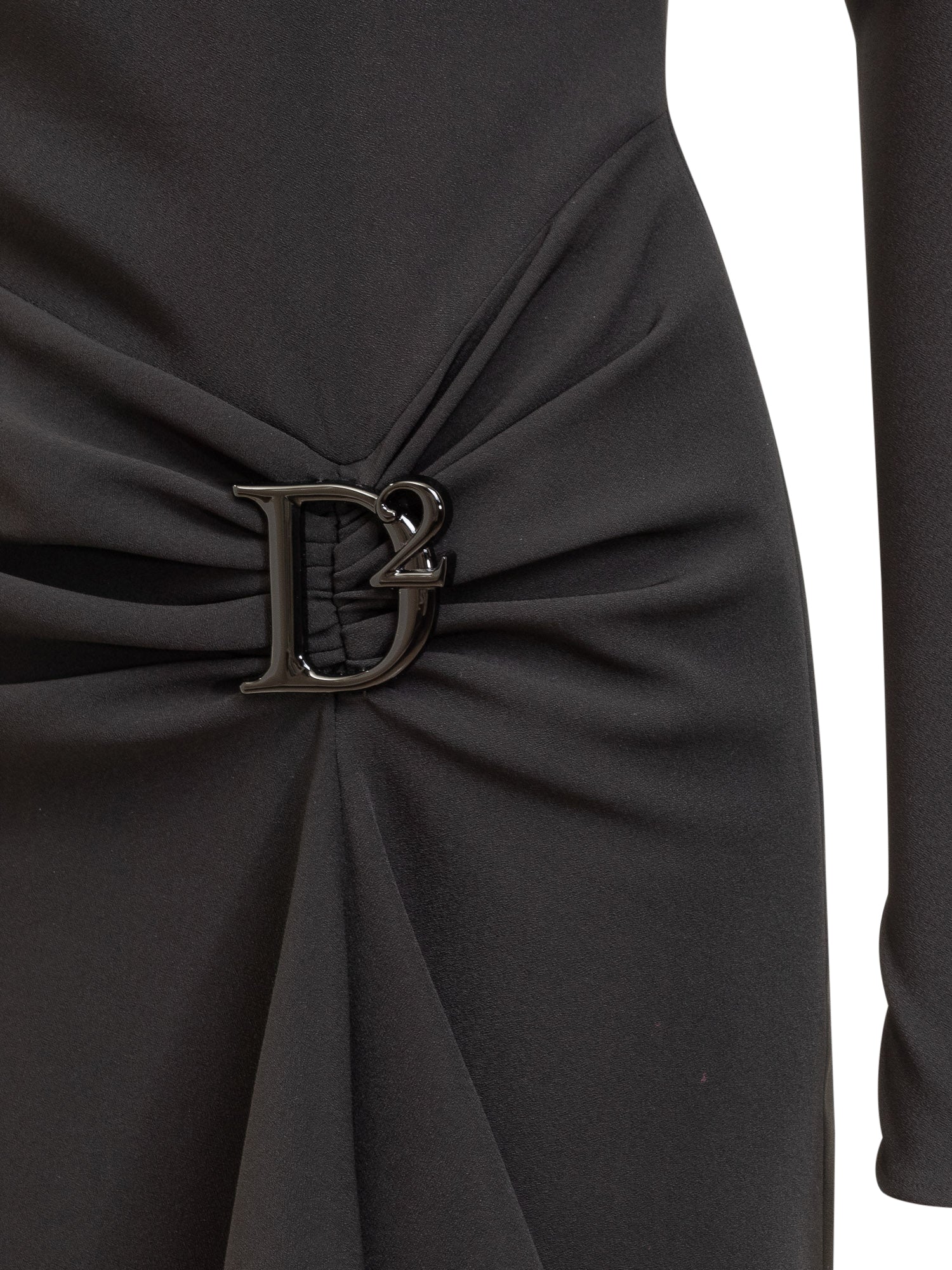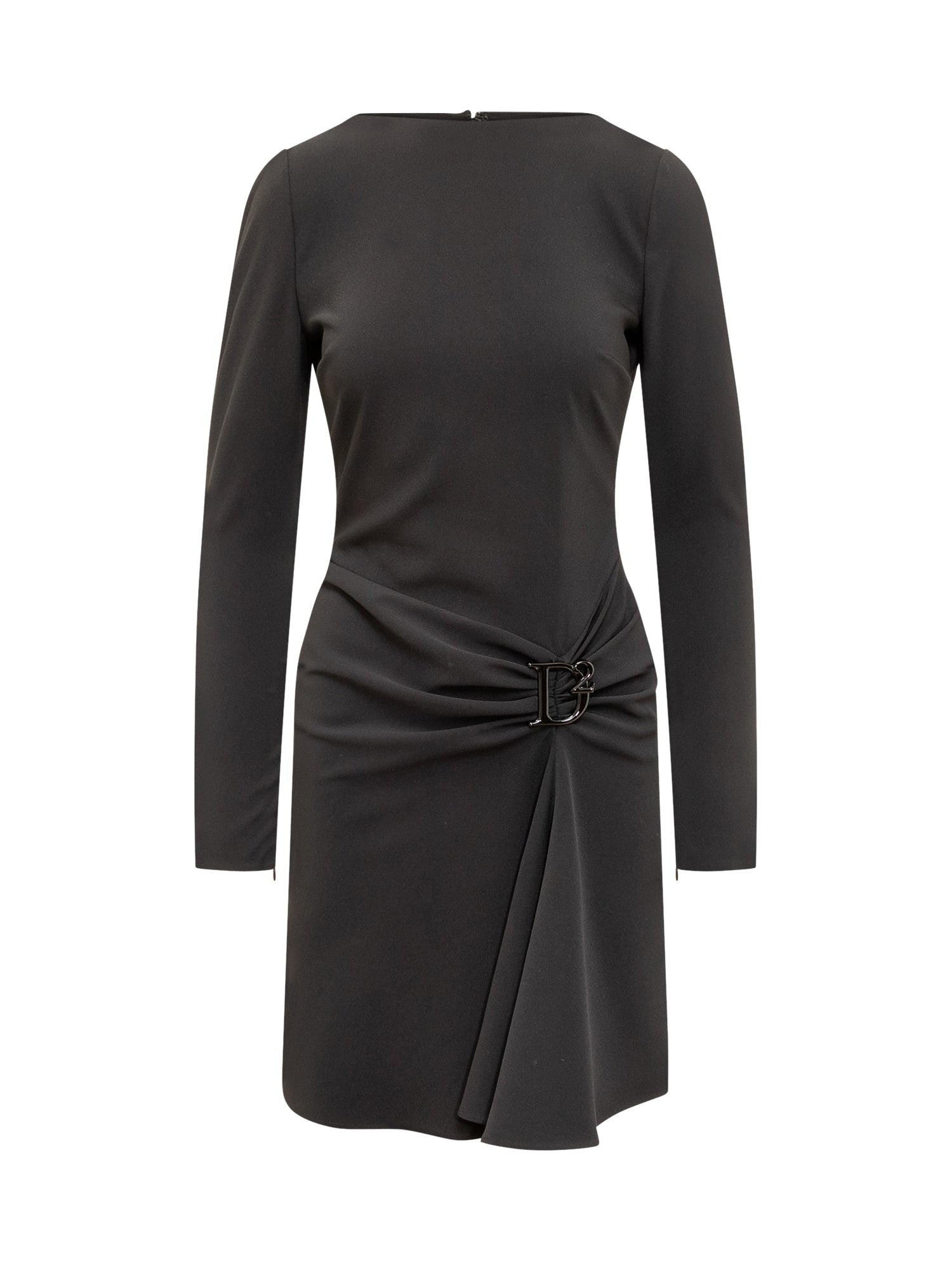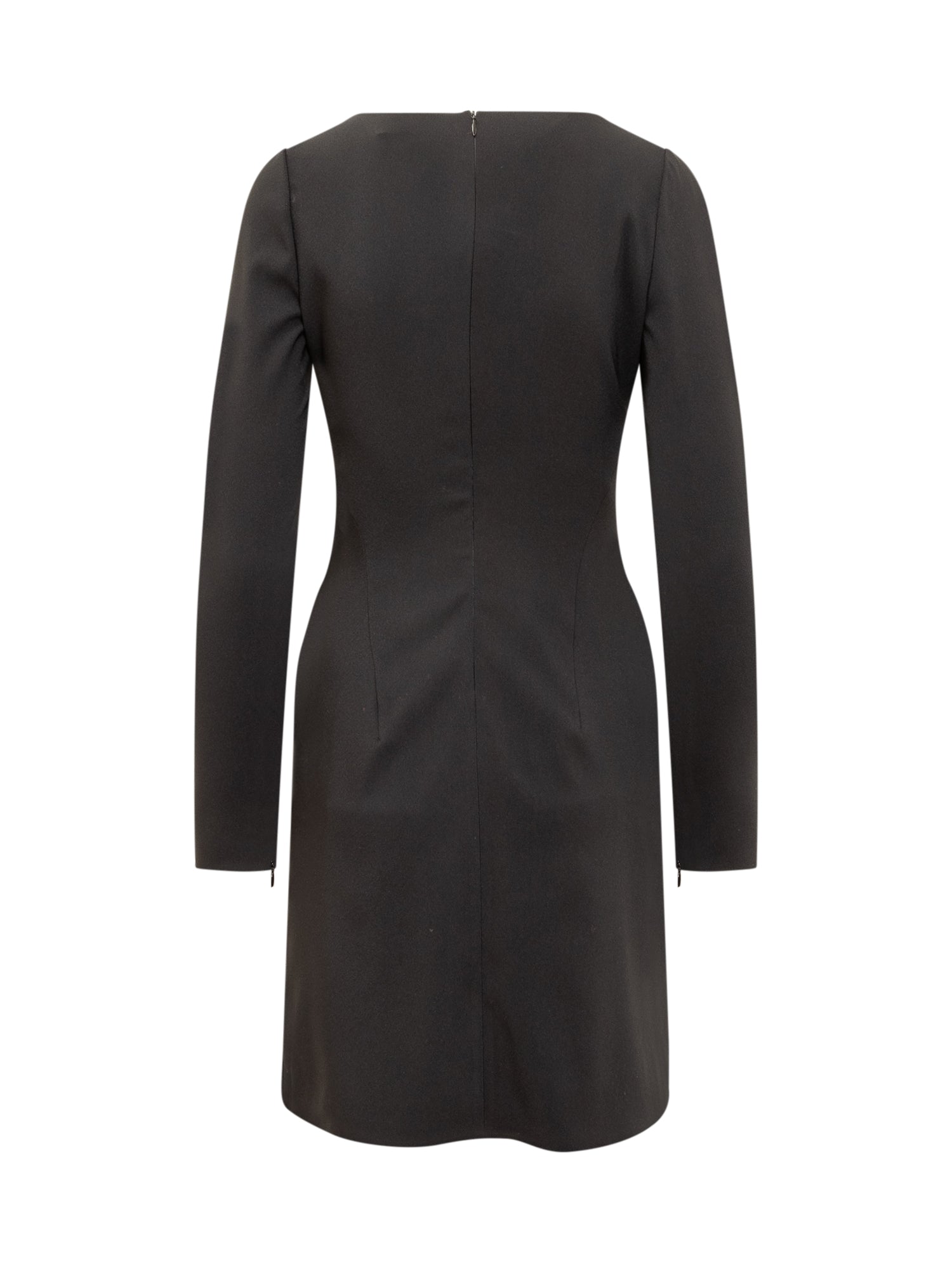 Short dress. Long sleeves. Zip closure on the back. Metal logo with drapery on the front.