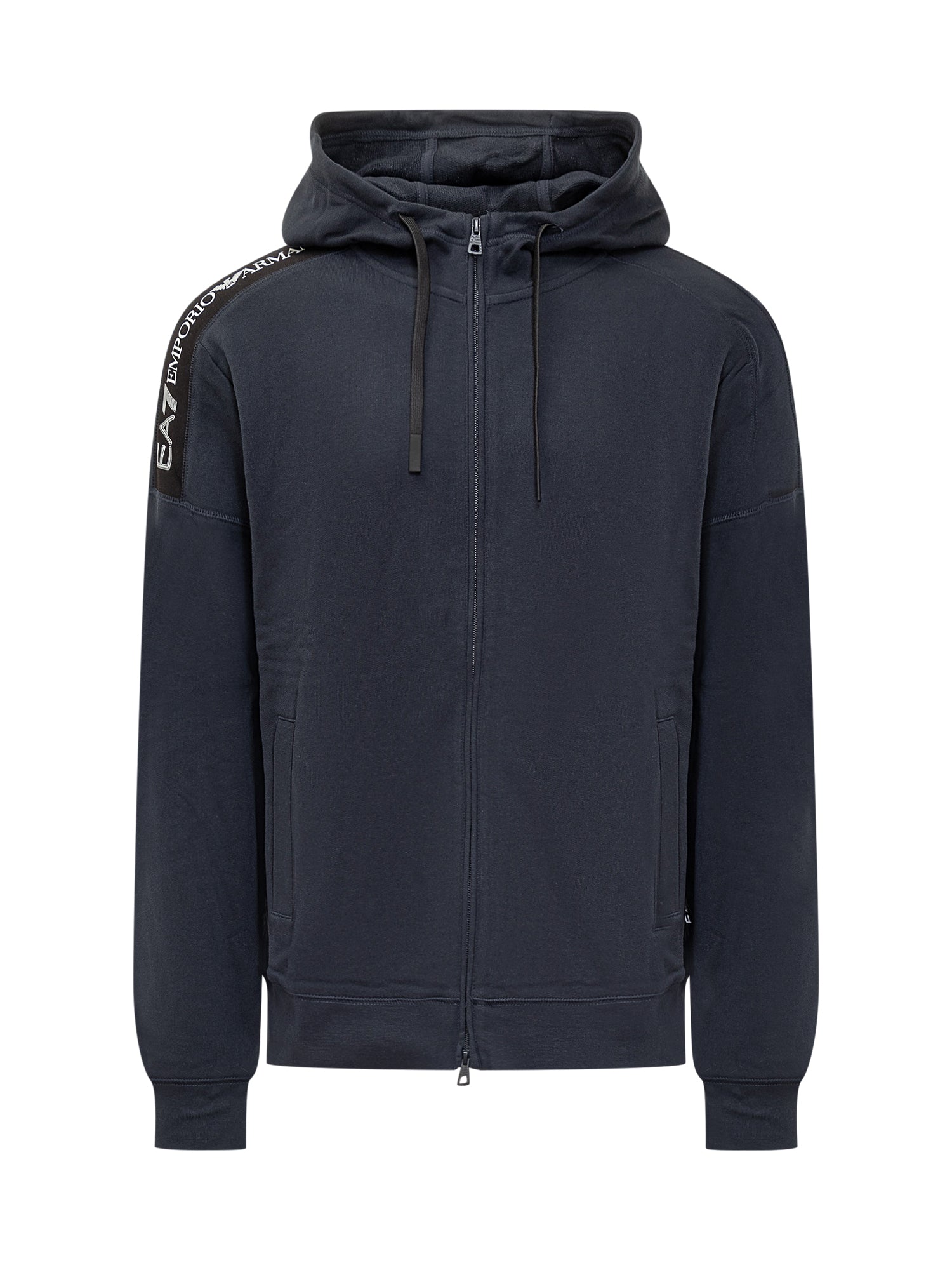 Sweatshirt with hood and drawstring. Zipper closure. Elasticized hems. Two pockets. Logo on front.