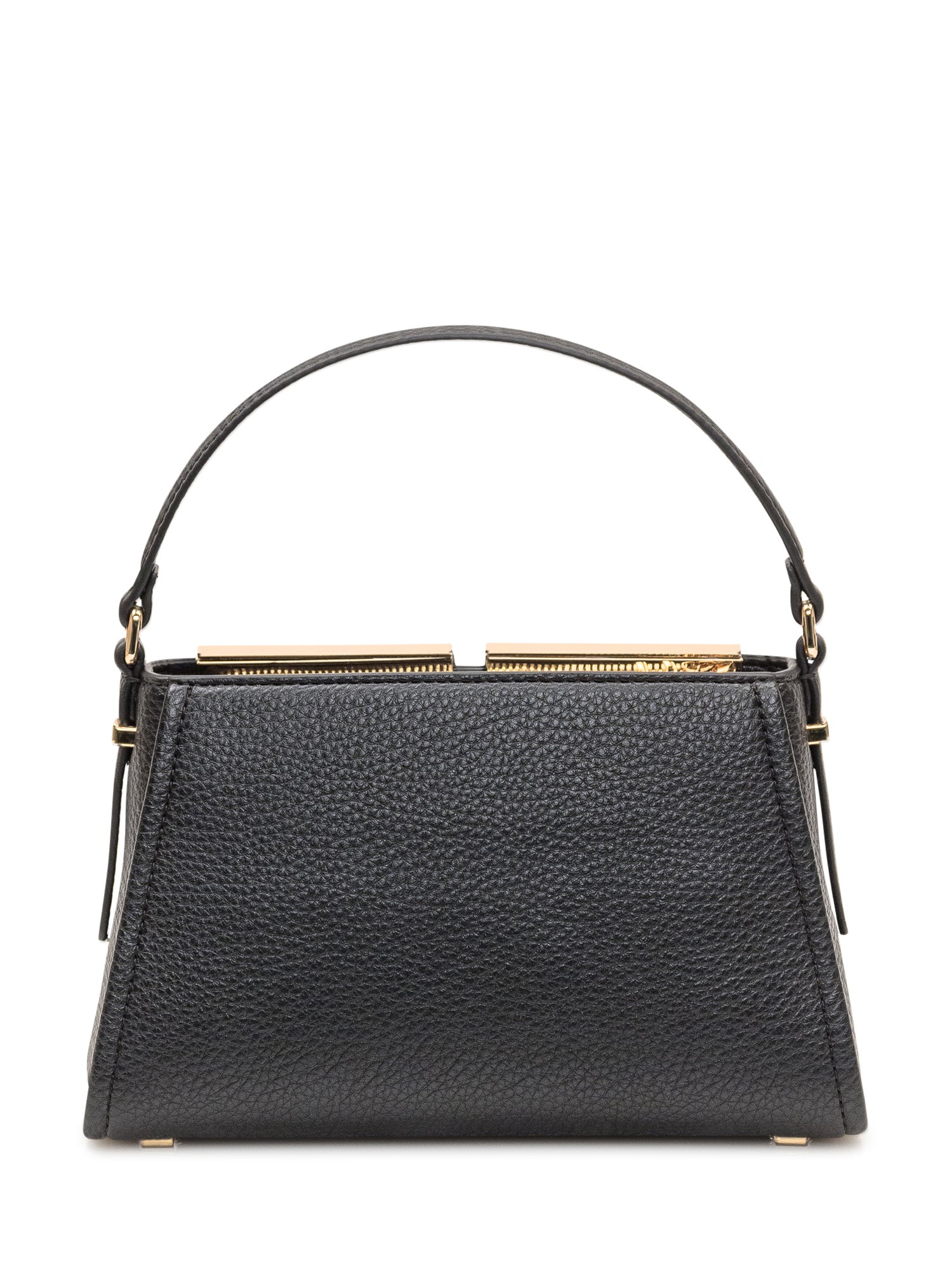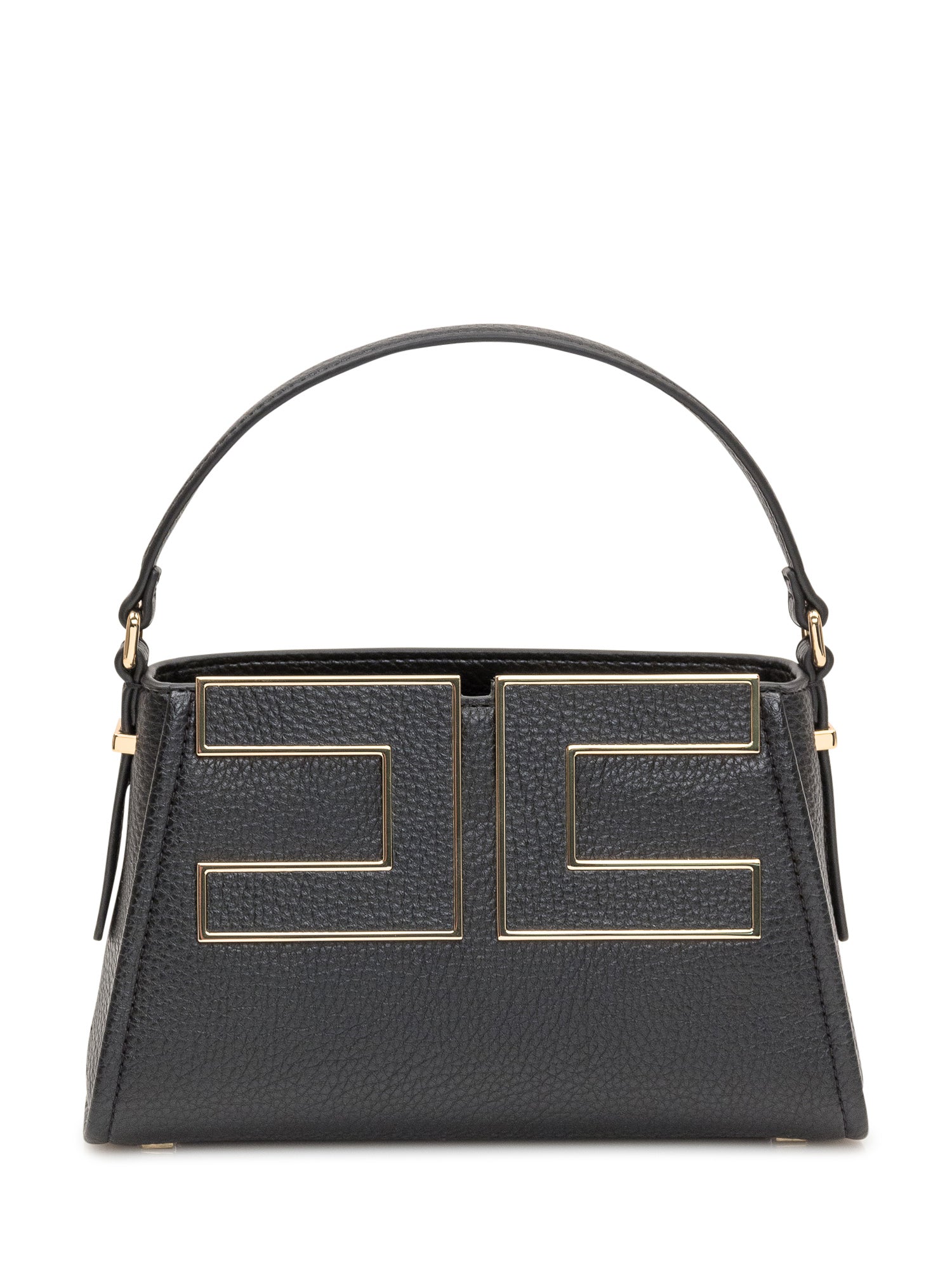 Elisabetta Franchi handbag in black grained leather with bold gold front logo.