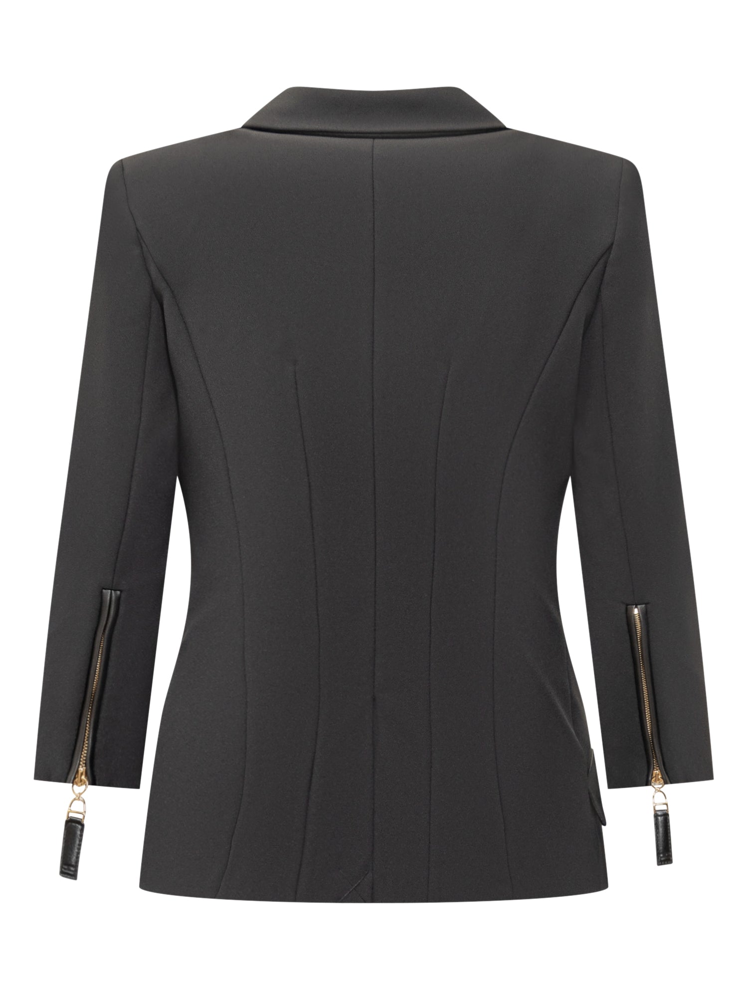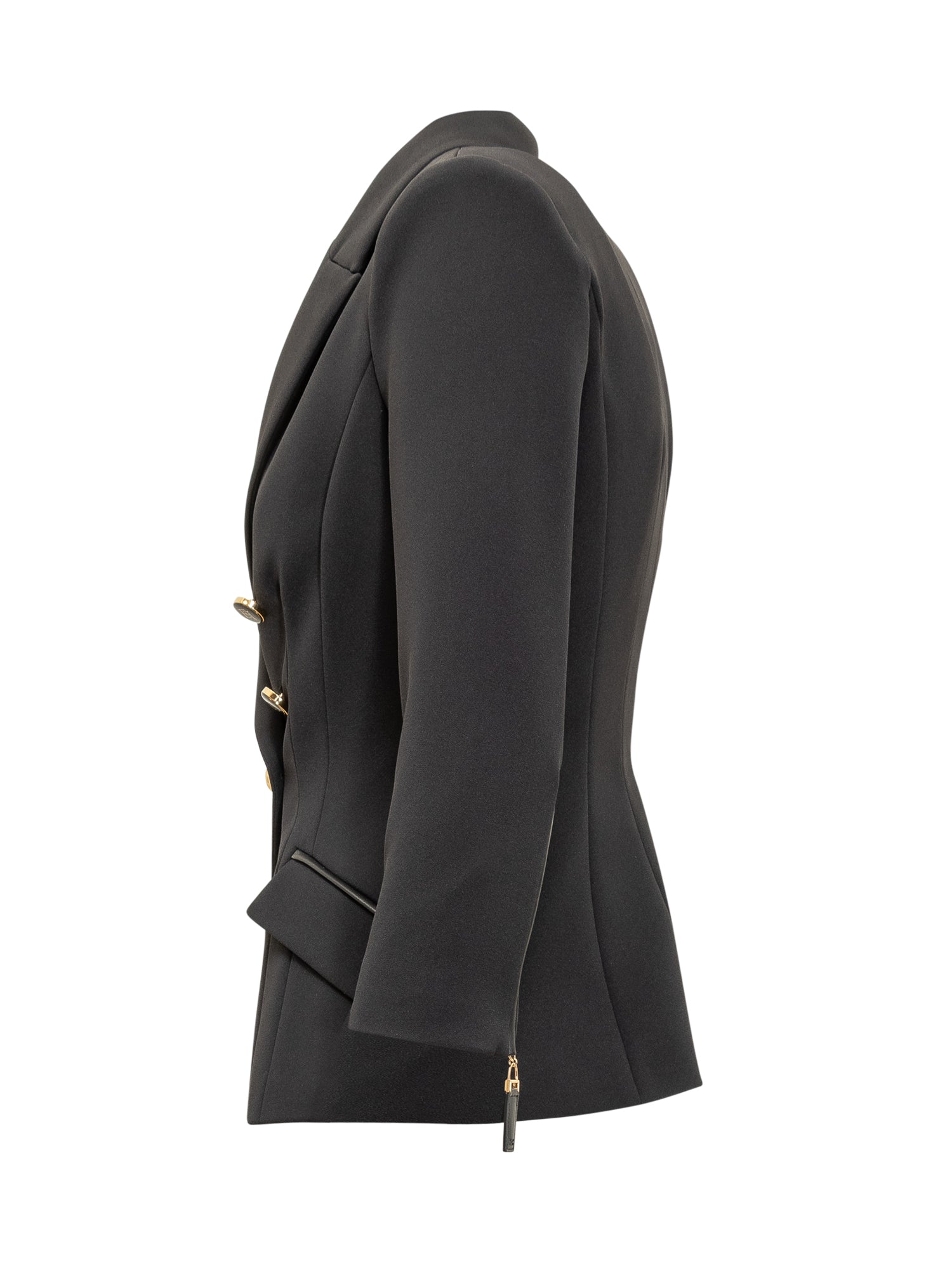 Elisabetta Franchi double-breasted blazer with 3/4 sleeves, gold logo buttons, and inner chain.