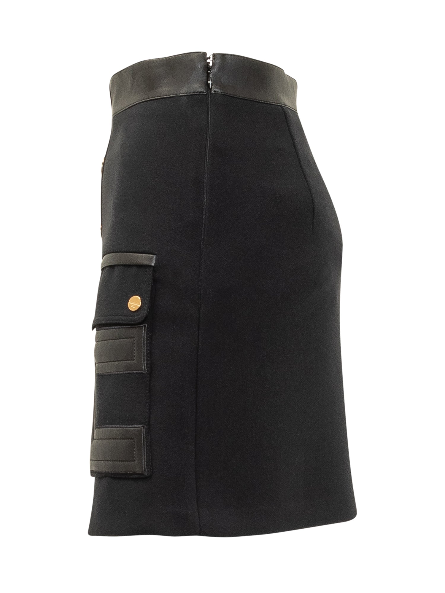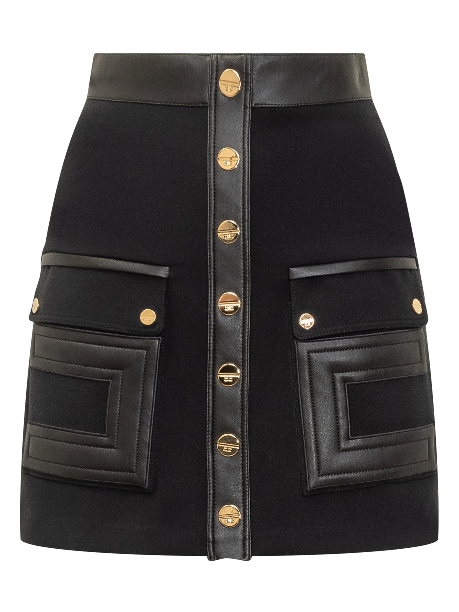 Short black Elisabetta Franchi skirt with high waist, gold buttons, faux leather pockets and zip and hook closure.