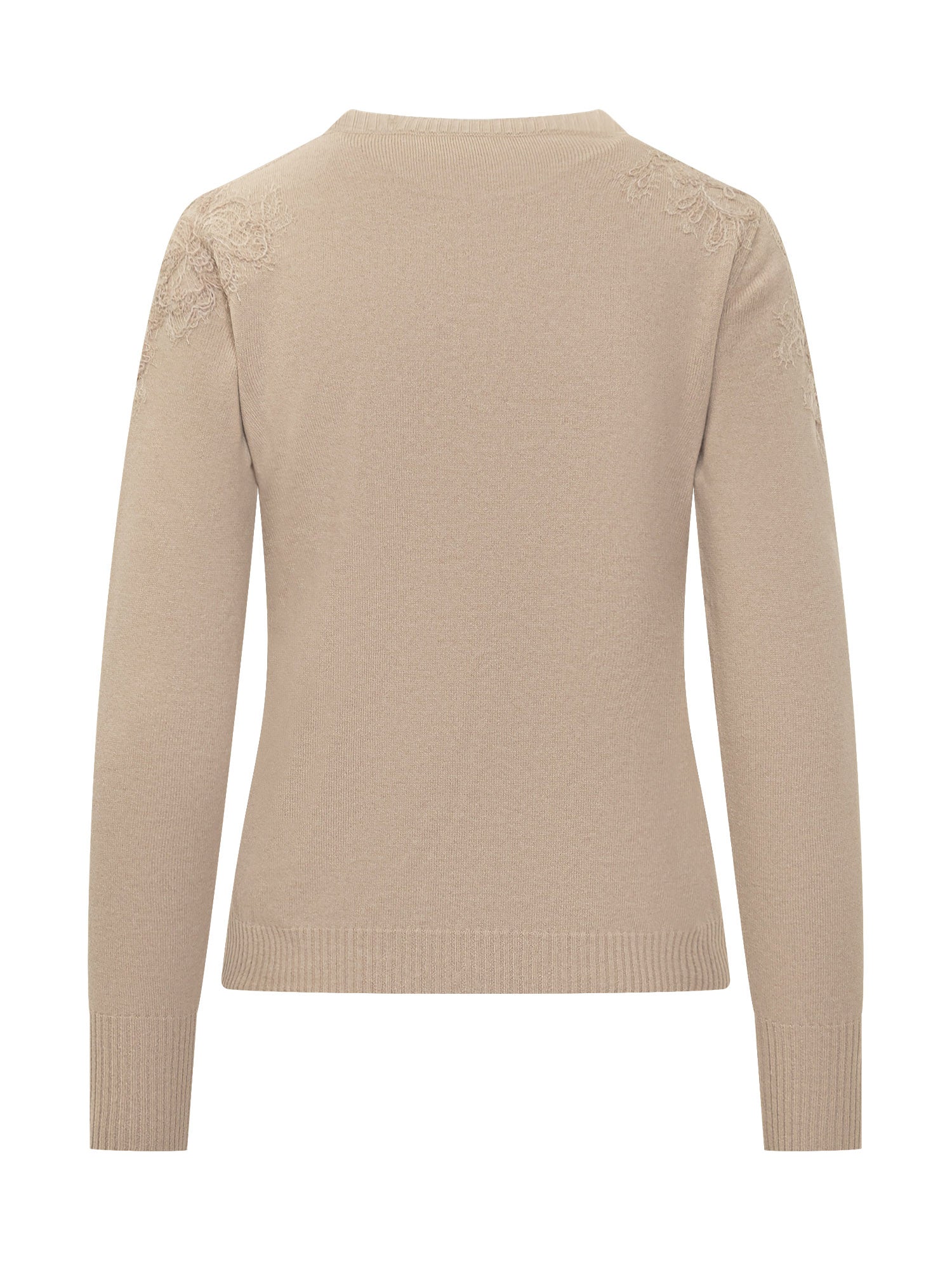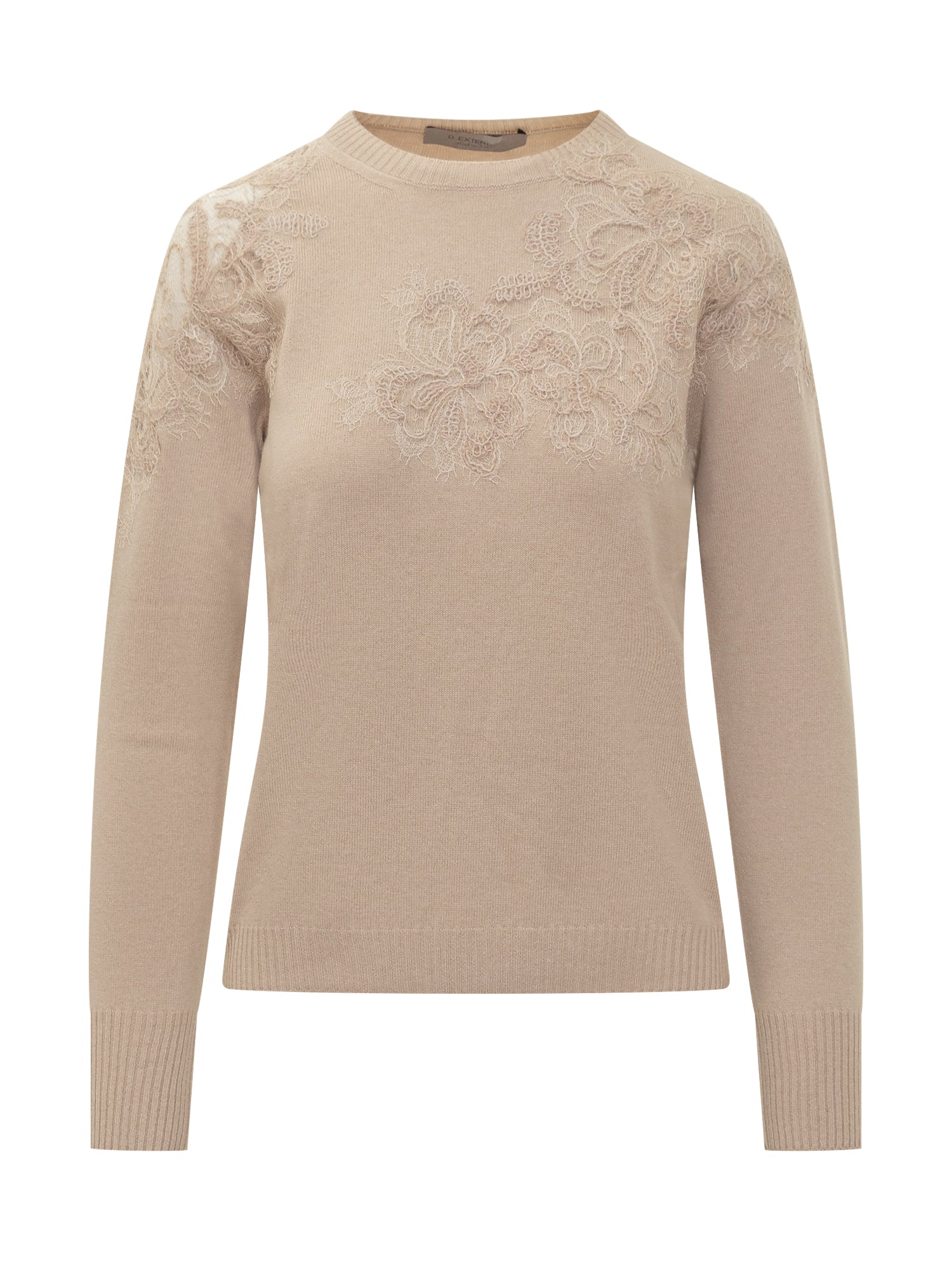 Beige long-sleeve sweater by Exterior with delicate floral lace embroidery on the front and shoulders.