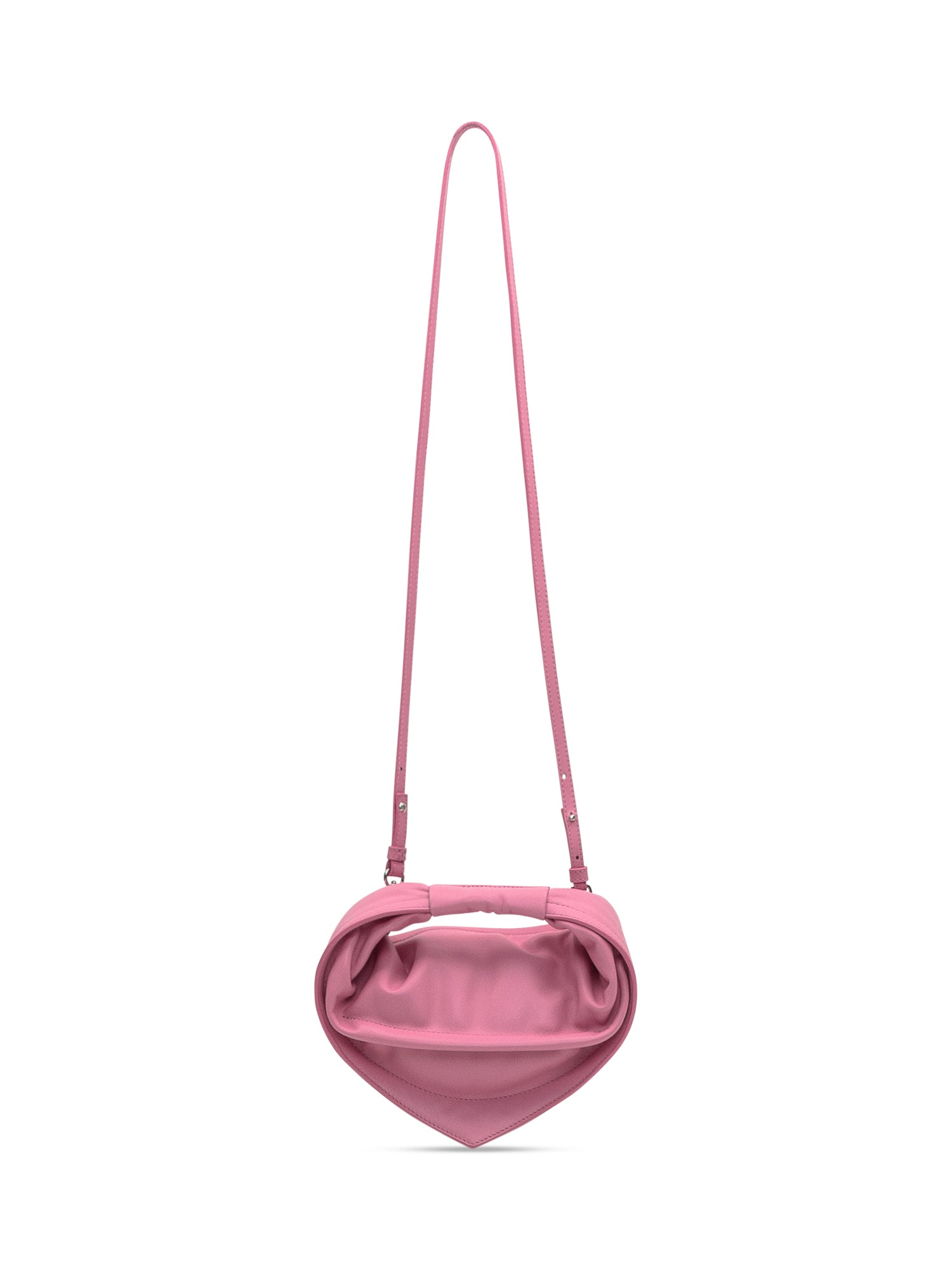 Pink leather bag. A handle. Removable shoulder strap. Closure on the back with zip. Internal padding.