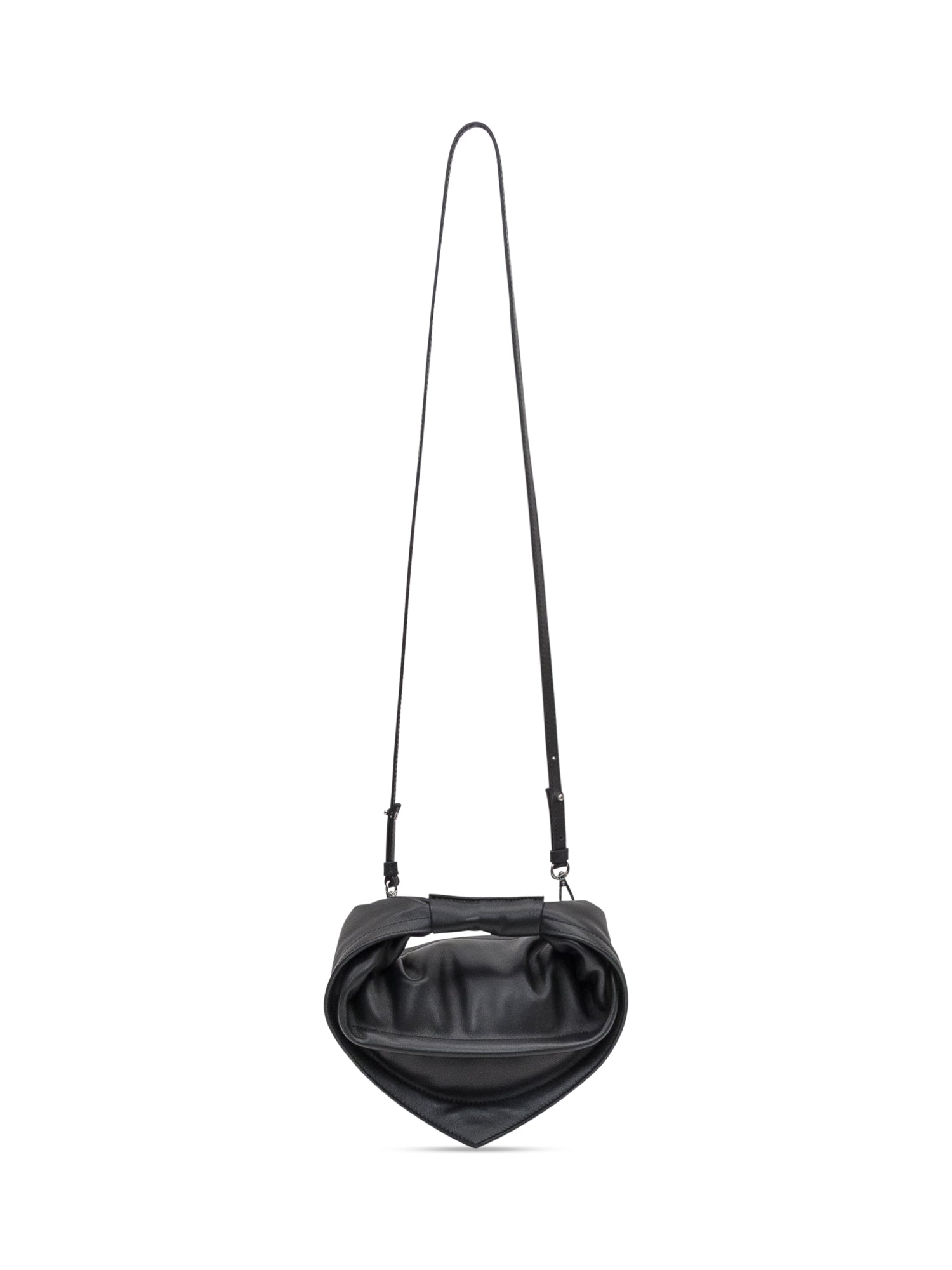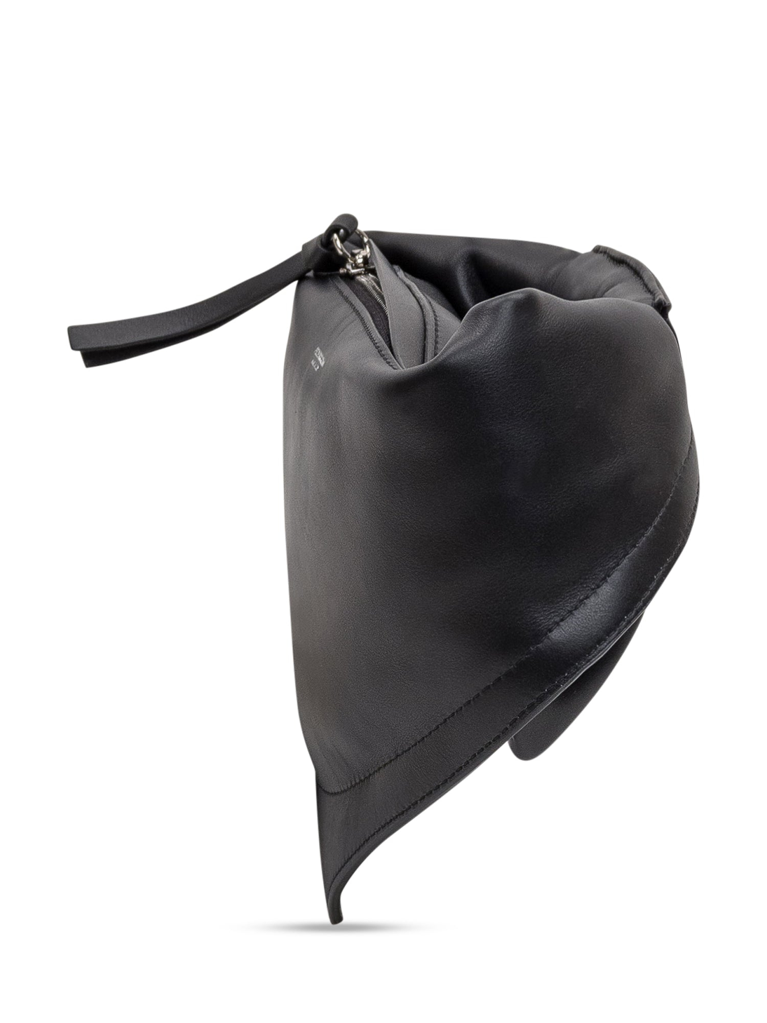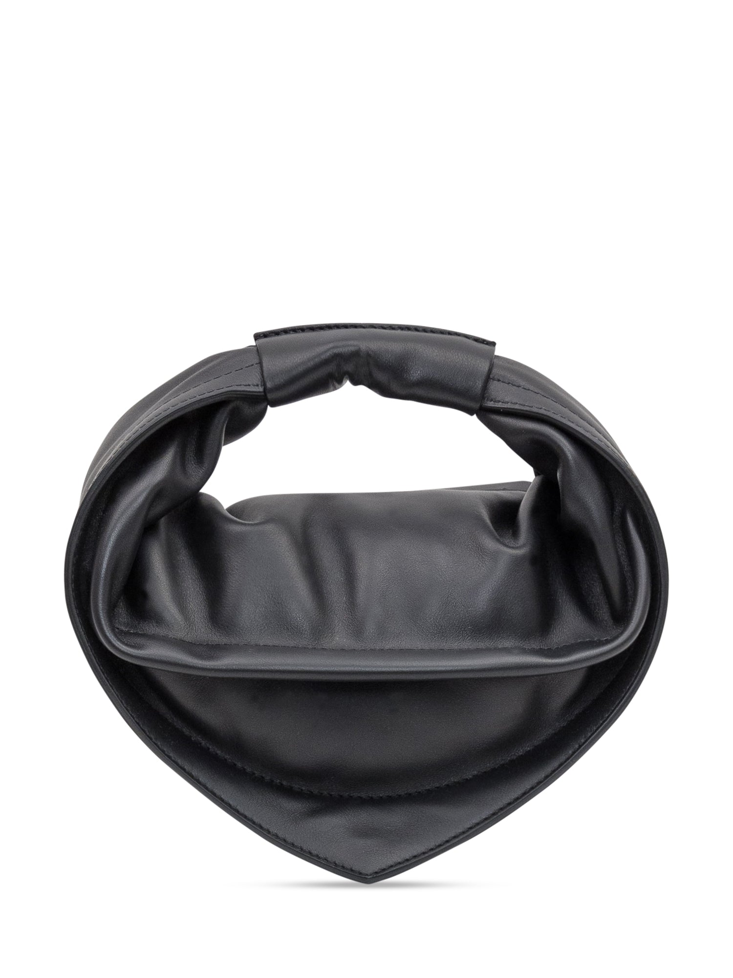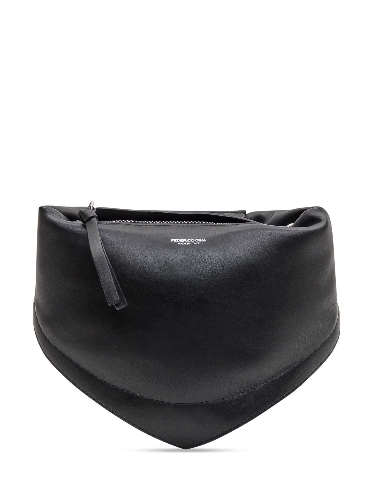 Black leather bag. A handle. Removable shoulder strap. Closure on the back with zip. Internal padding.
