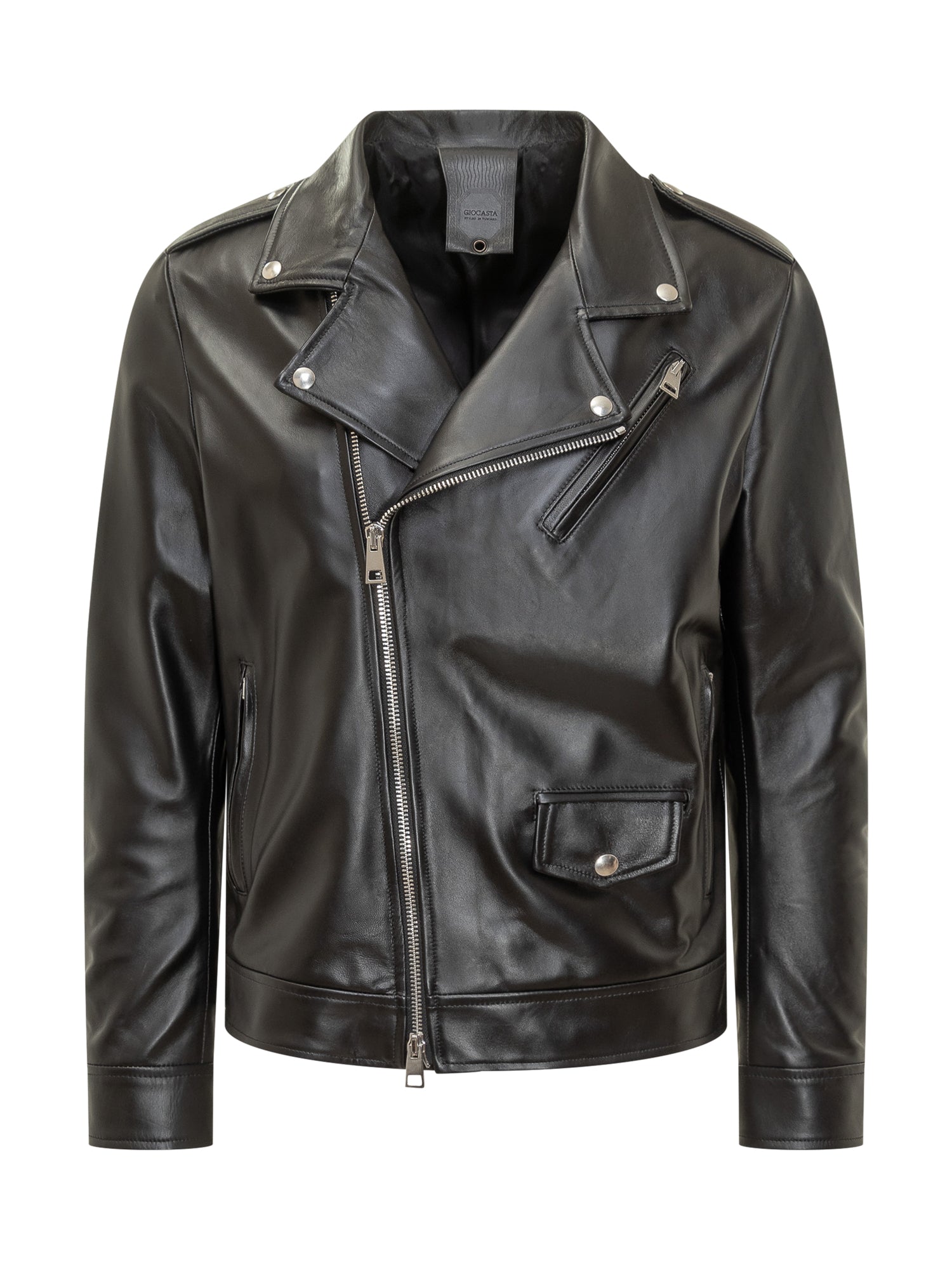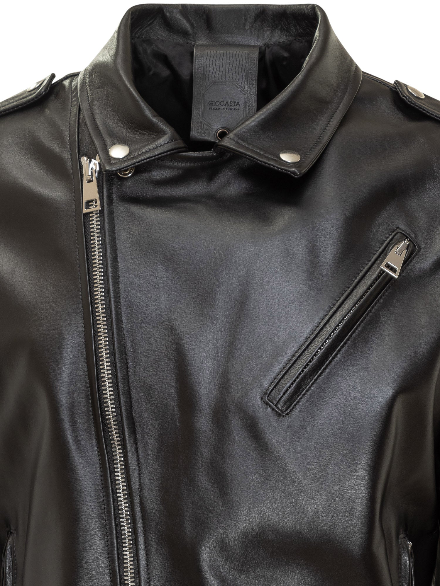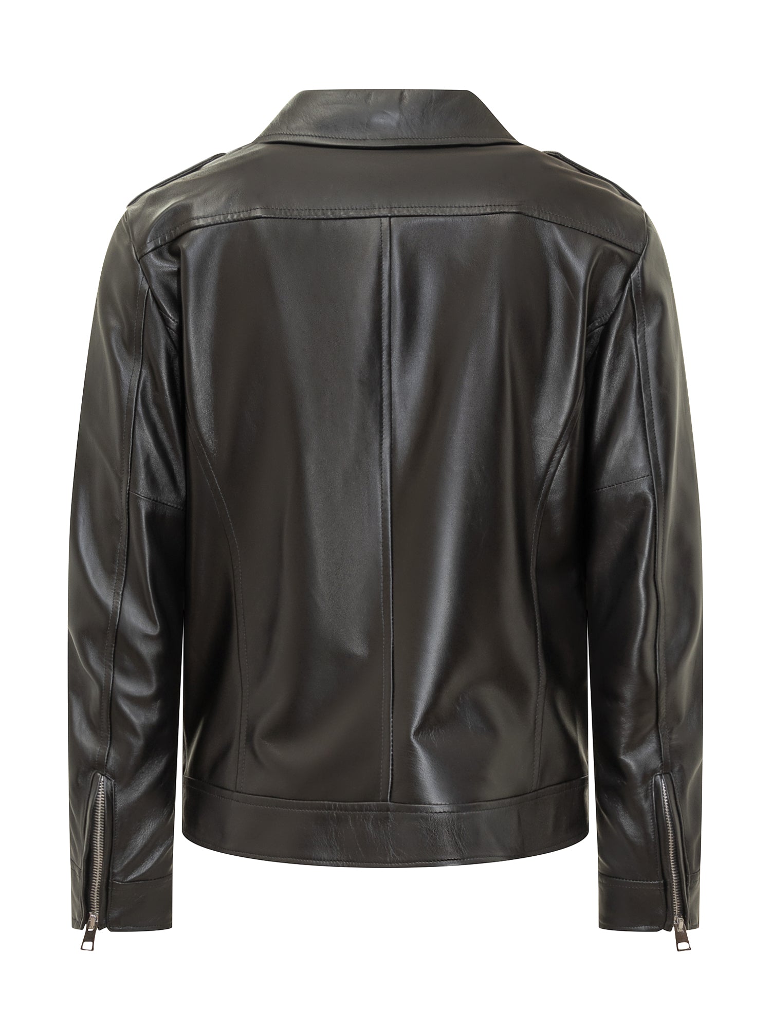 Leather jacket. Chiusurea with zip. Outside pockets. Inside pocket. Cuffs with zip.