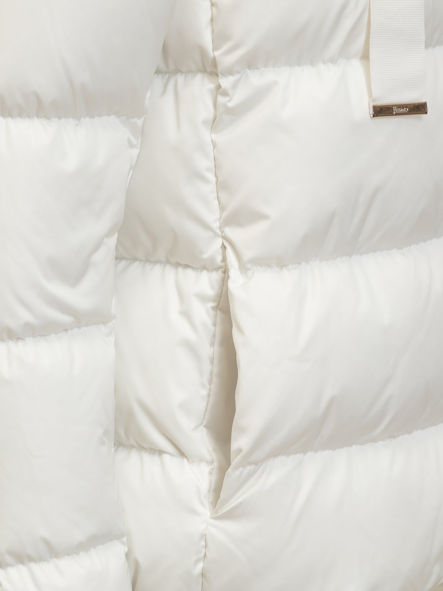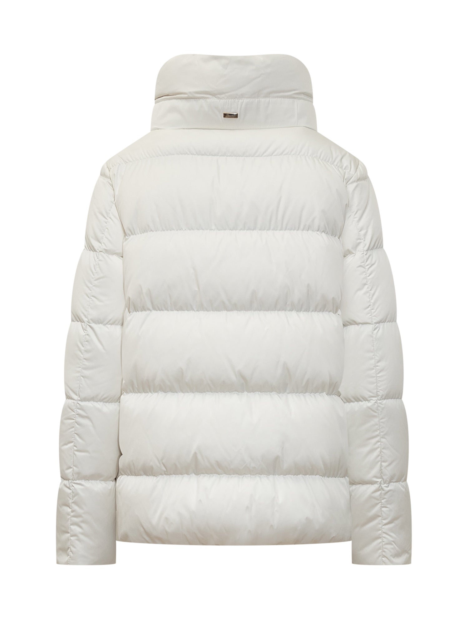 White down jacket with high collar. Drawstring. Side pockets. Logo tag on the back. Closure with buttons. Satin effect.