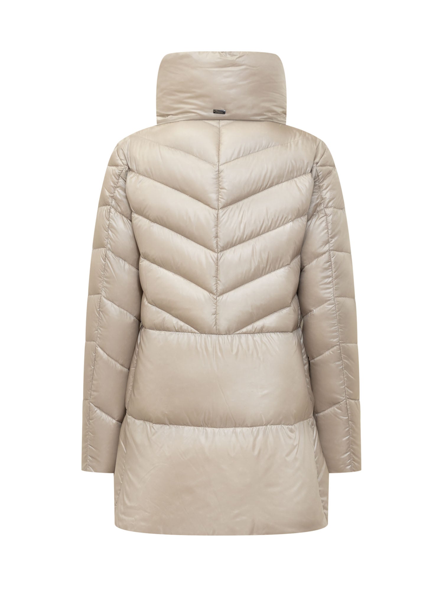 Long-sleeved down jacket. Turtleneck. Zipper closure. Two side pockets.