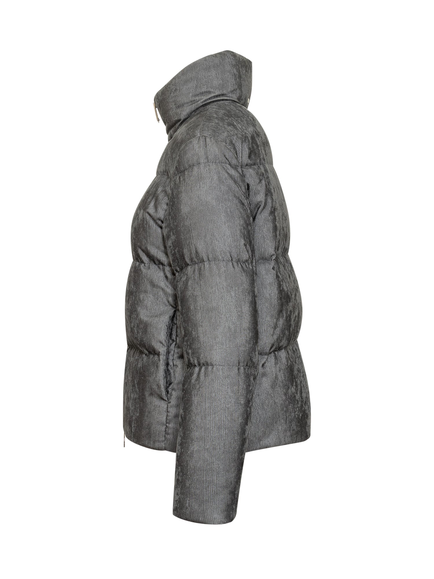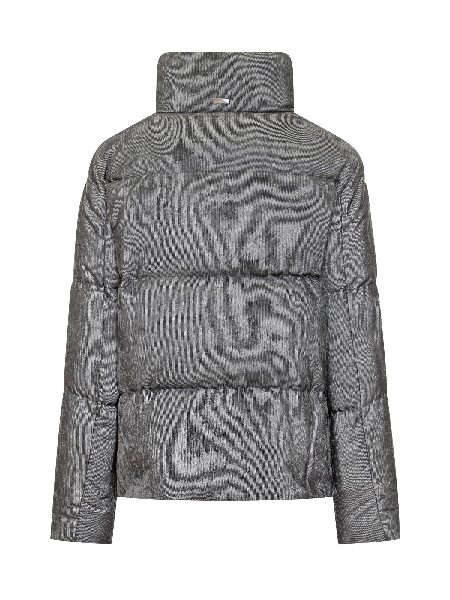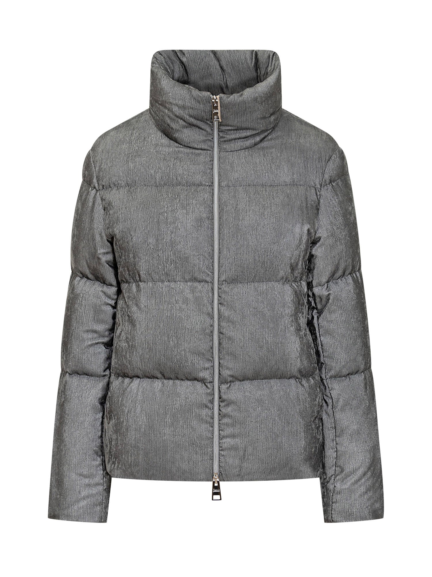Herno women s short down jacket in grey corduroy-effect fabric. High neck, double-slider zip and minimal design.