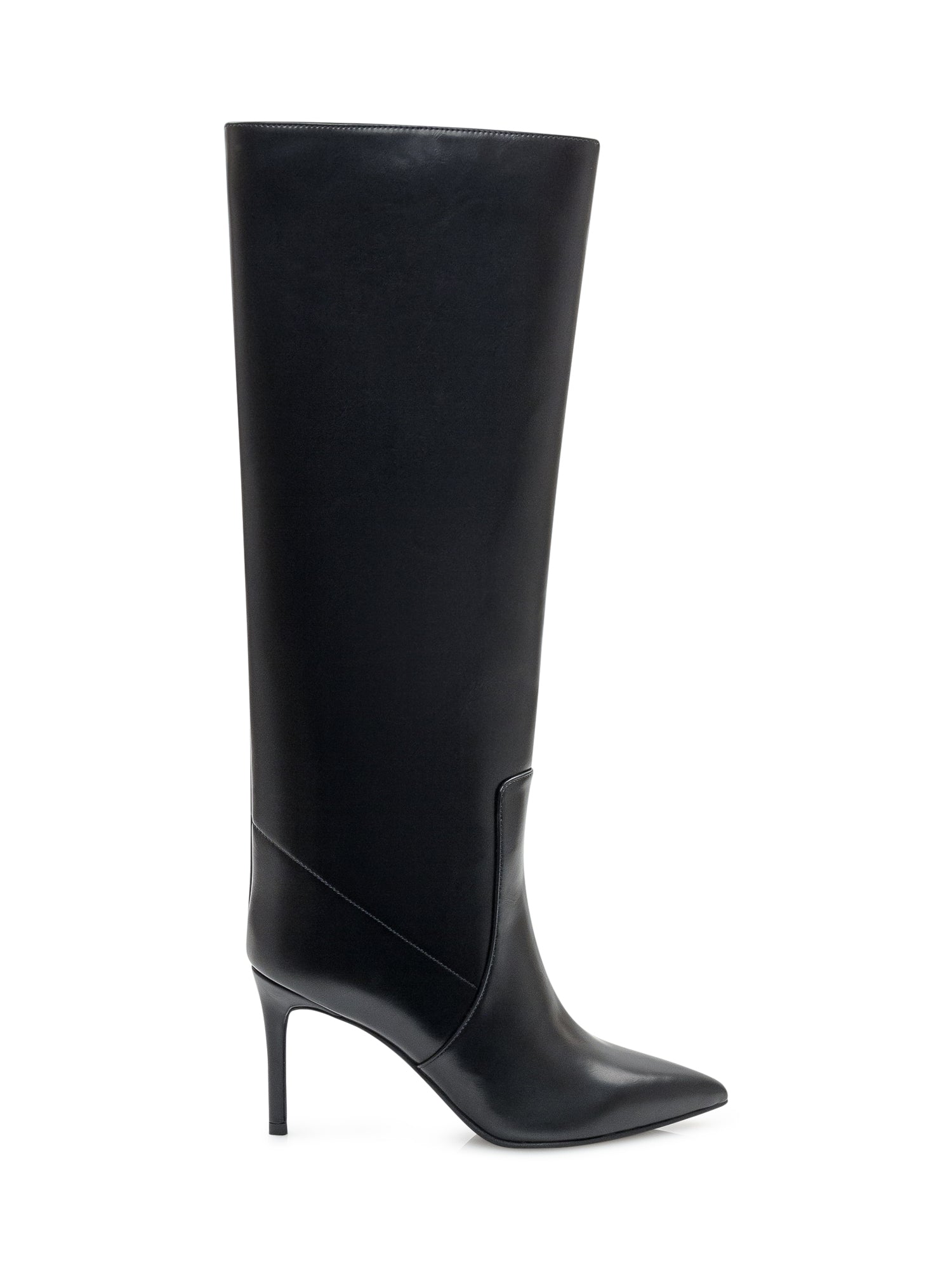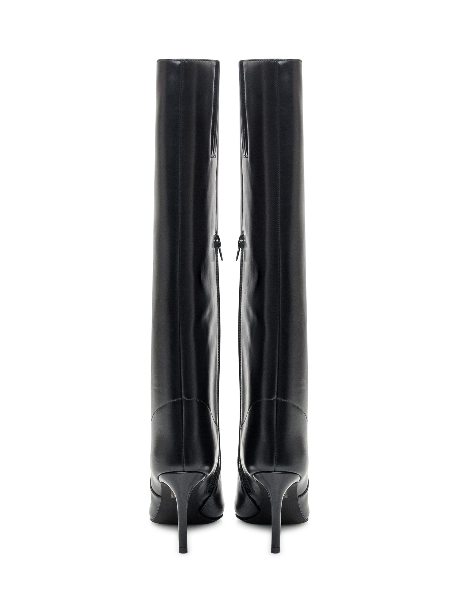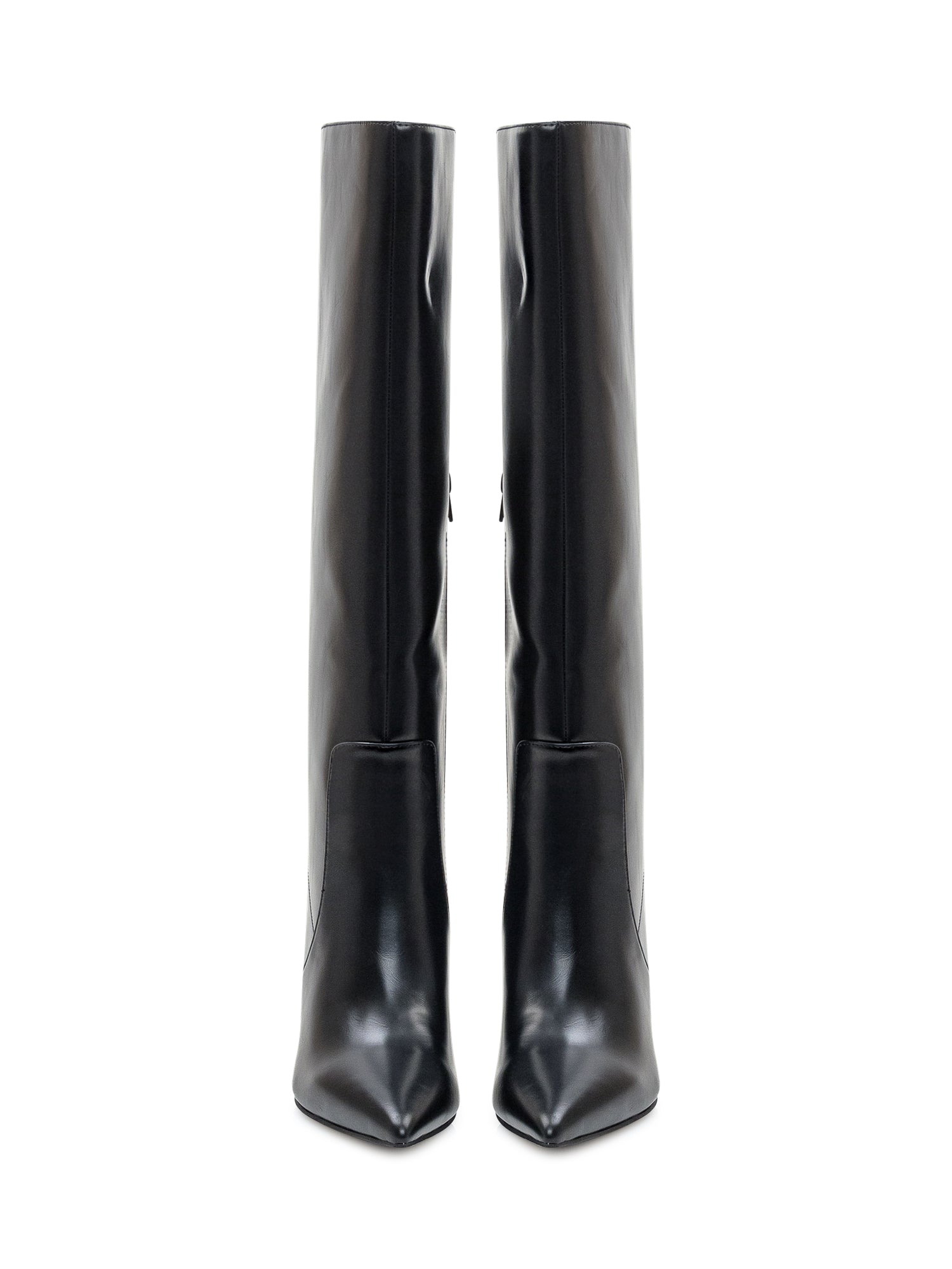 Jeffrey Campbell black leather boots with pointed toe and stiletto heel.
