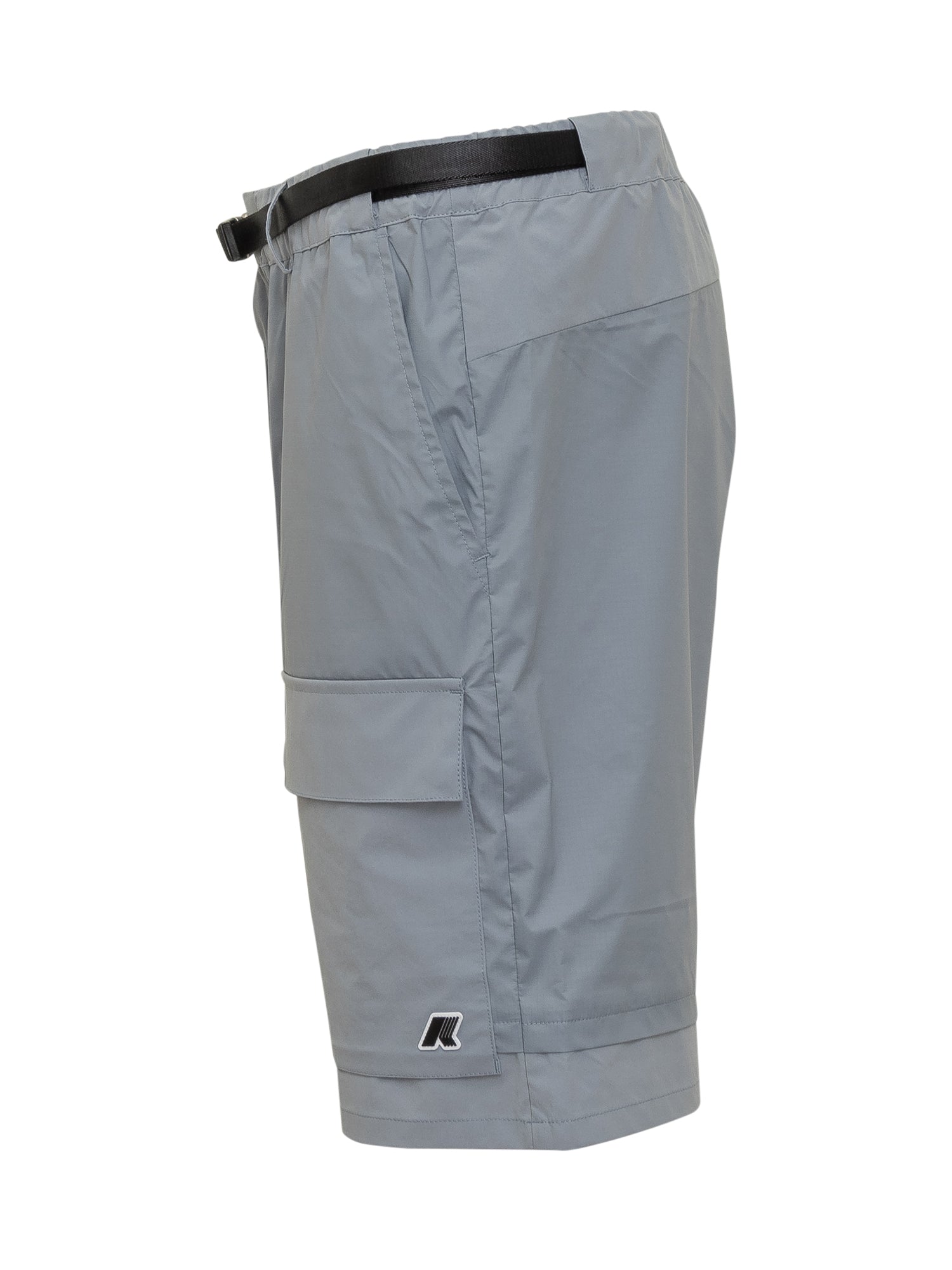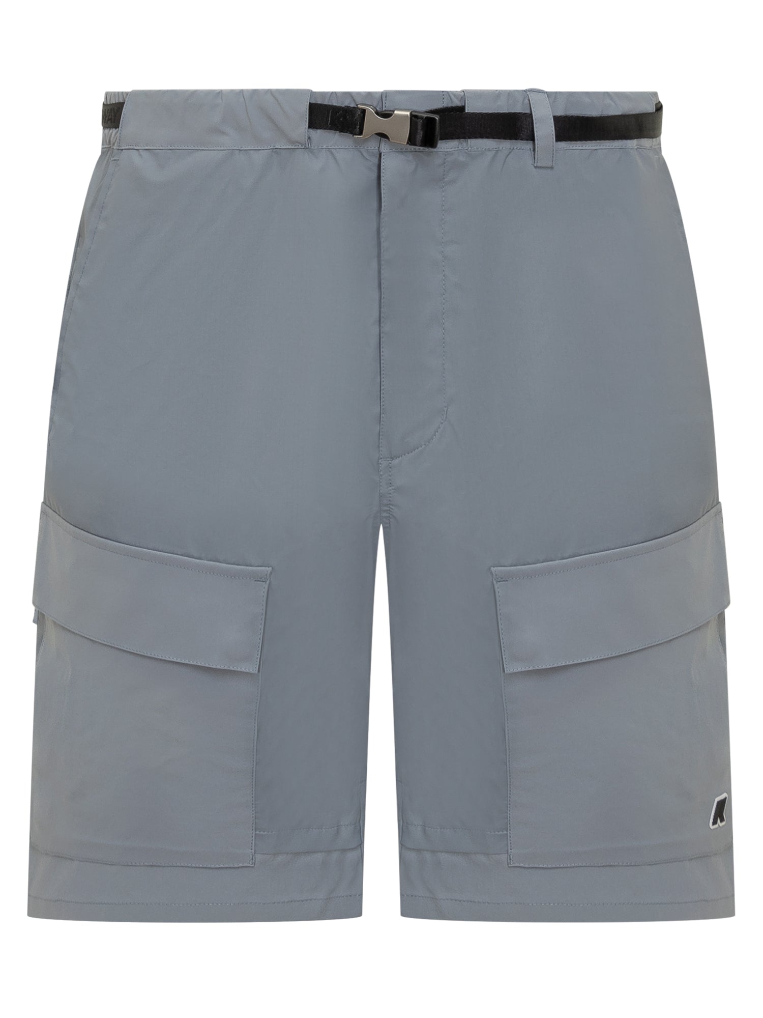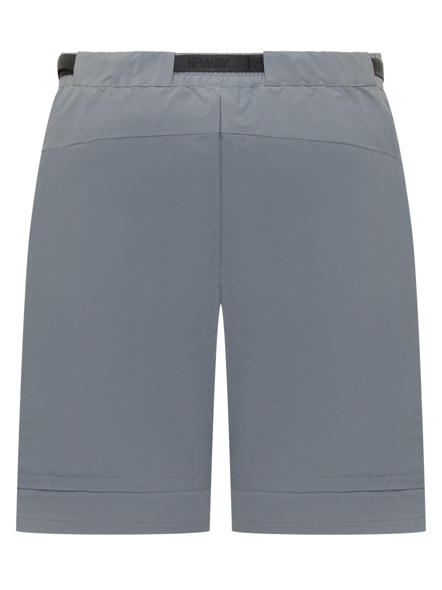 Button and zip closure, belt with carabiner. Wide leg with side and back pockets. Inside pocket for coins. Keychain loop and logo in black silicone on white background.