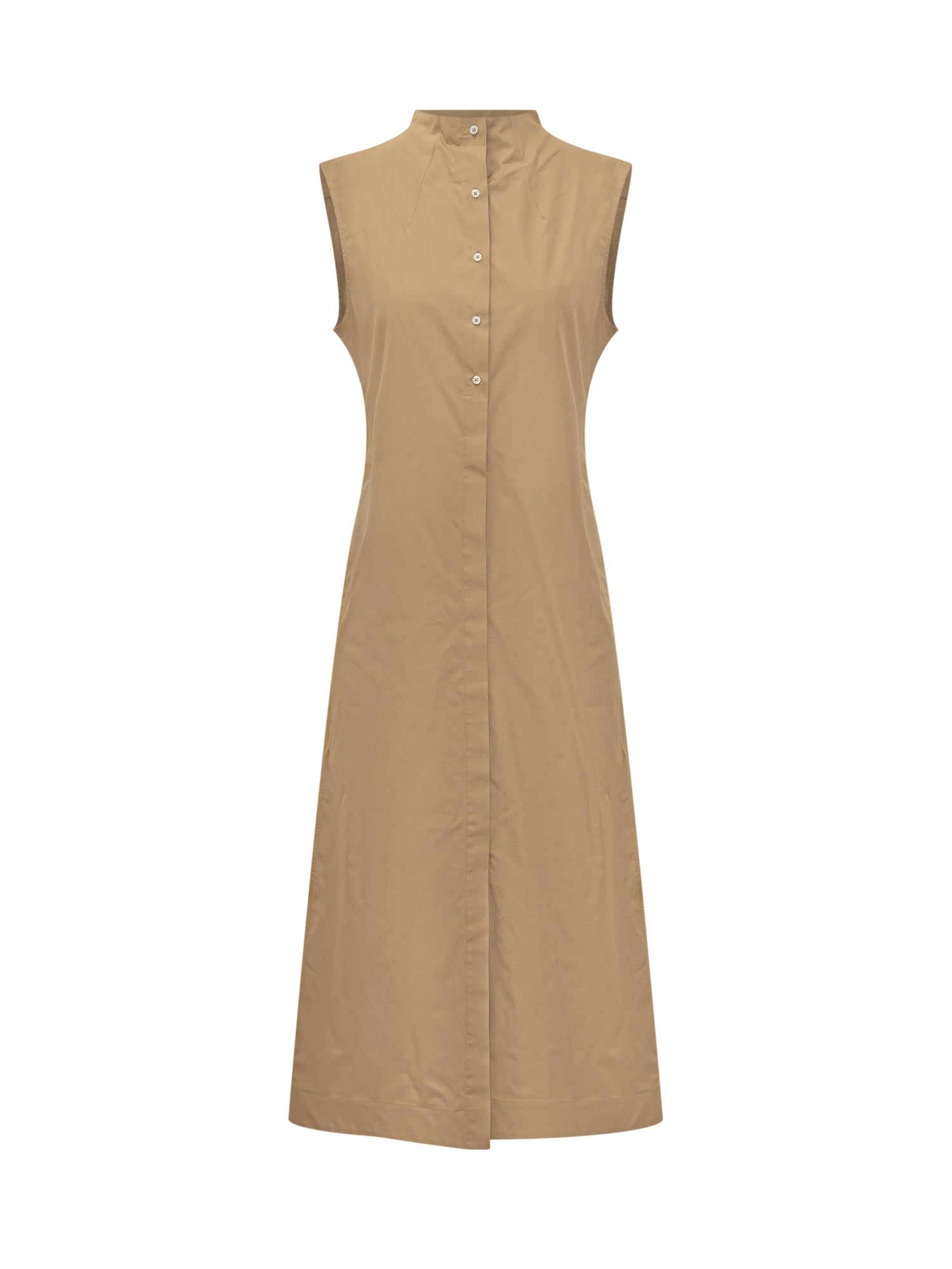 Long sleeveless dress. Button closure. Mandarin collar.