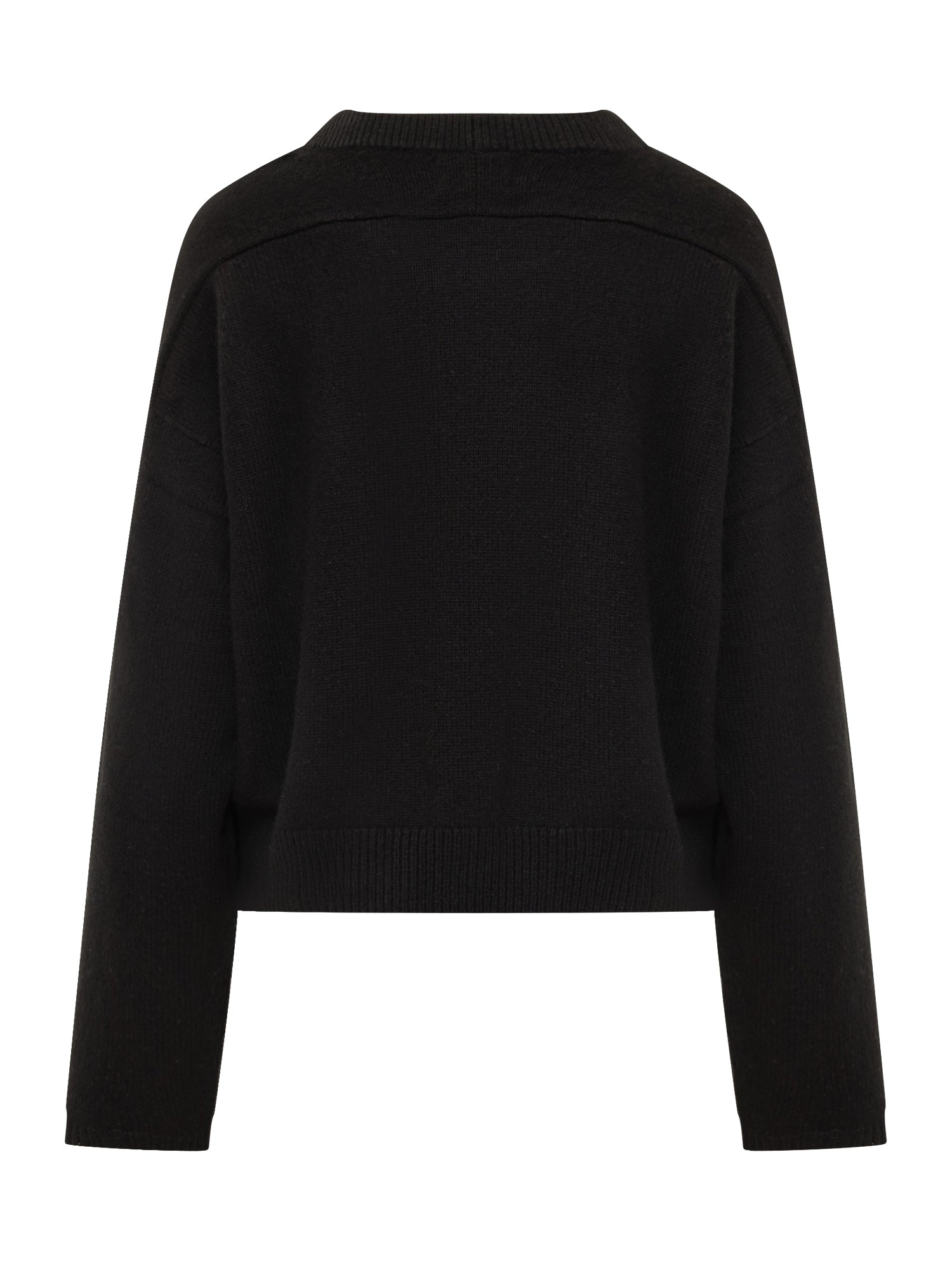 Black sweater by Loulou Studio crafted from soft wool, featuring a minimalist design enhanced with a decorative gold brooch on the side. Relaxed fit, crew neck and ribbed trims.