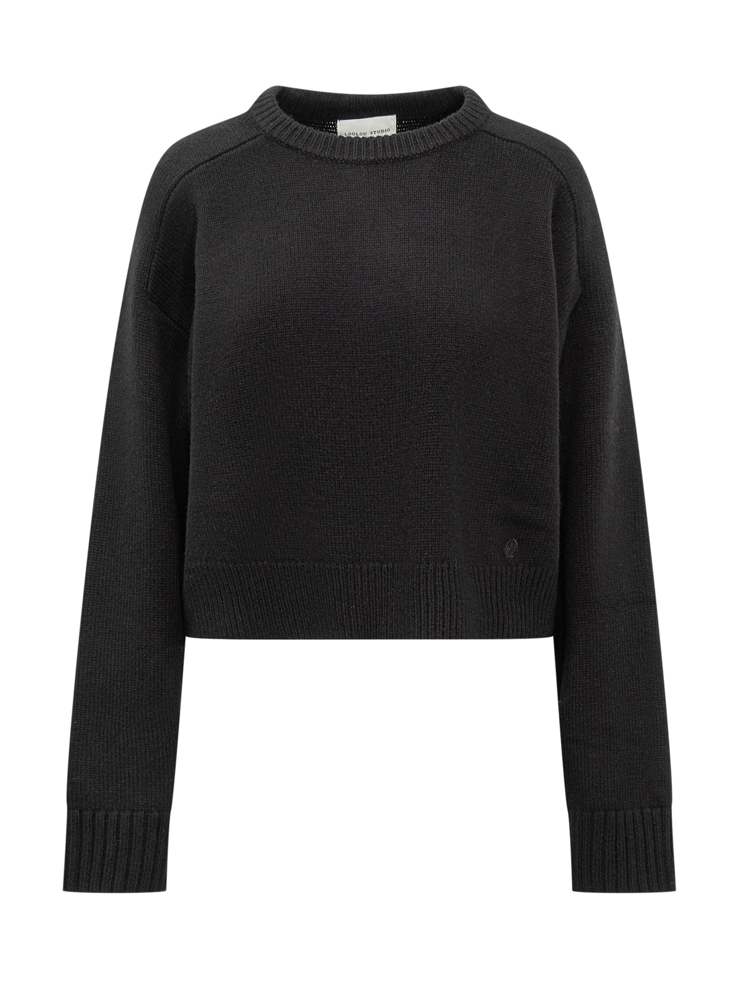 Black wool sweater. Cropped cut. Oversized fit. Ribbed collar, cuffs and hem. Embroidered logo.