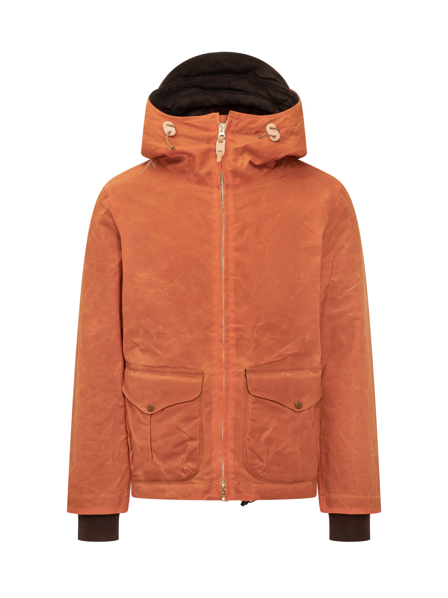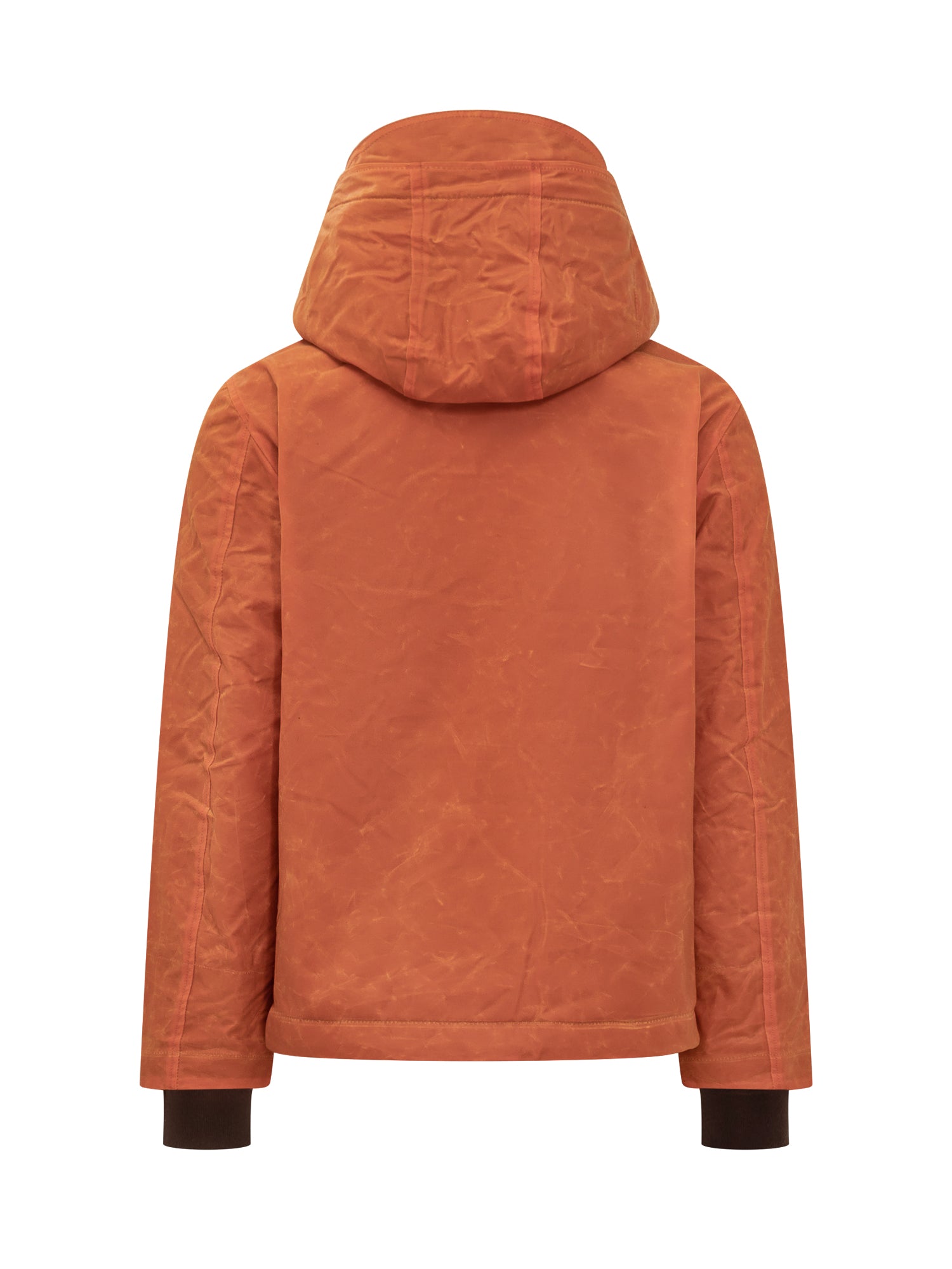 Orange waxed fabric jacket with adjustable hood, zip closure and front flap pockets.