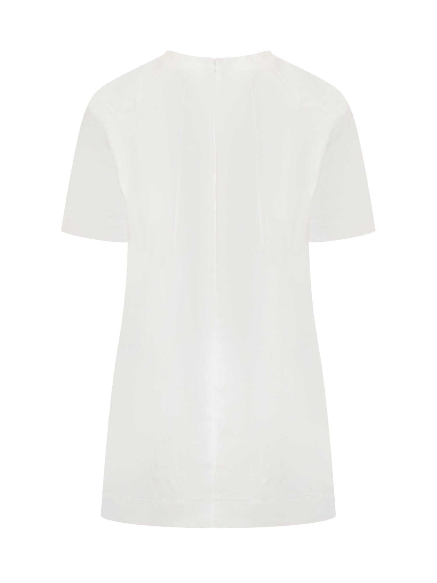 Mini cotton dress. Round neck. Zip back closure. Asymmetrical hem.