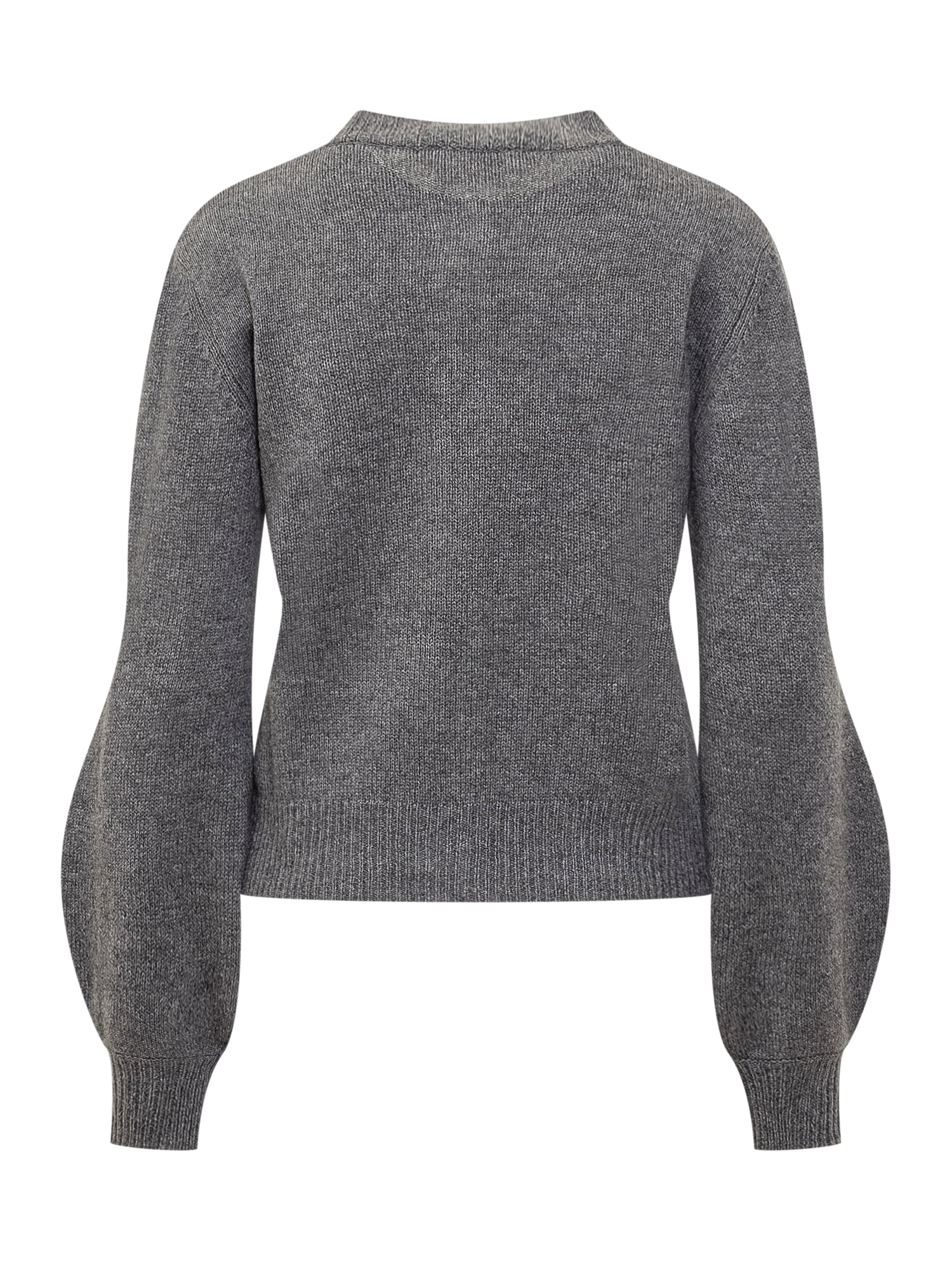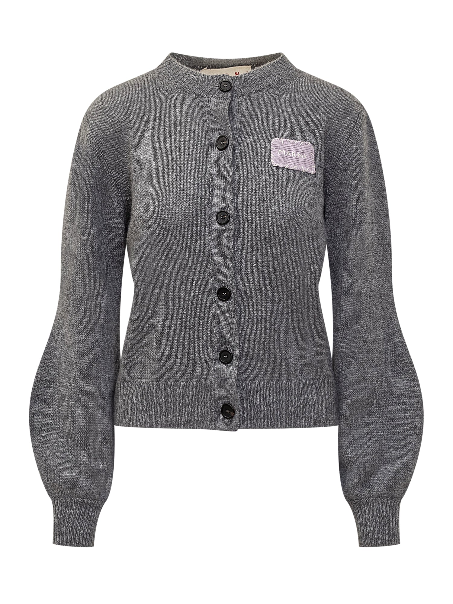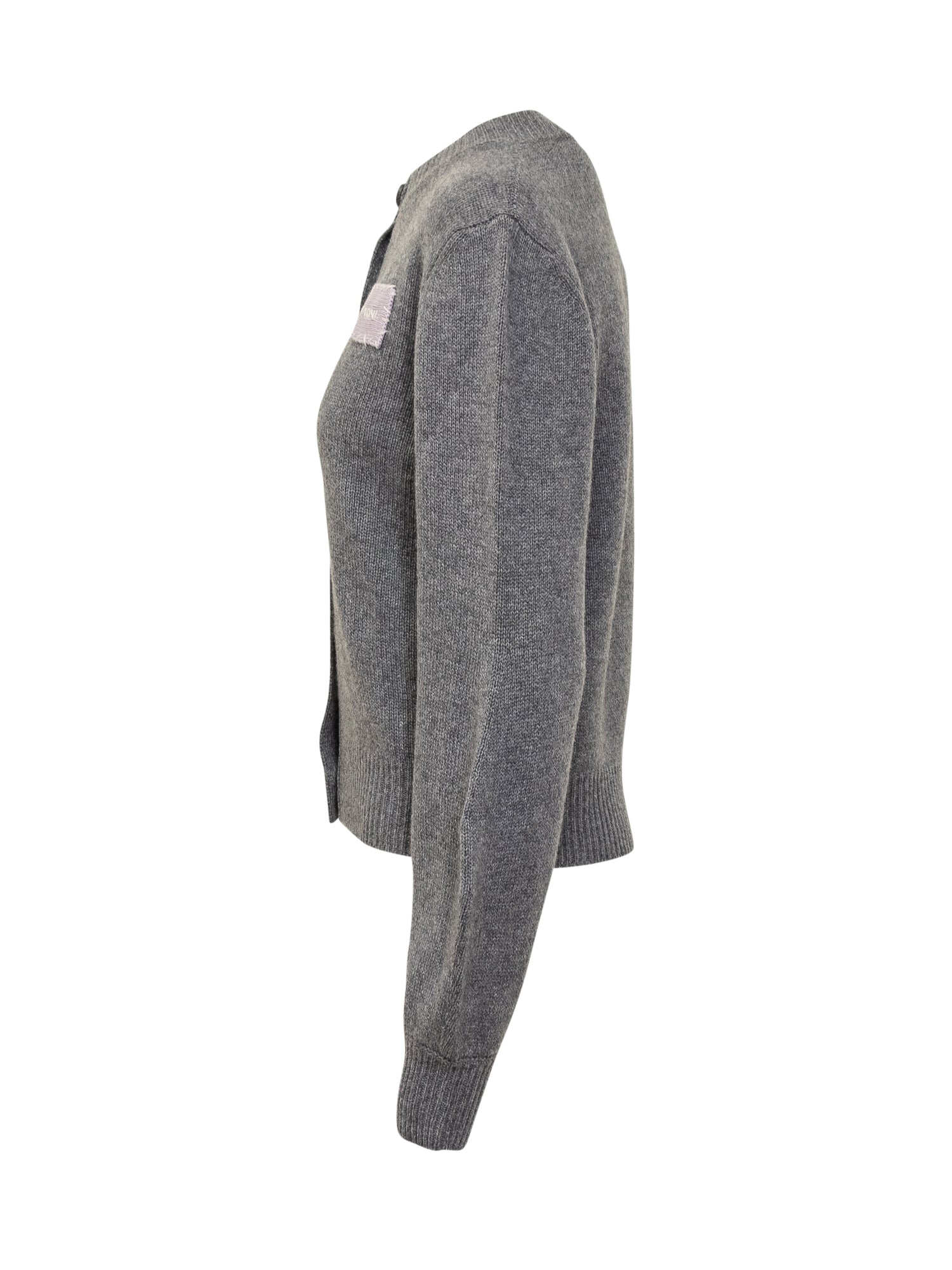 Grey cashmere cardigan. Round neck. Ribbed collar, cuffs and hem. Patch logo. Button closure.