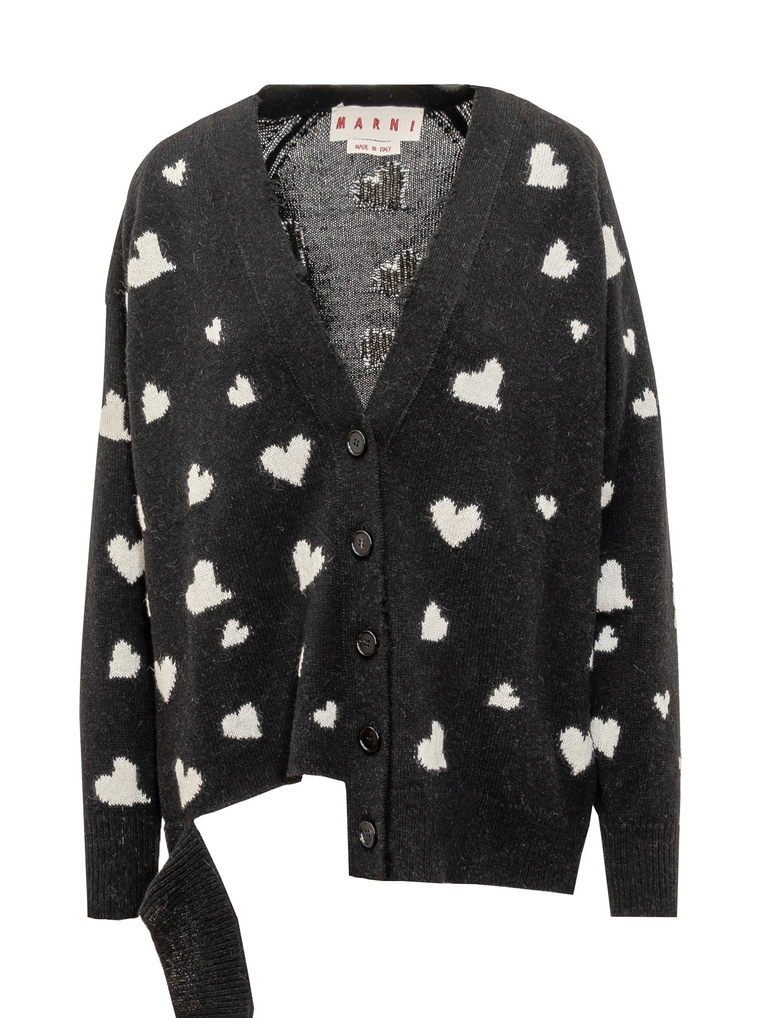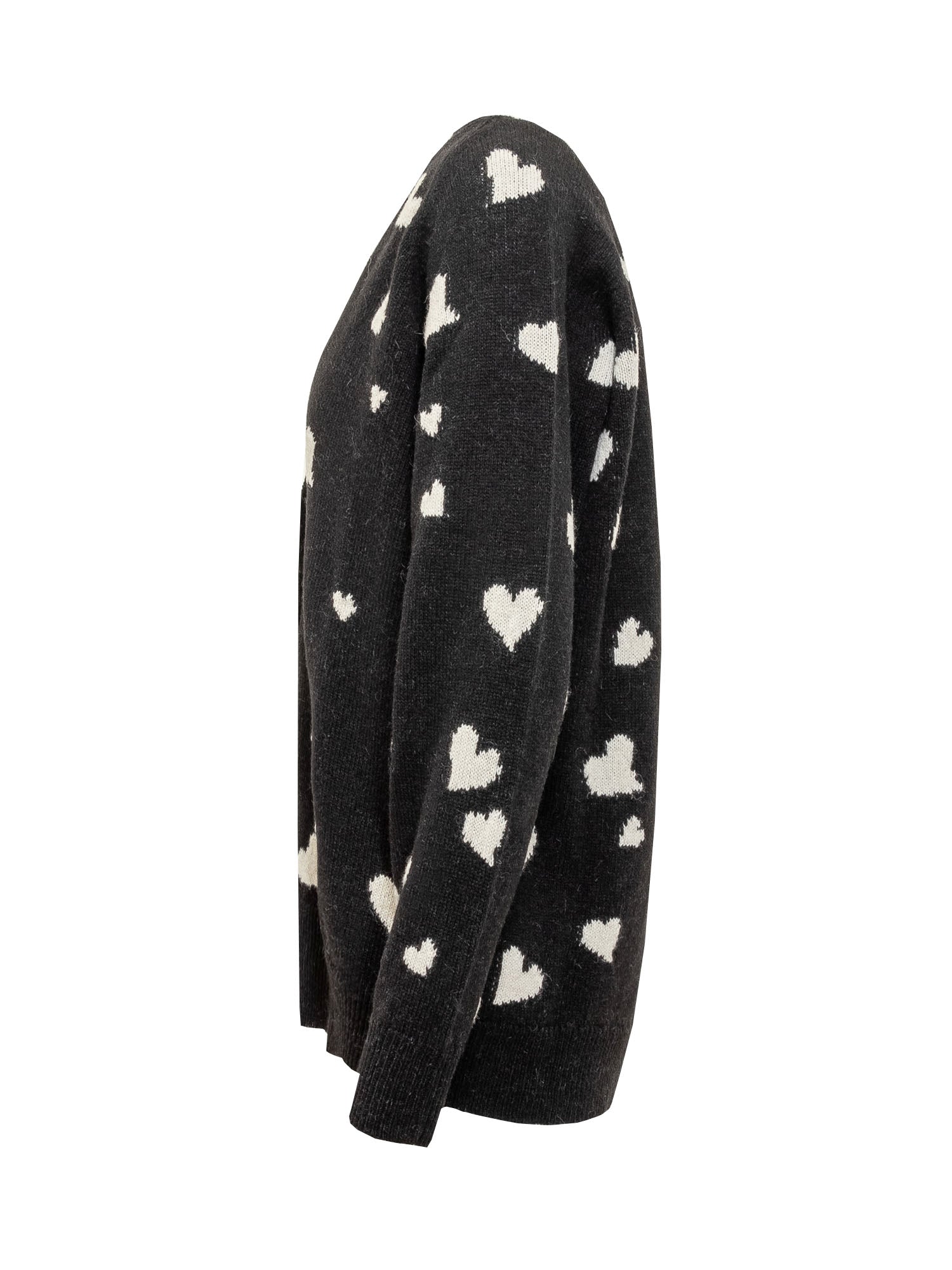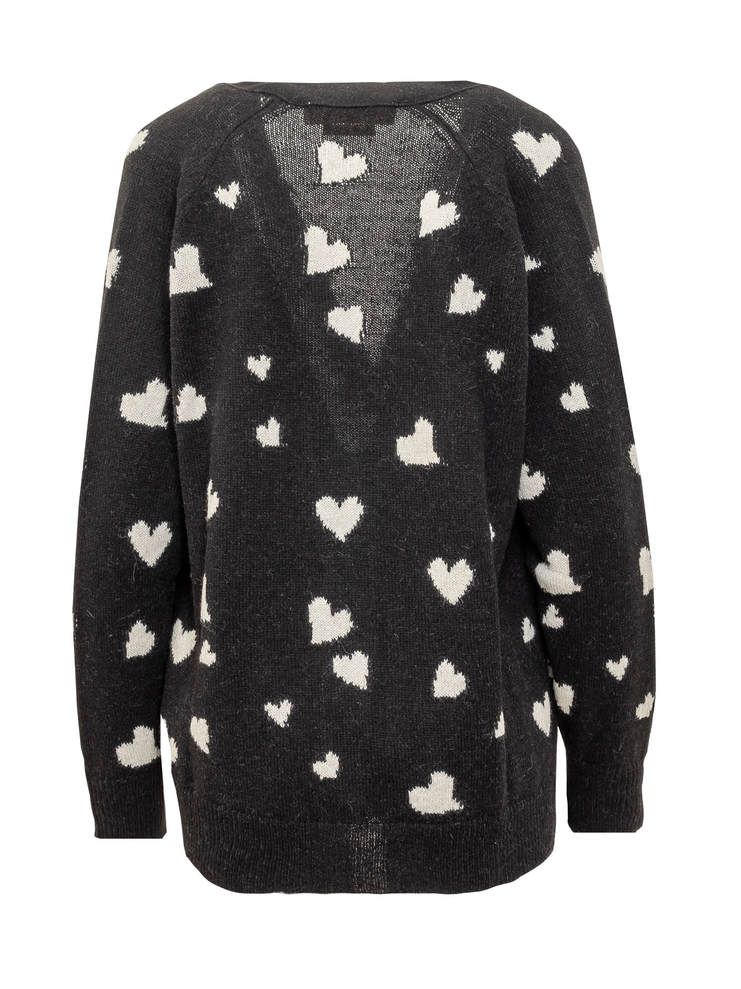 Virgin wool and alpaca blend long-sleeved cardigan. V-neckline. Button fastening. Ribbed hems. Knitted fabrication with worn effect. Bunch of Hearts all-over jacquard motif.