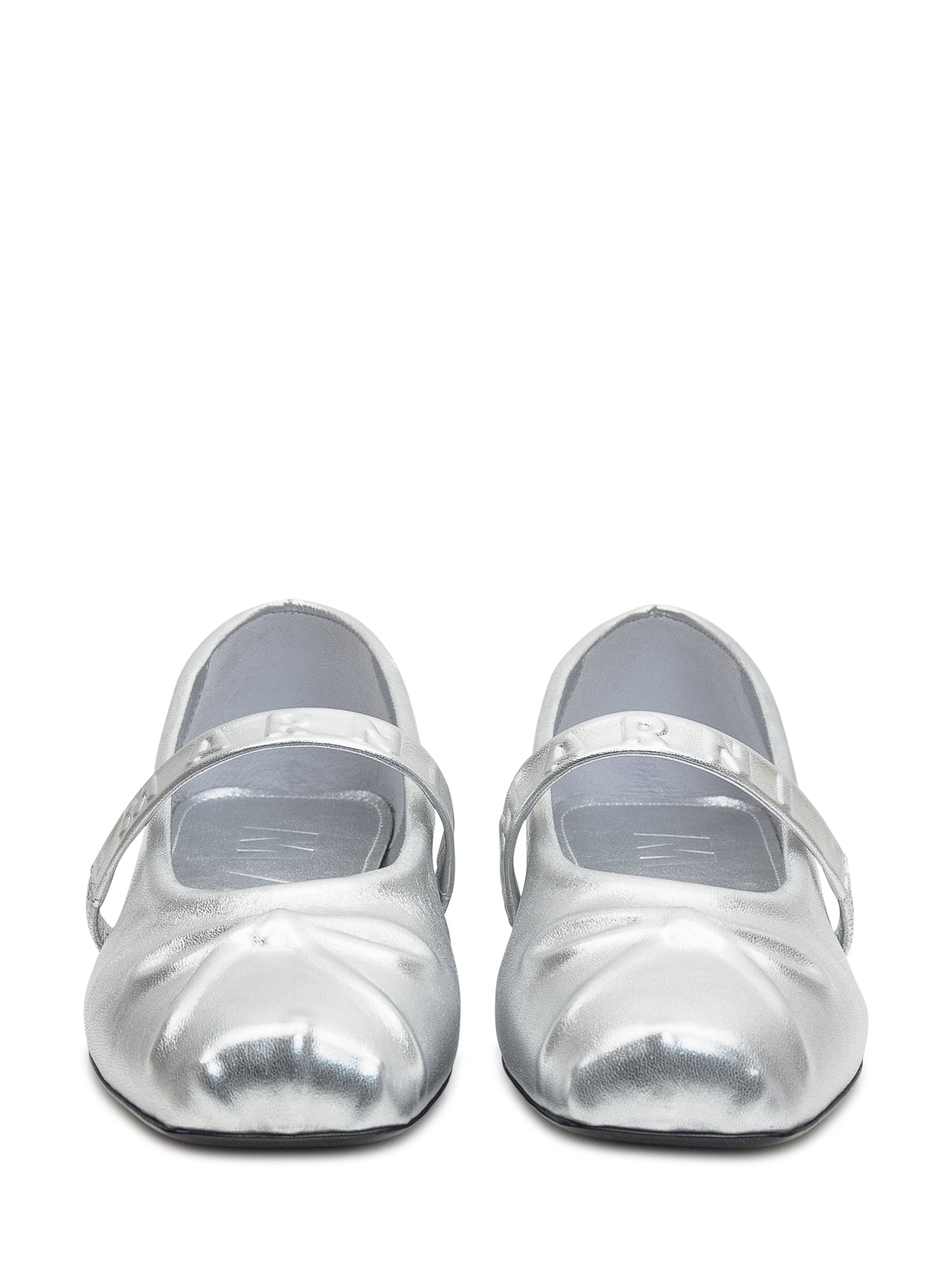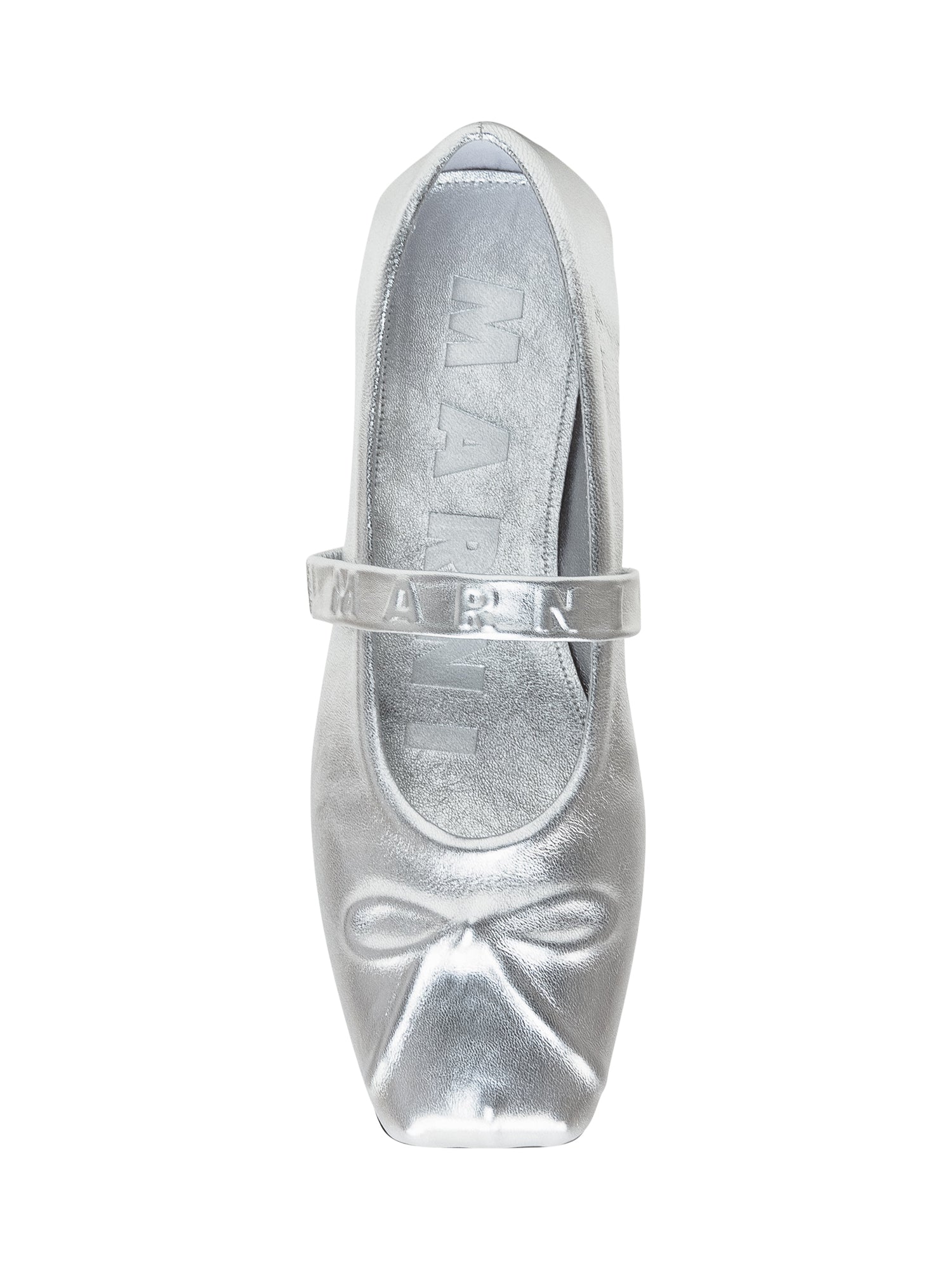Ballerina with silver leather lace-up. Rubber sole. Logo embossed on the front. Bow detail.