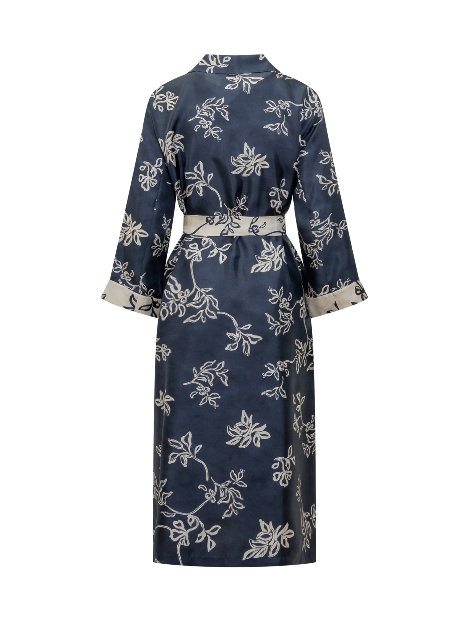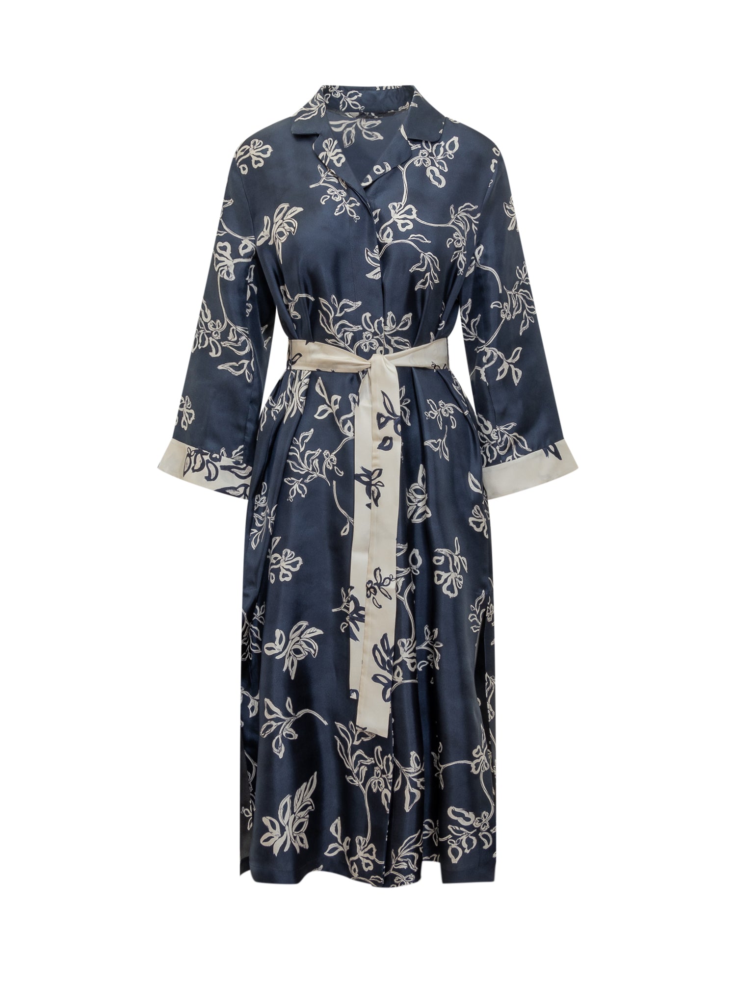 Straight fit. Wide side slits. Bowling collar. Long set-in sleeves. Hidden buttons on the front. Belt at the waist. Contrasting trims.