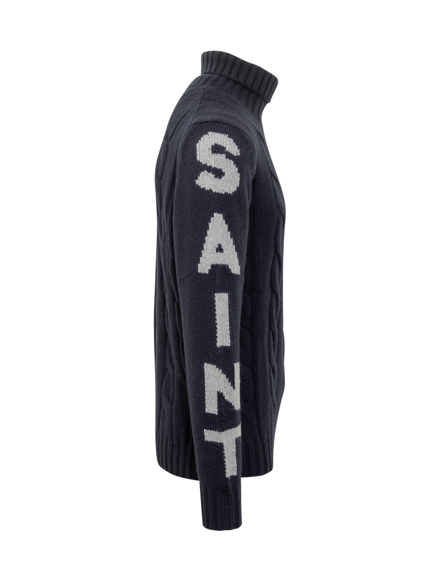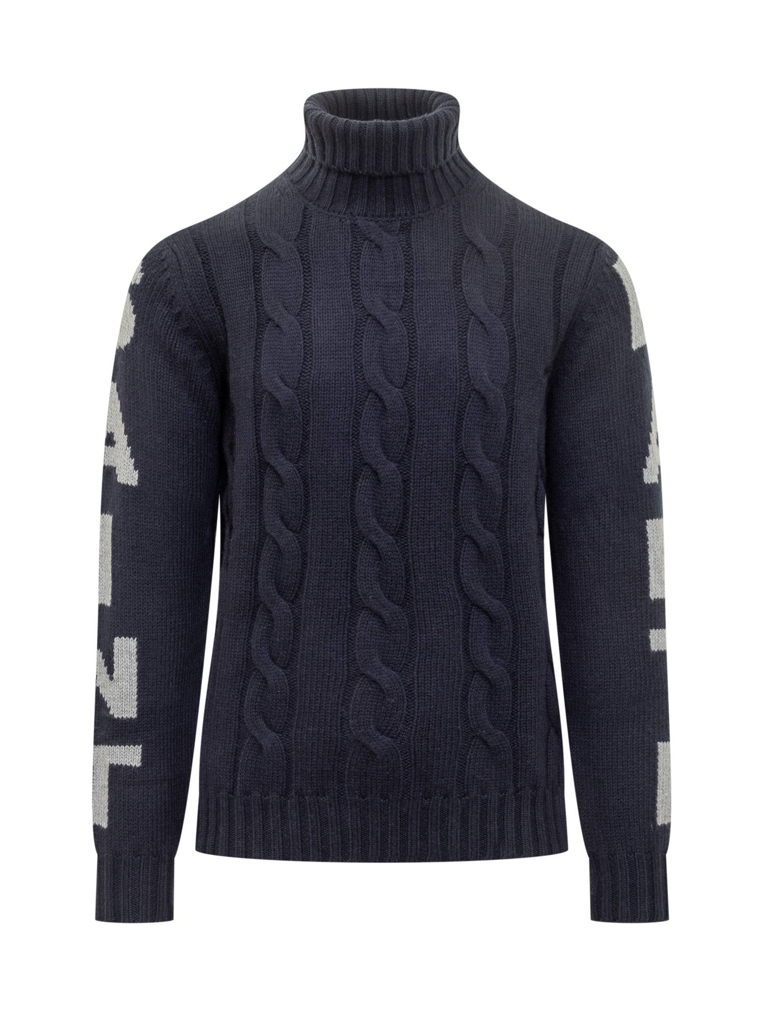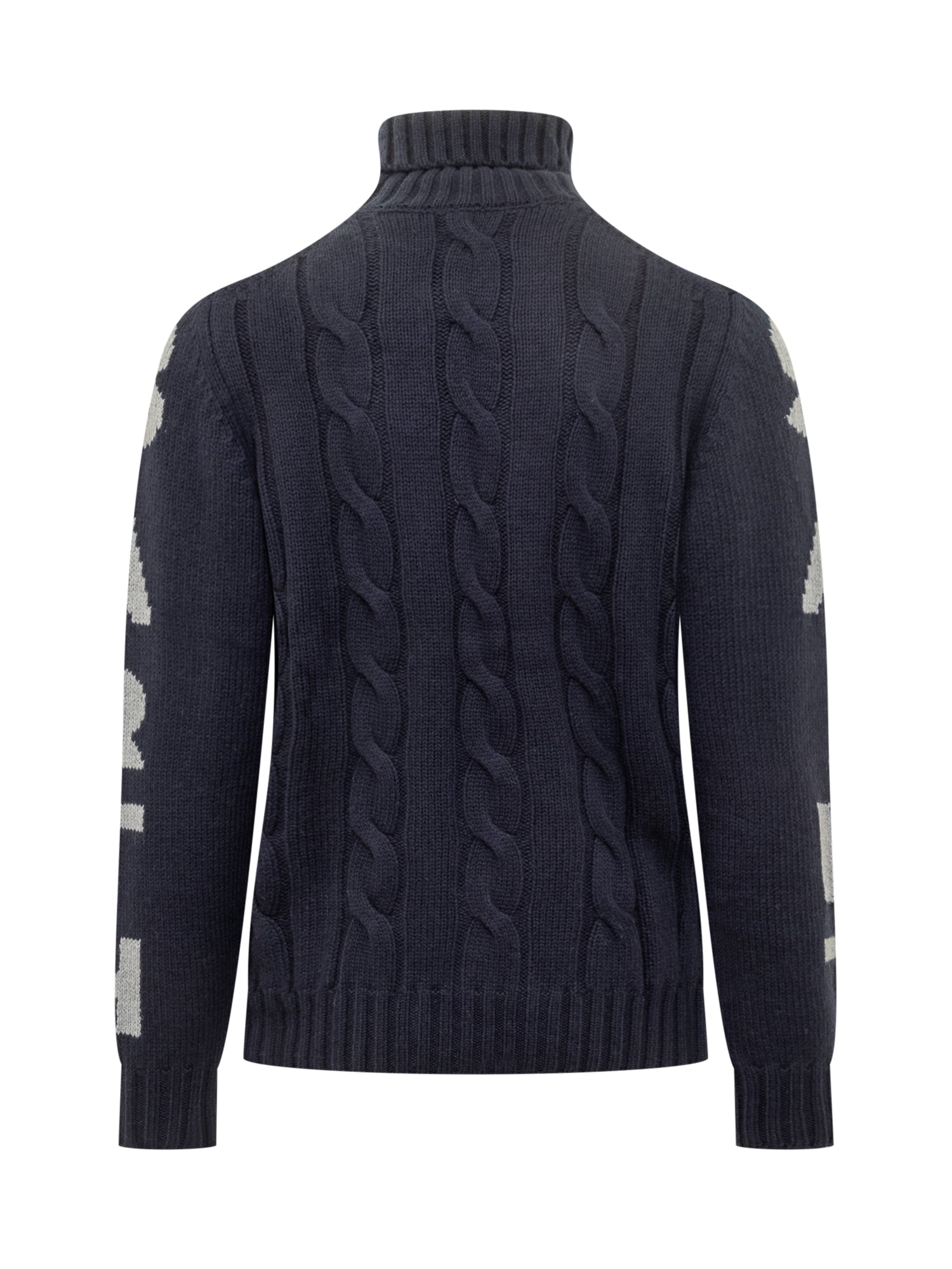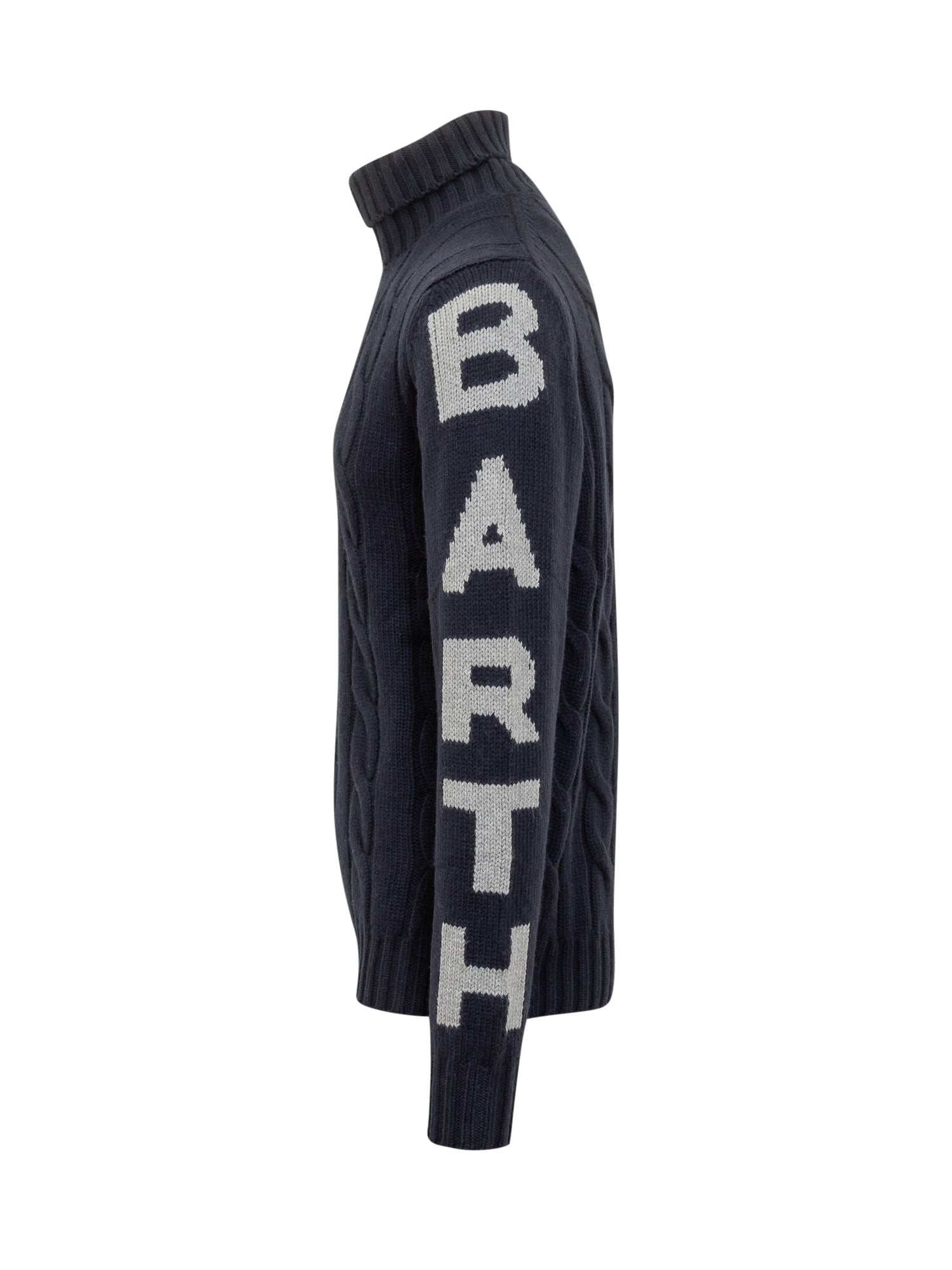 MC2 Saint Barth Fisherman turtleneck in blue wool with cable knit and contrasting logo on the sleeves. A warm, modern sweater.