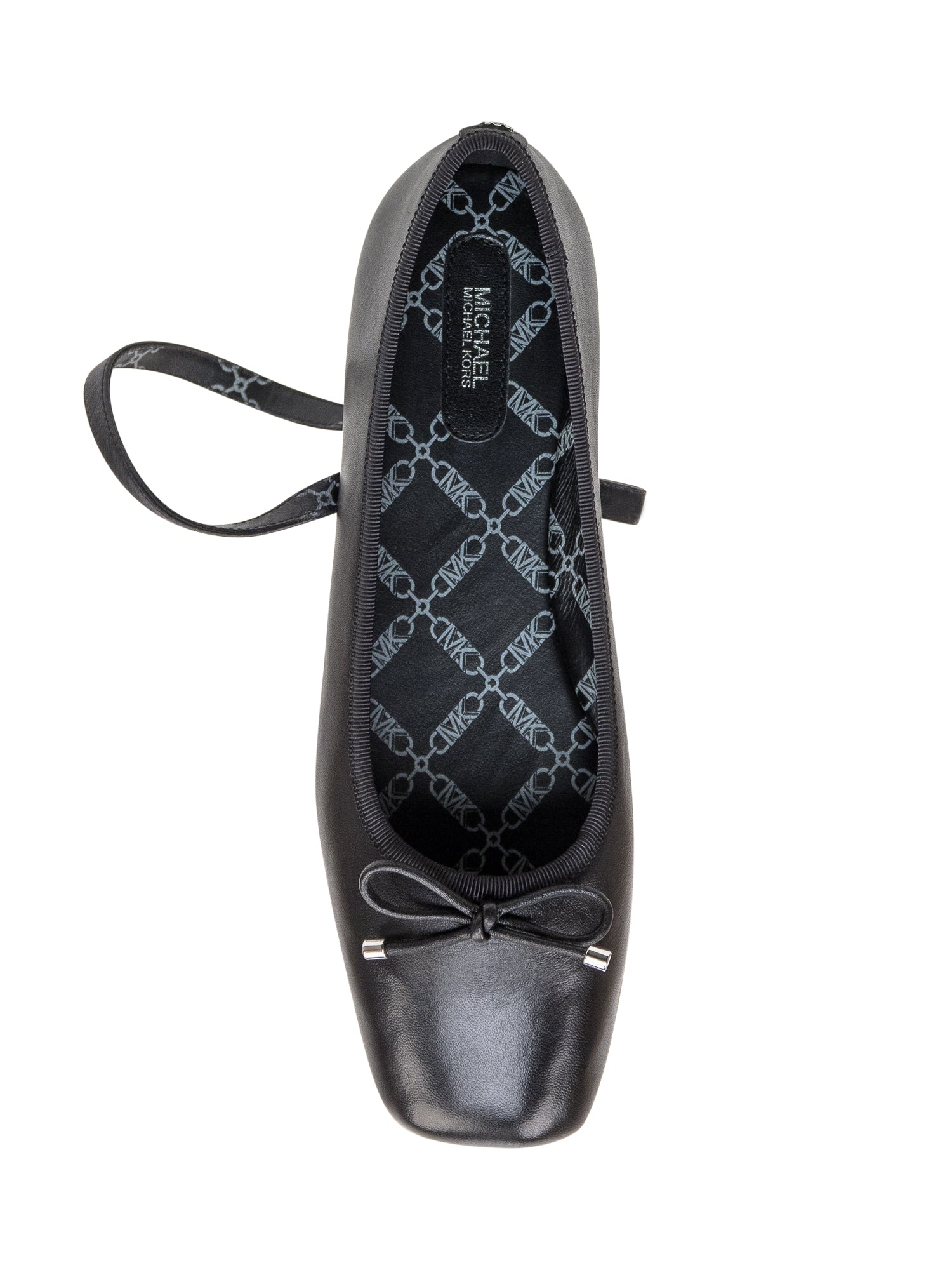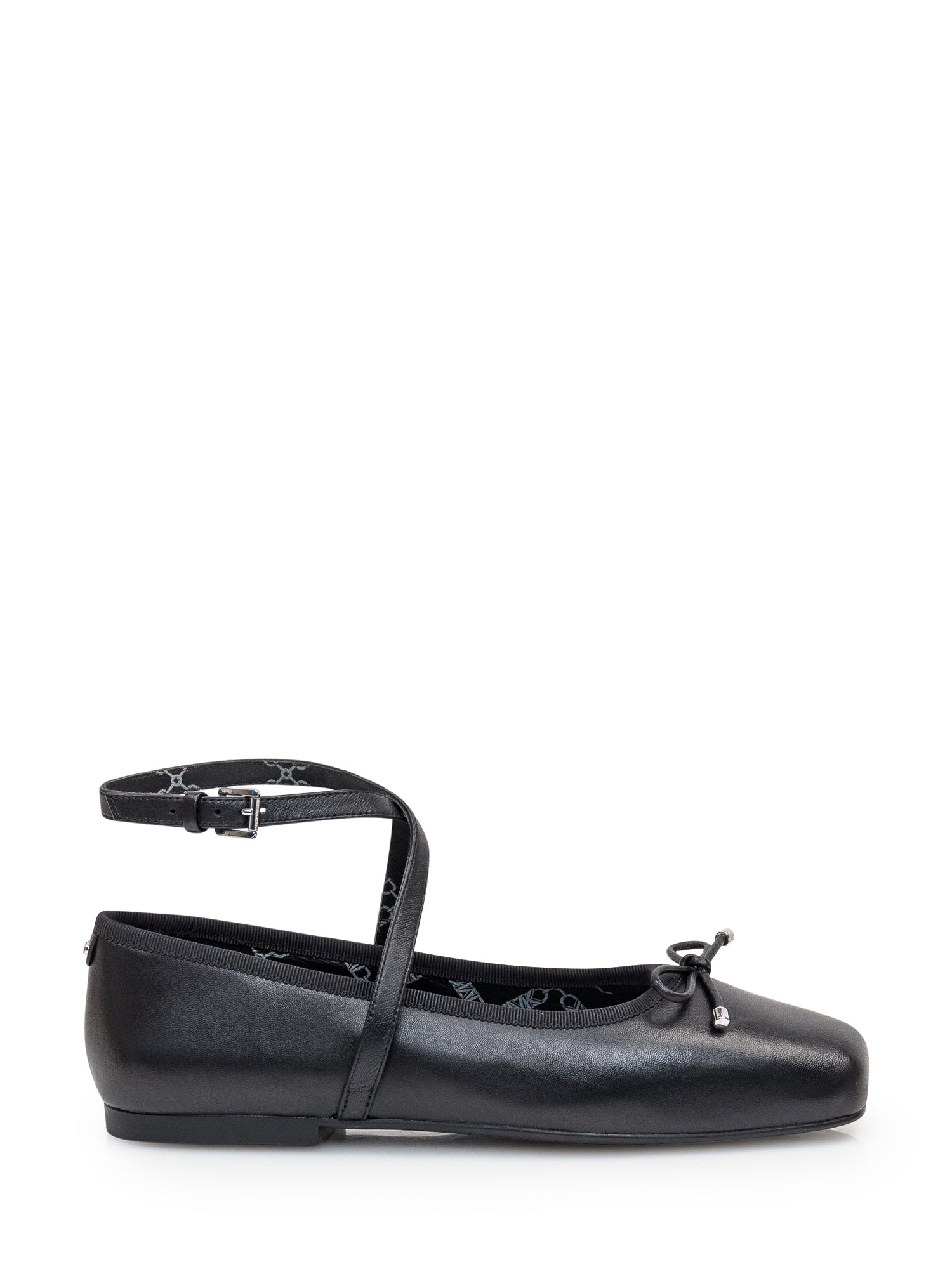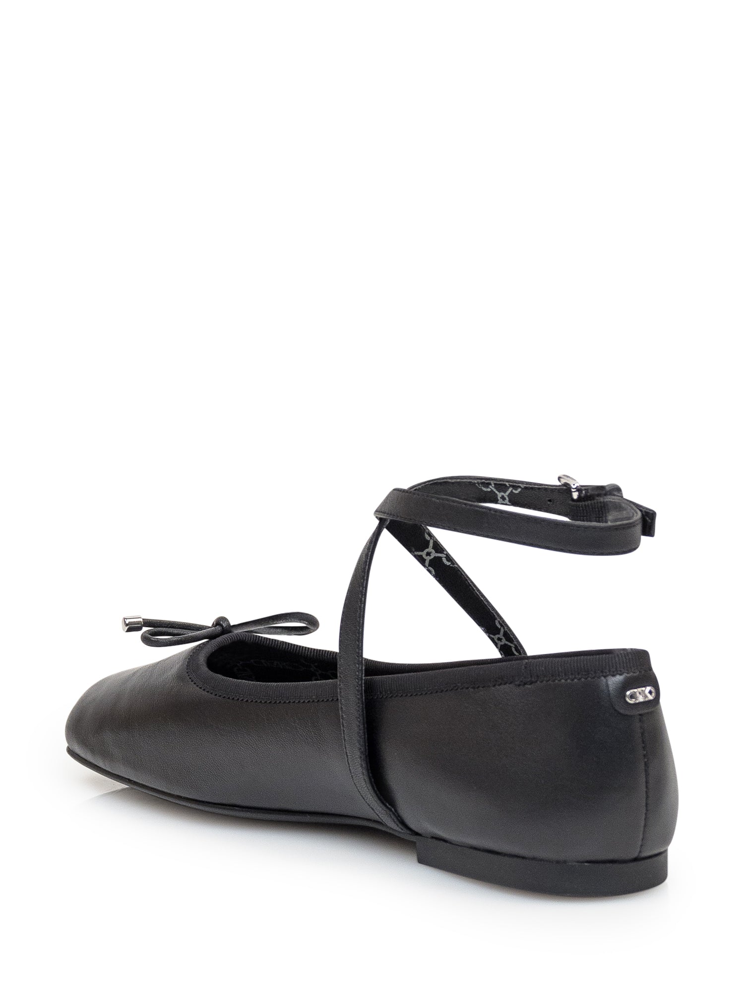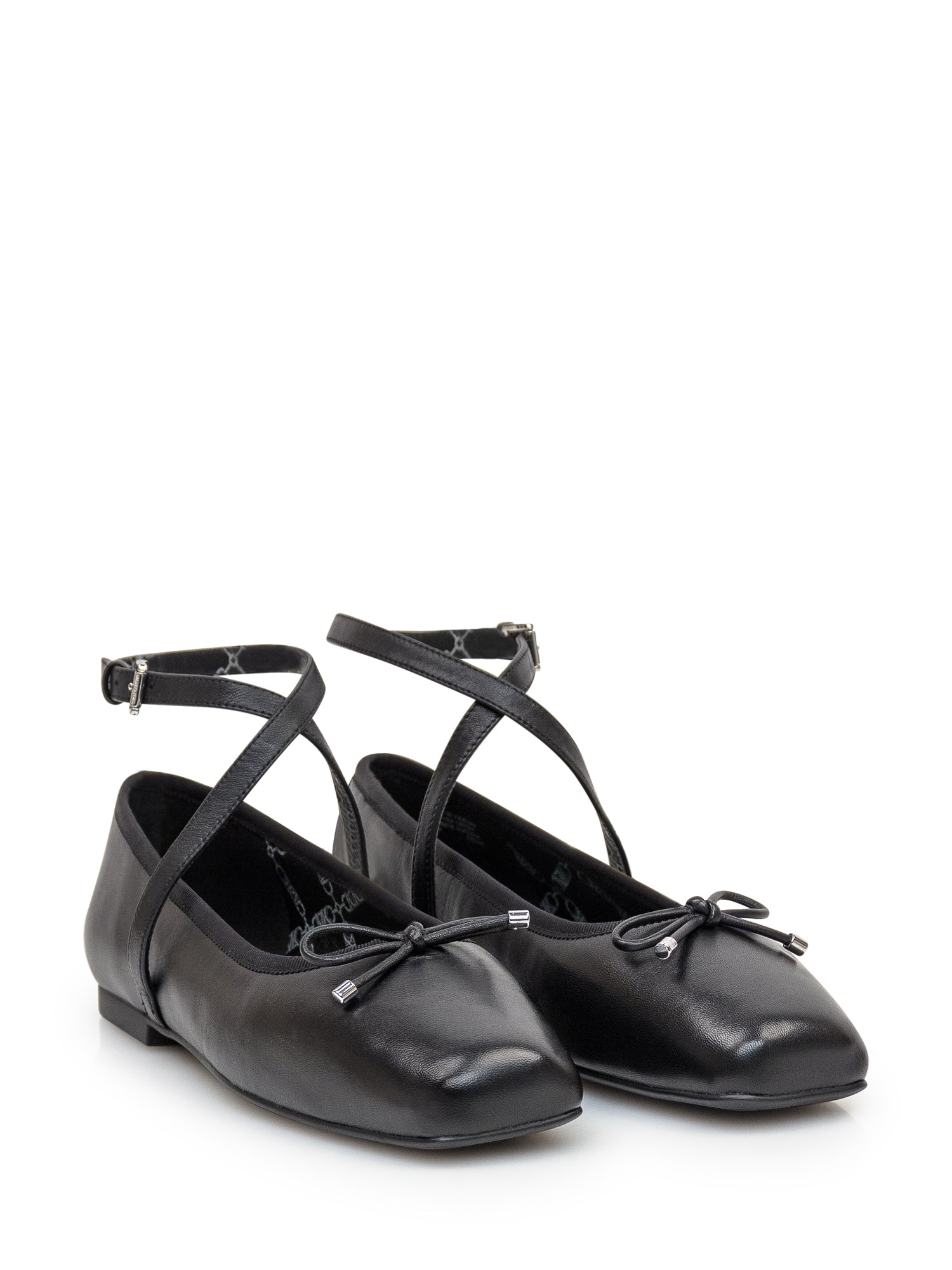 Black leather ballerina. Square toe. Bow detail. Ankle strap closure. Logo label on the back.