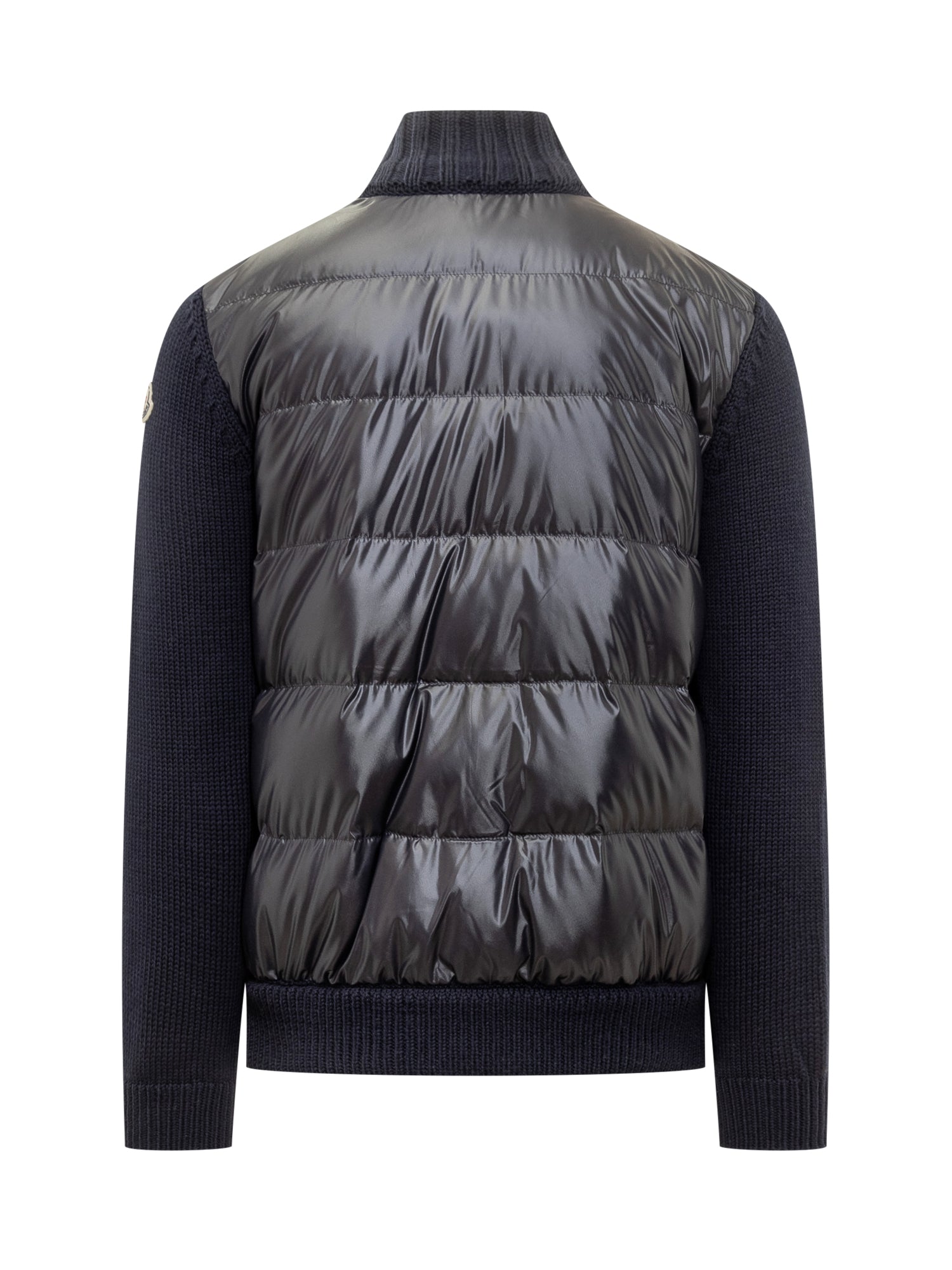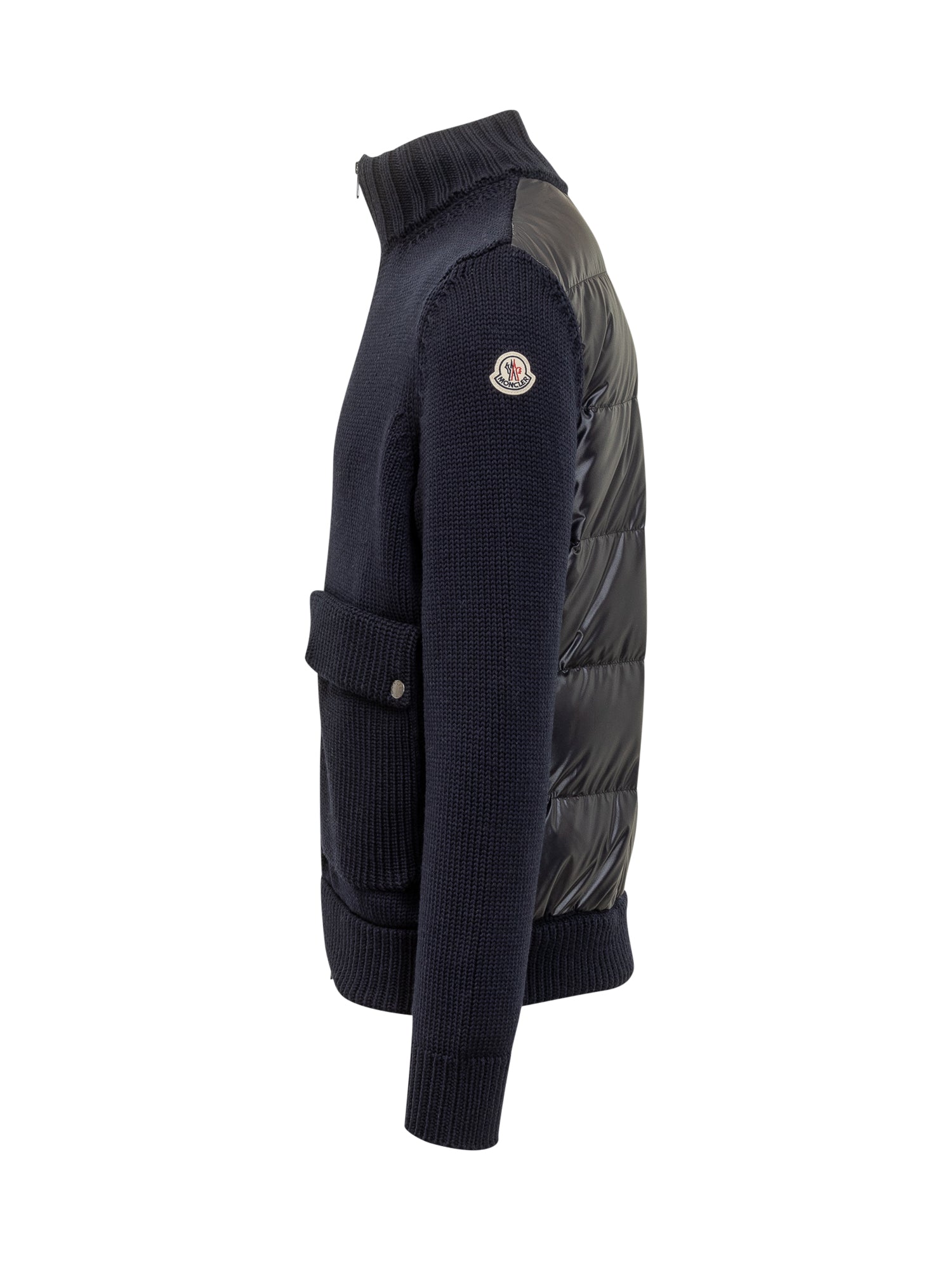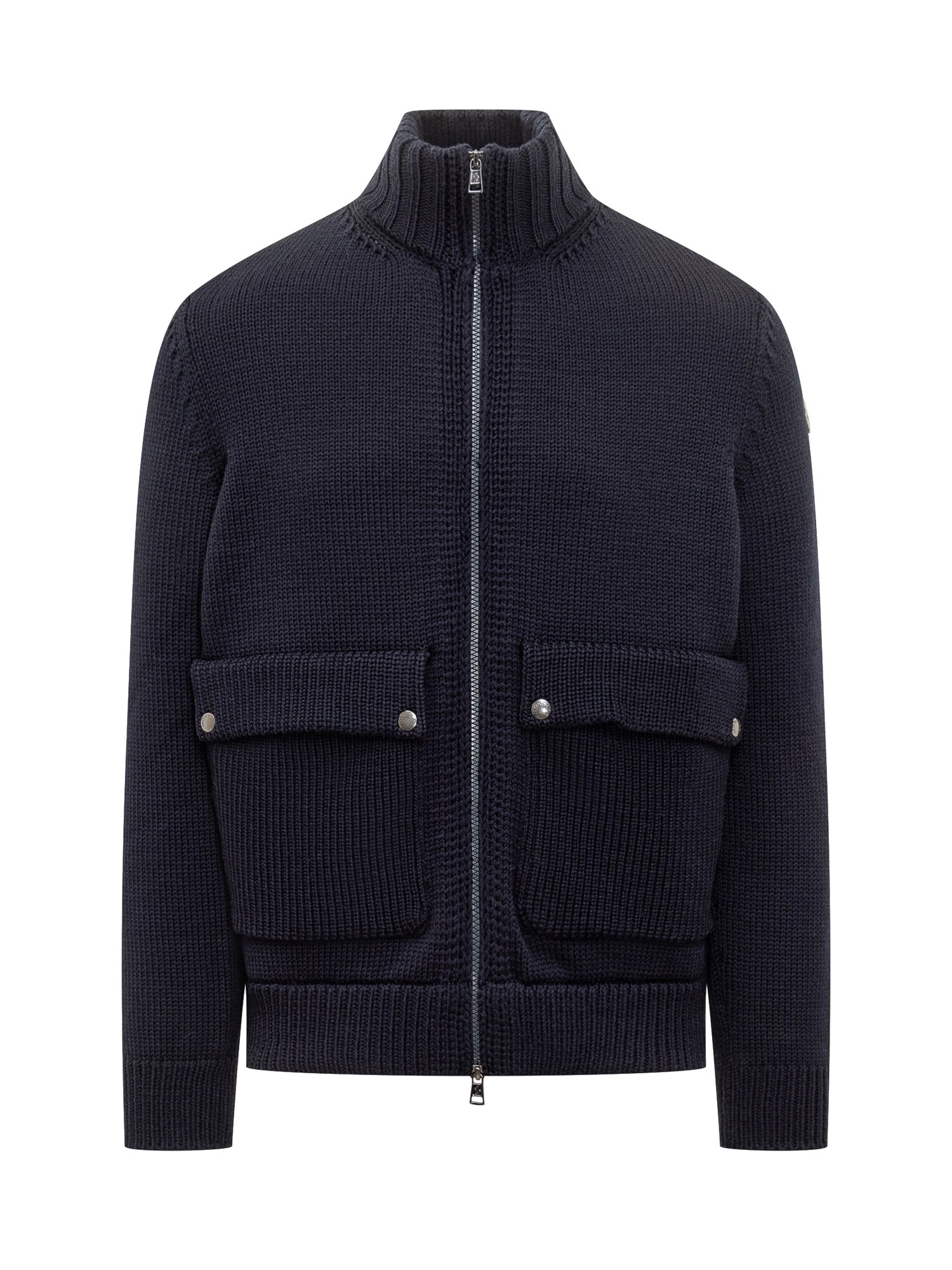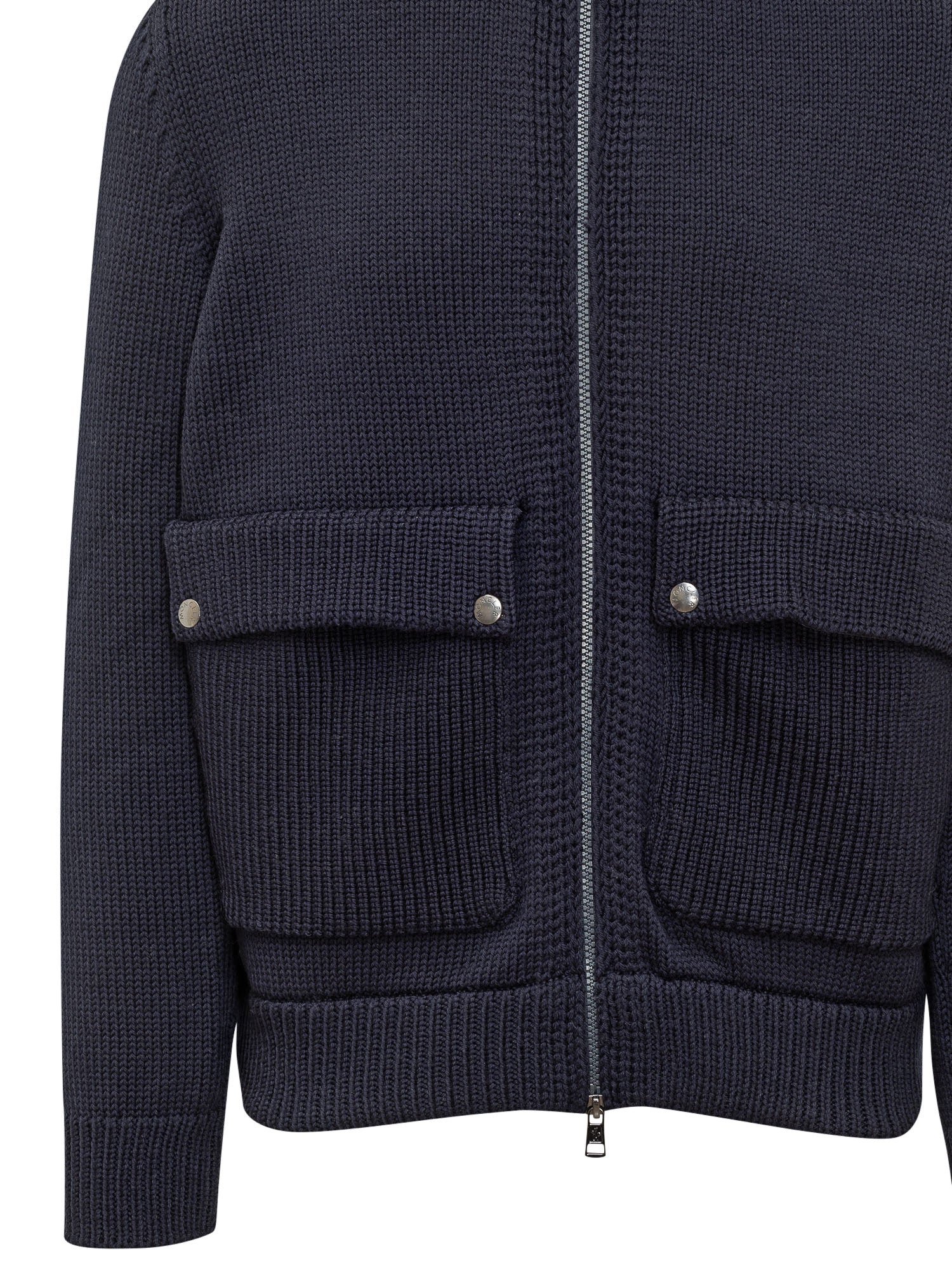 Moncler blue heavy-knit cardigan featuring zip closure and large front pockets.