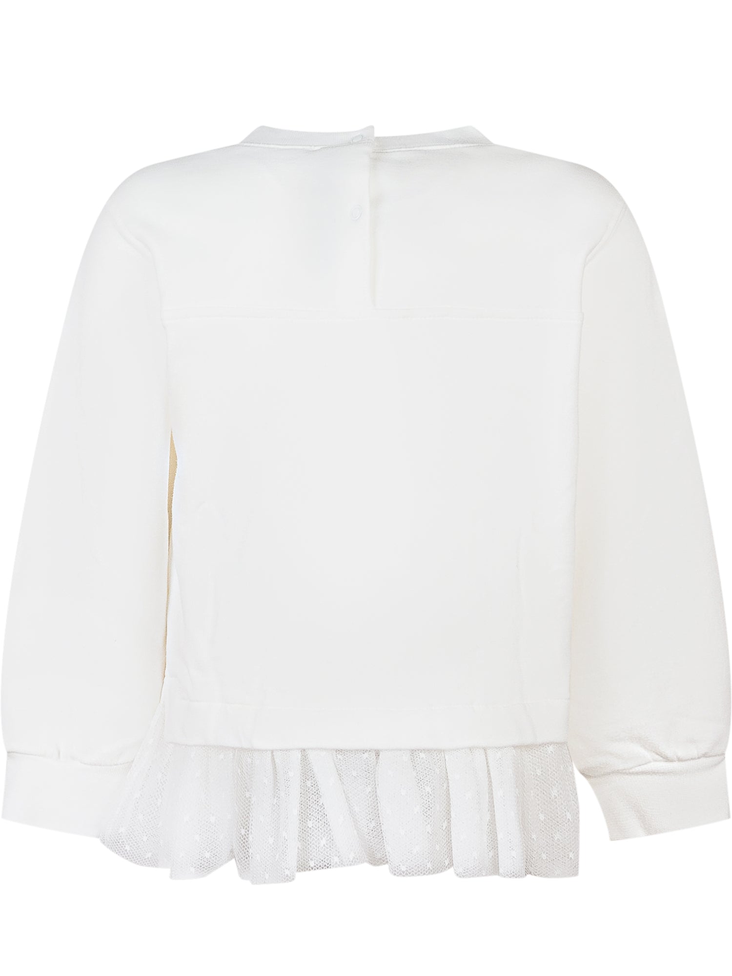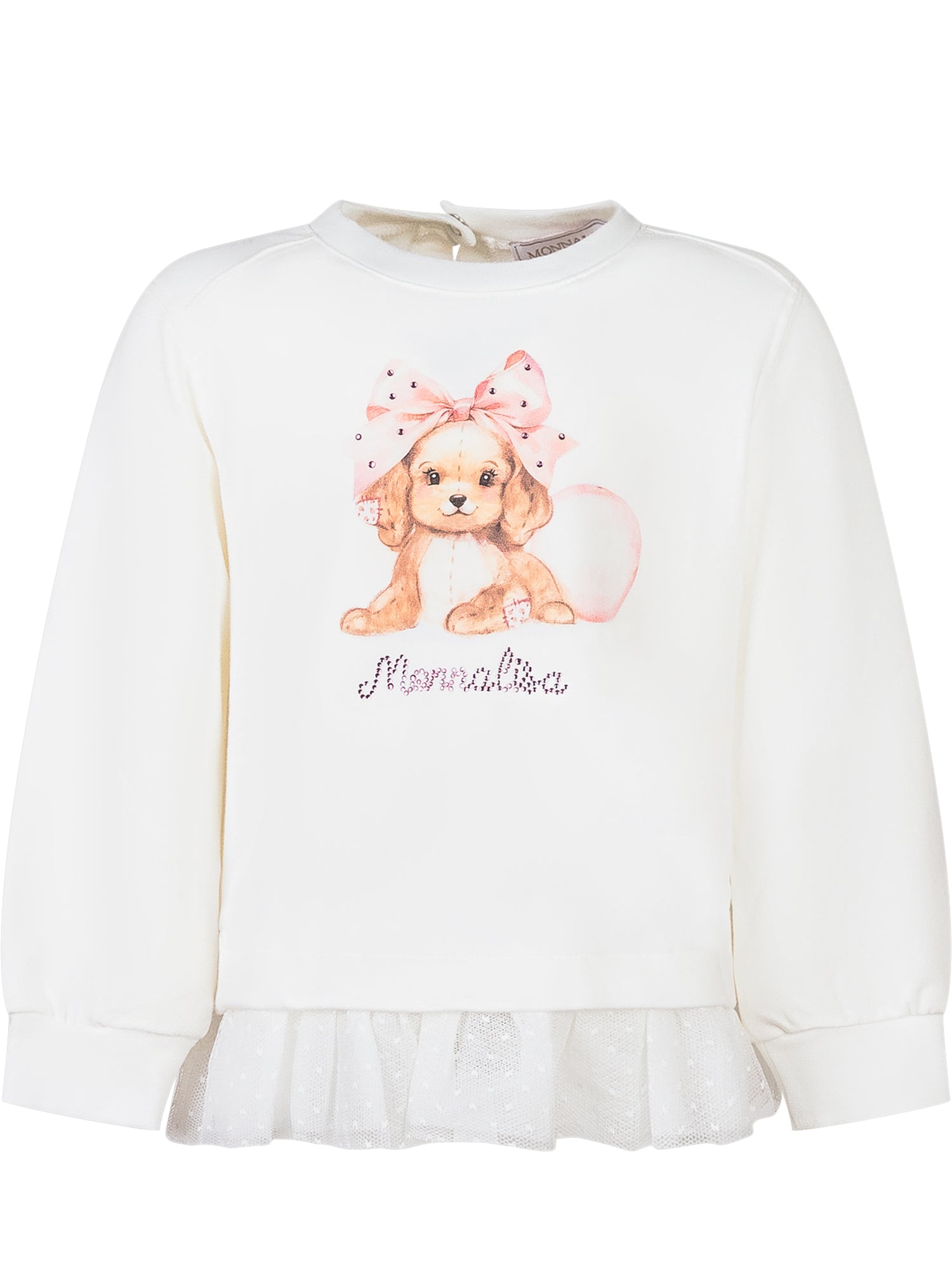 Monnalisa white cotton sweatshirt featuring a puppy print with pink bow, rhinestone logo, and tulle hem.