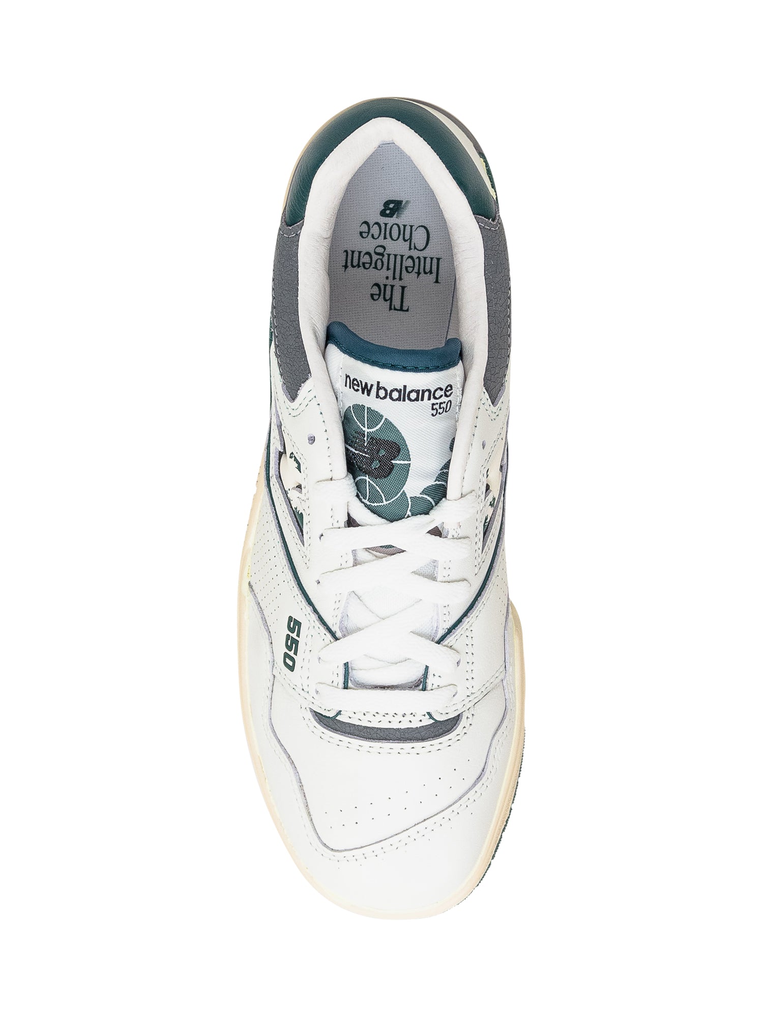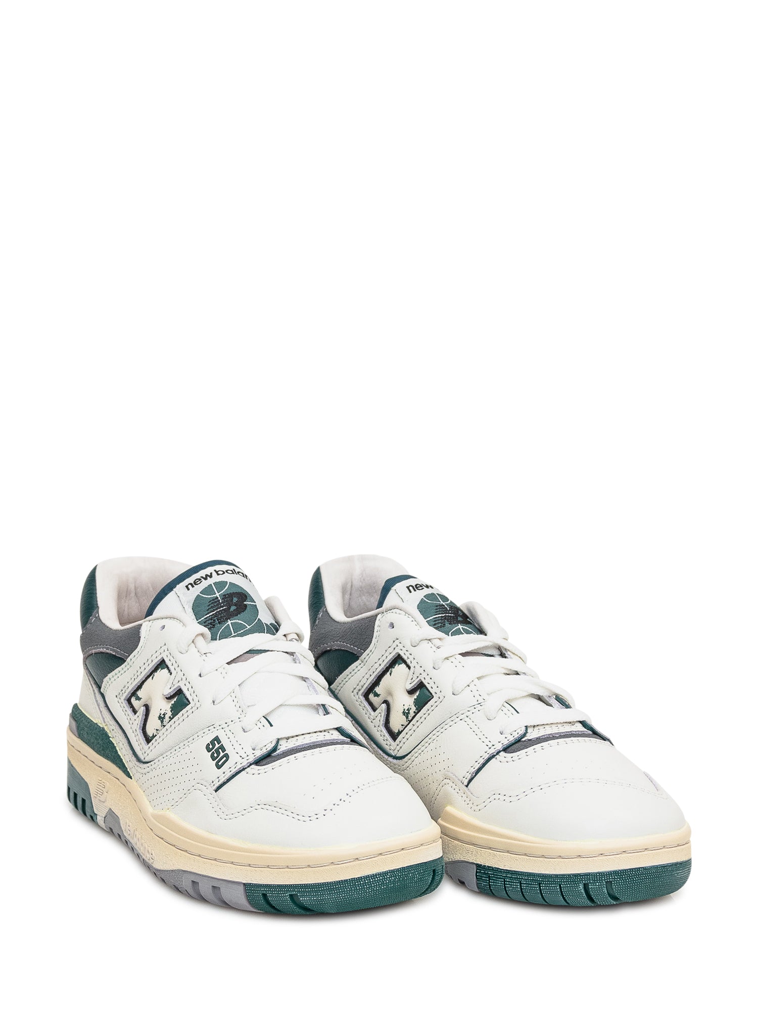 White leather sneaker. Closure with laces. N logo on the sides. Perforated toe. New Balance 550 logo on the tongue.