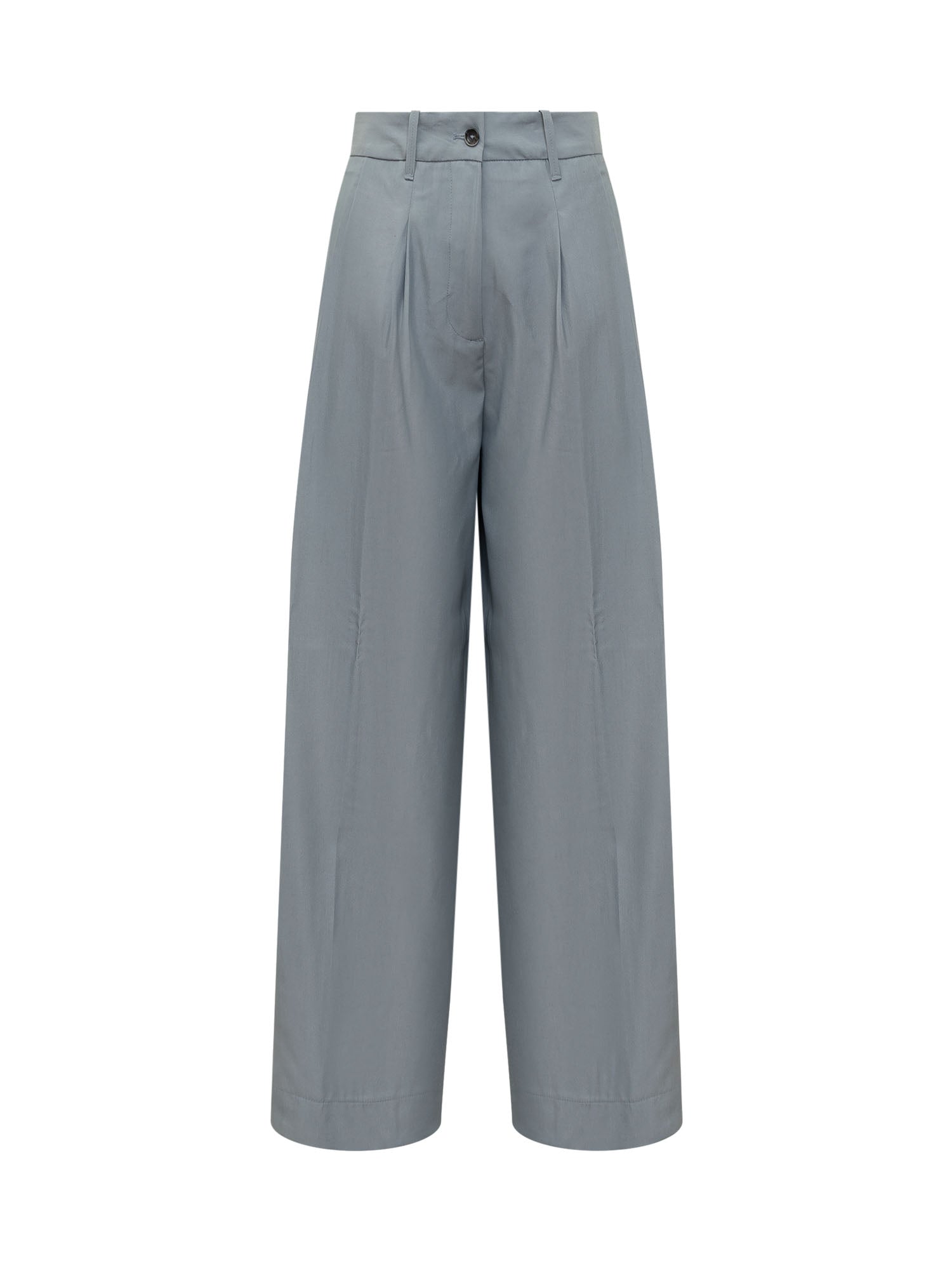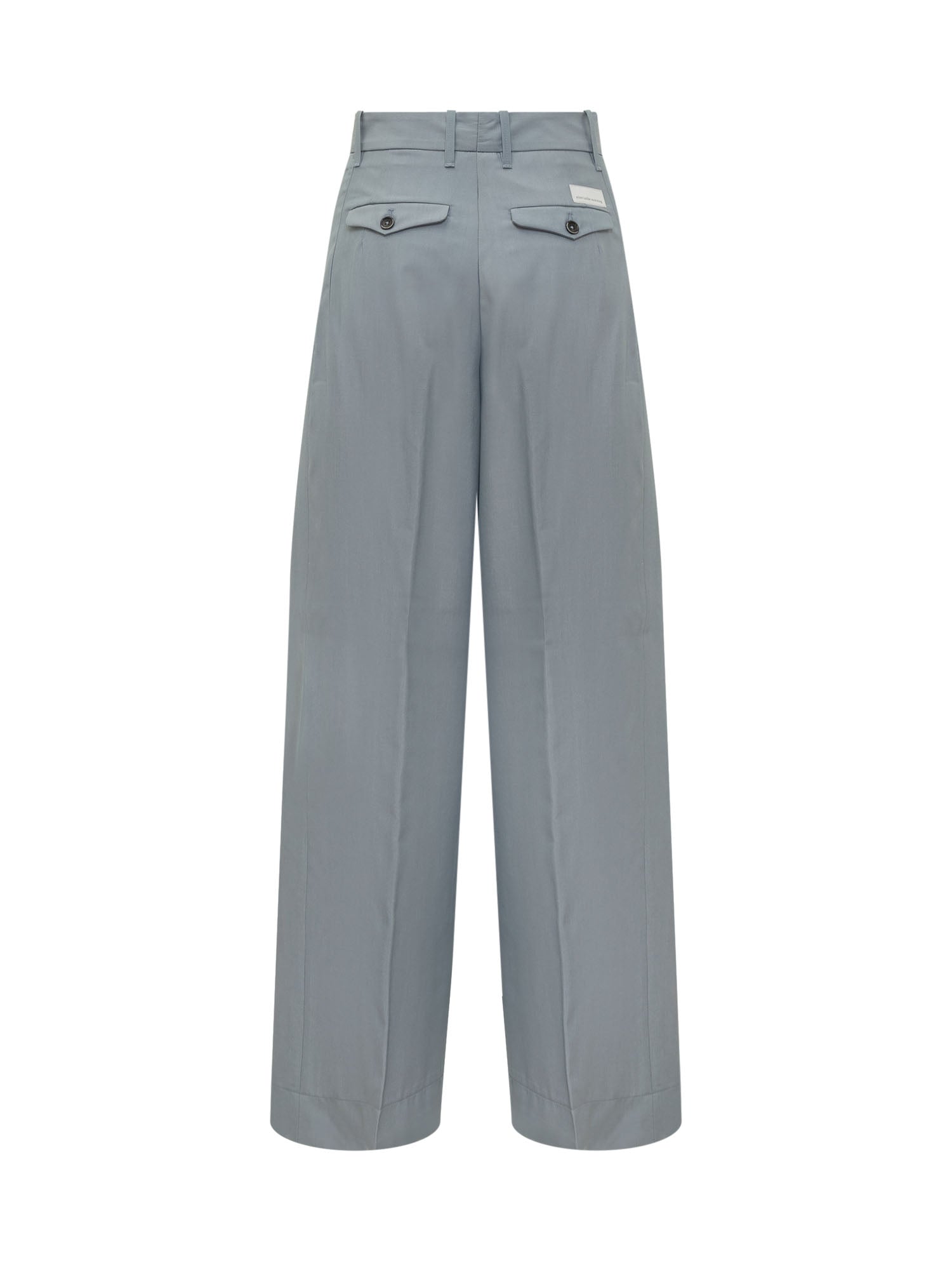 Long palazzo pants. Button and zipper closure. Belt loops. Four pockets.