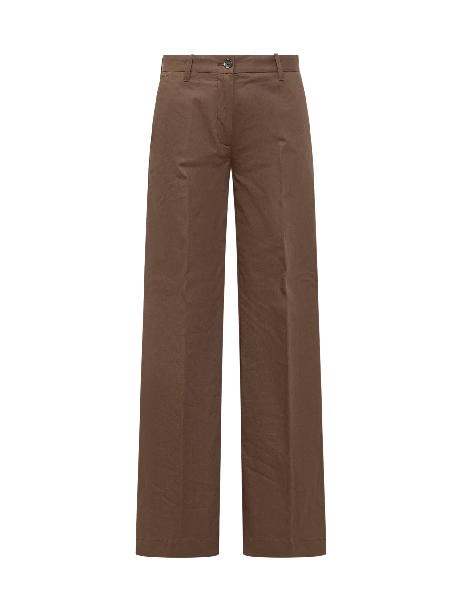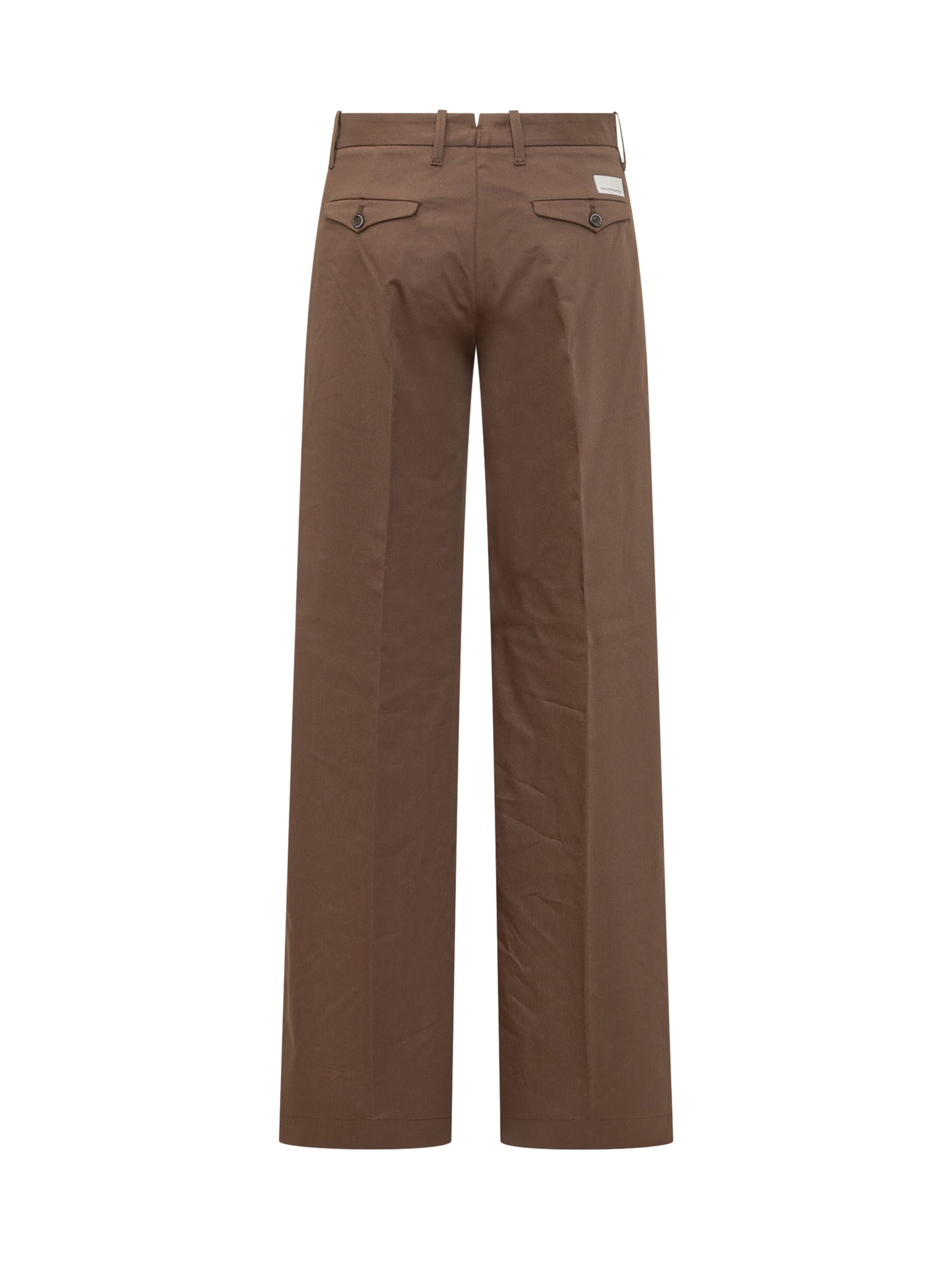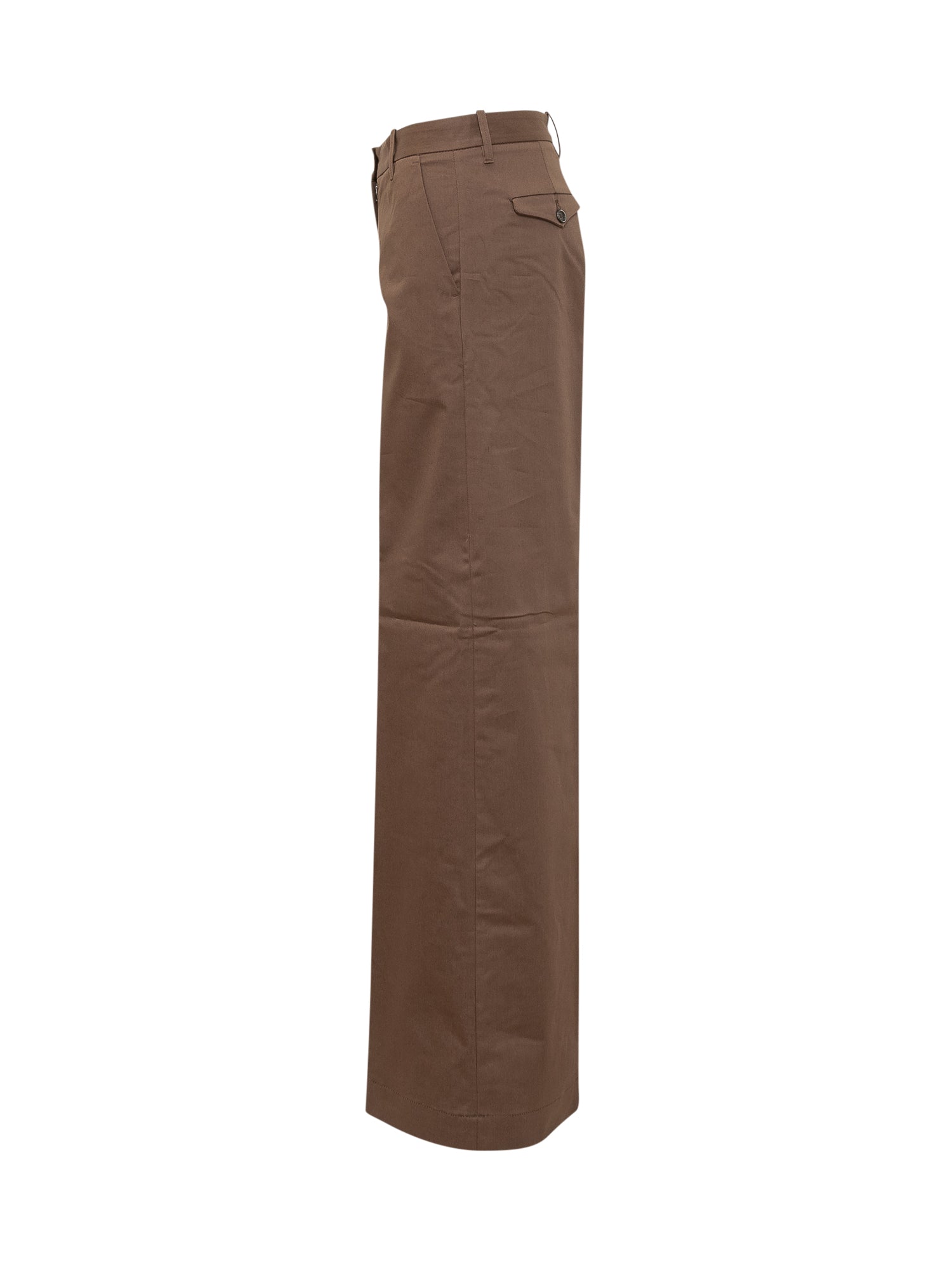 Button and zip closure. Wide leg. Slant pockets. Flap pockets with button on the back.