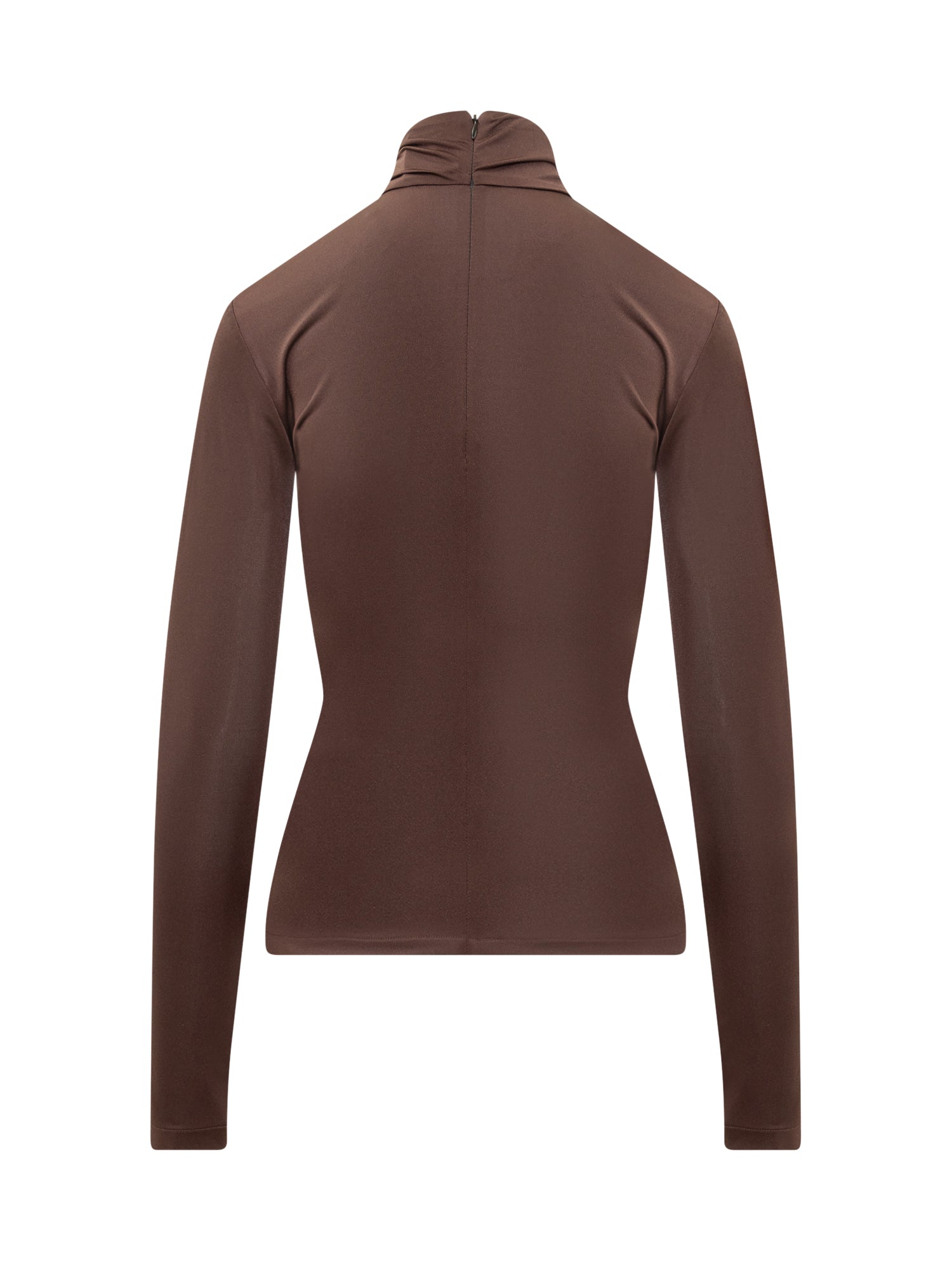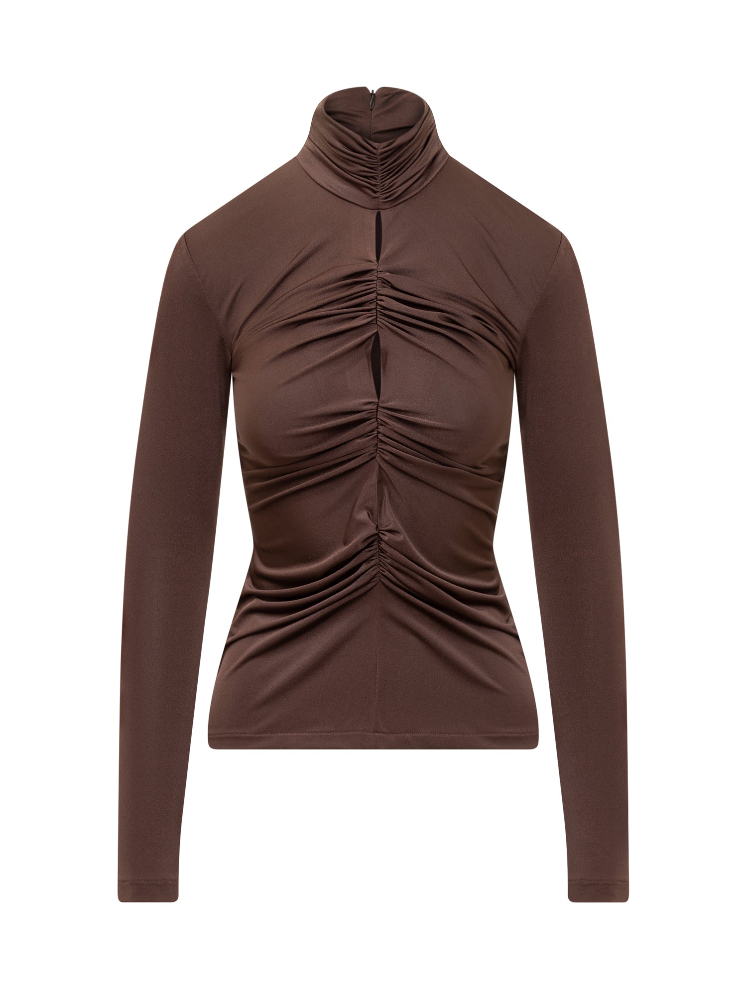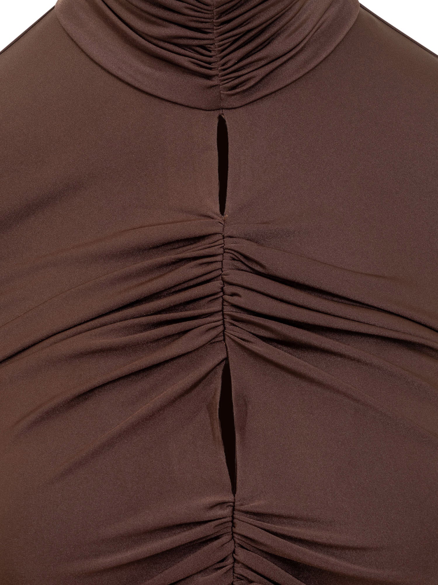 Long sleeved top. High neck. Curl and cut-out on the front. Zip closure on the back.
