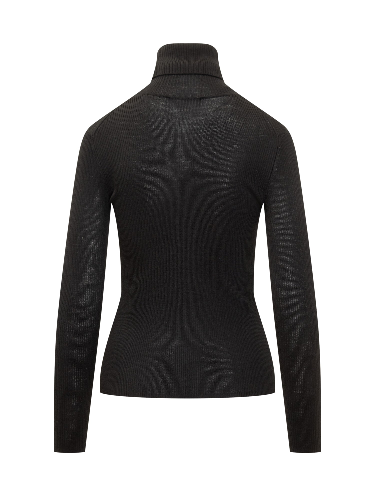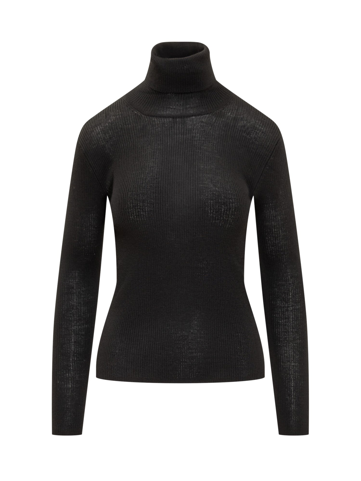 Black sweater with long sleeves. Turtleneck. All-over ribs.
