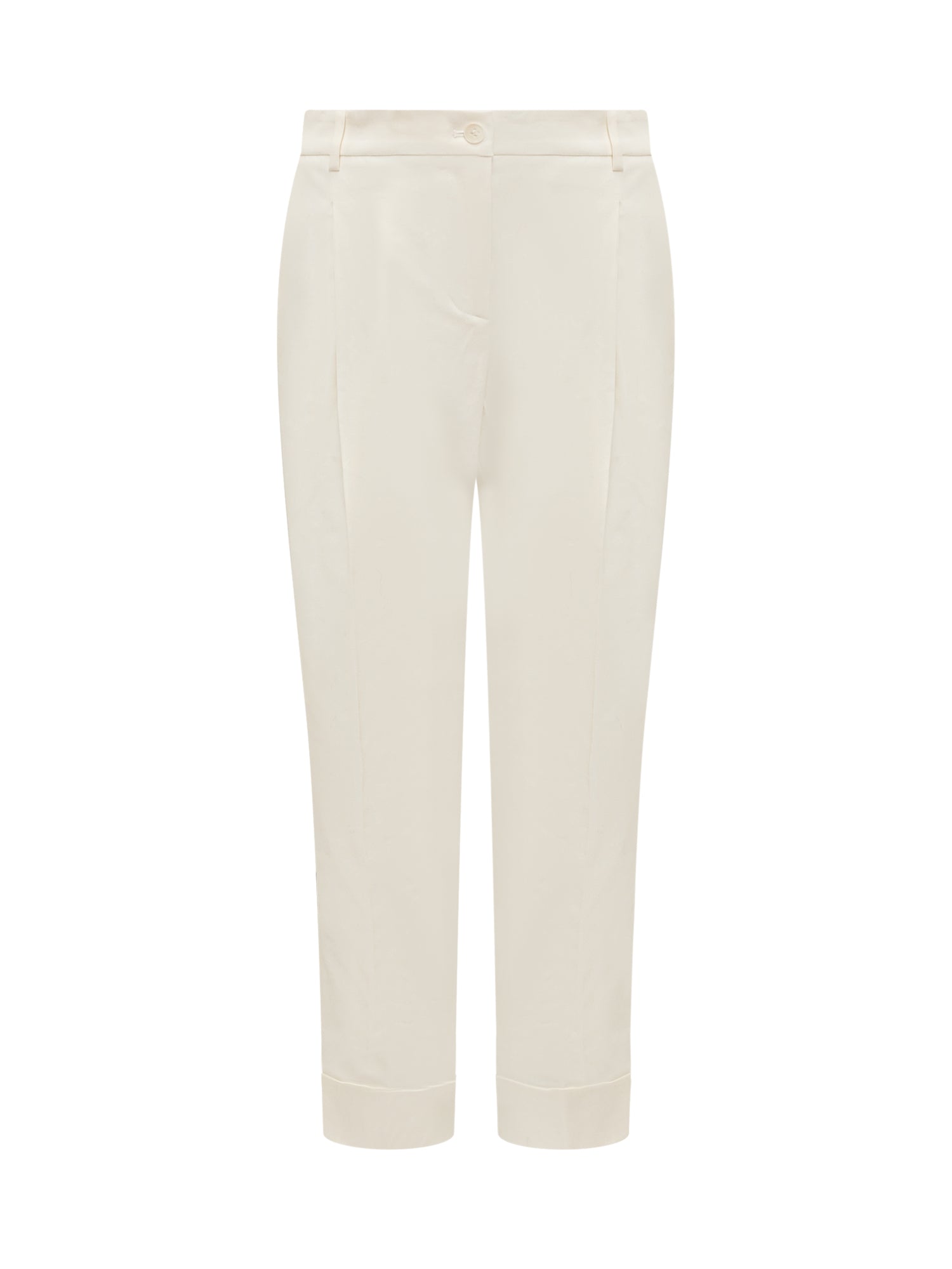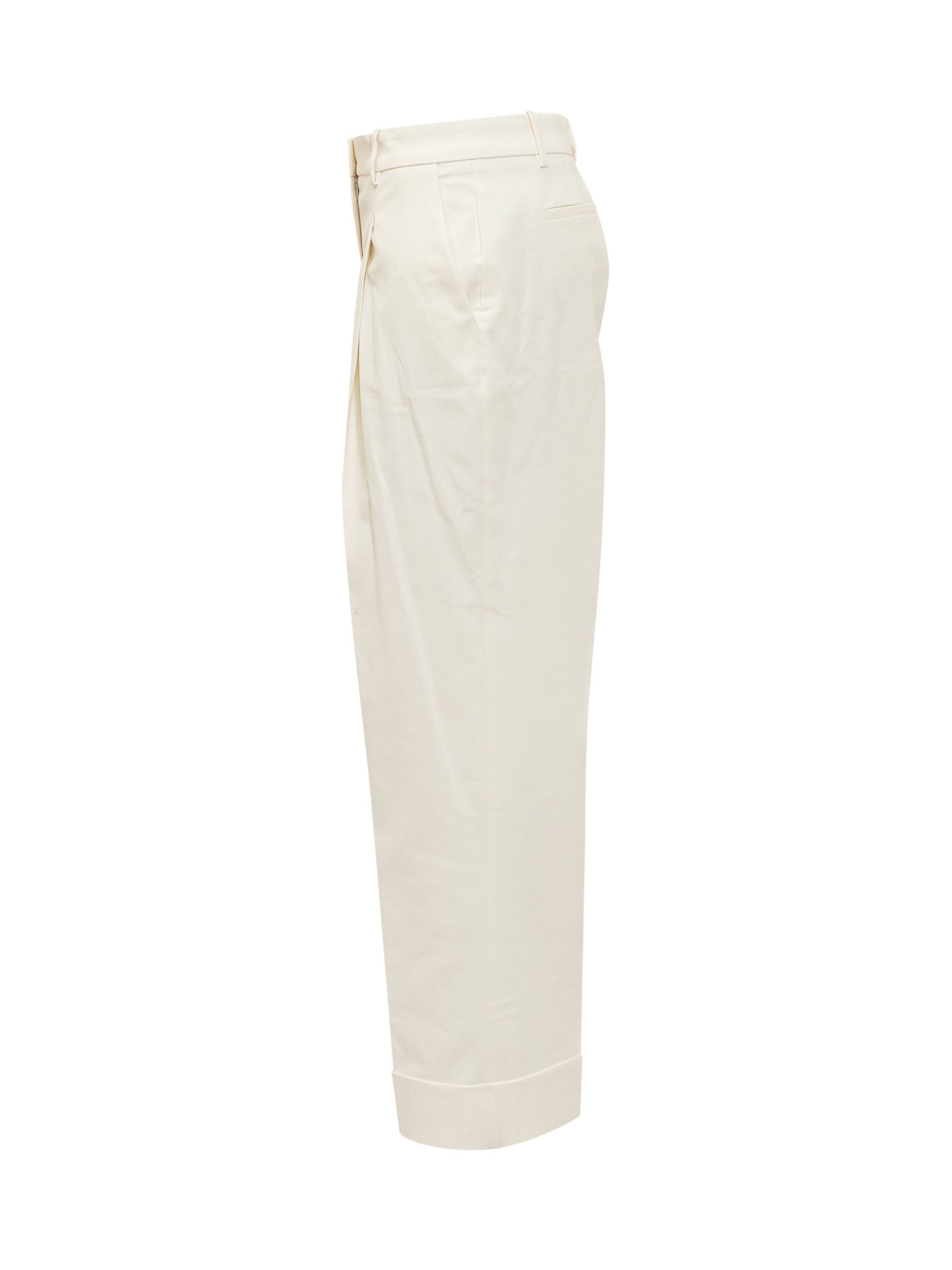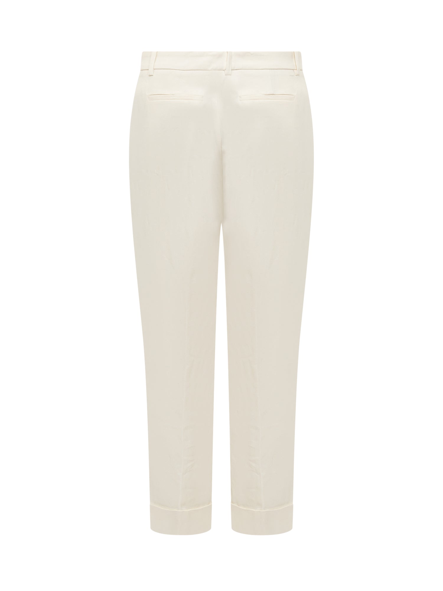 White trousers in cotton blend. Belt loops. Side pockets. Welt pockets on the back. Zip and button closure.