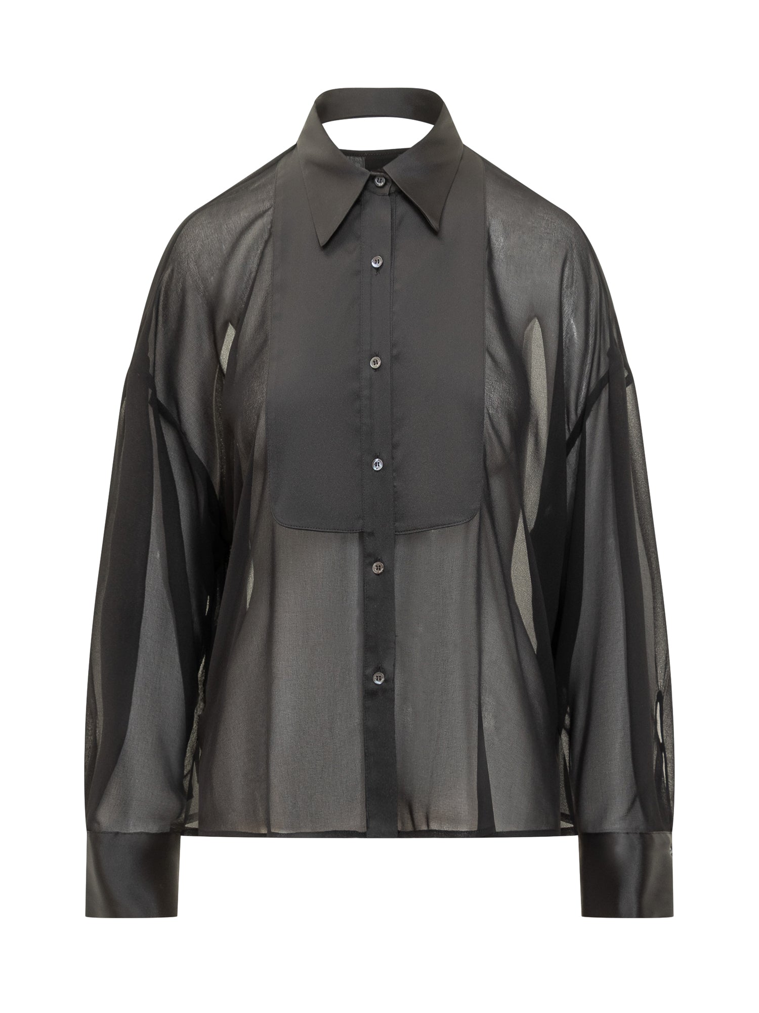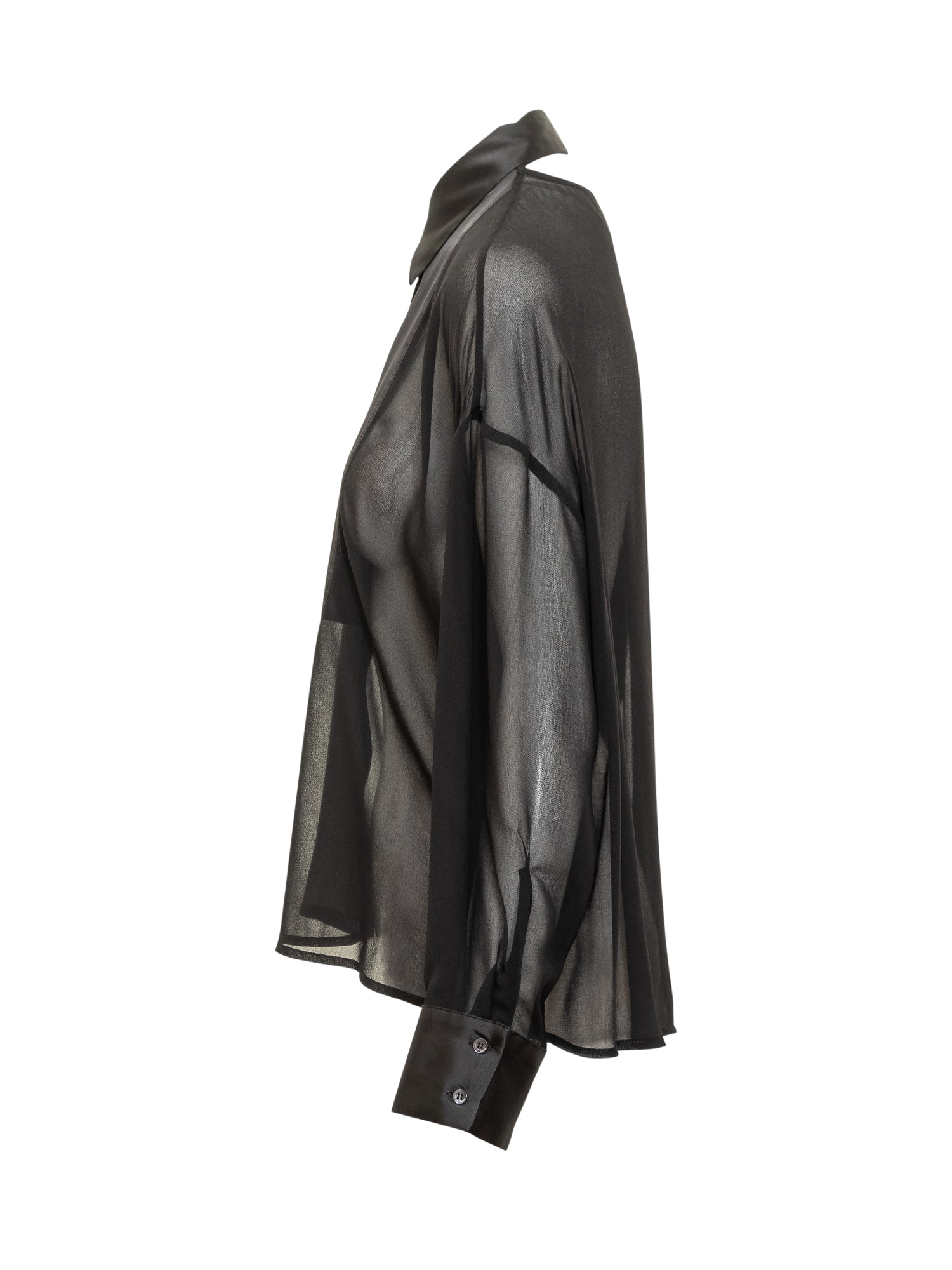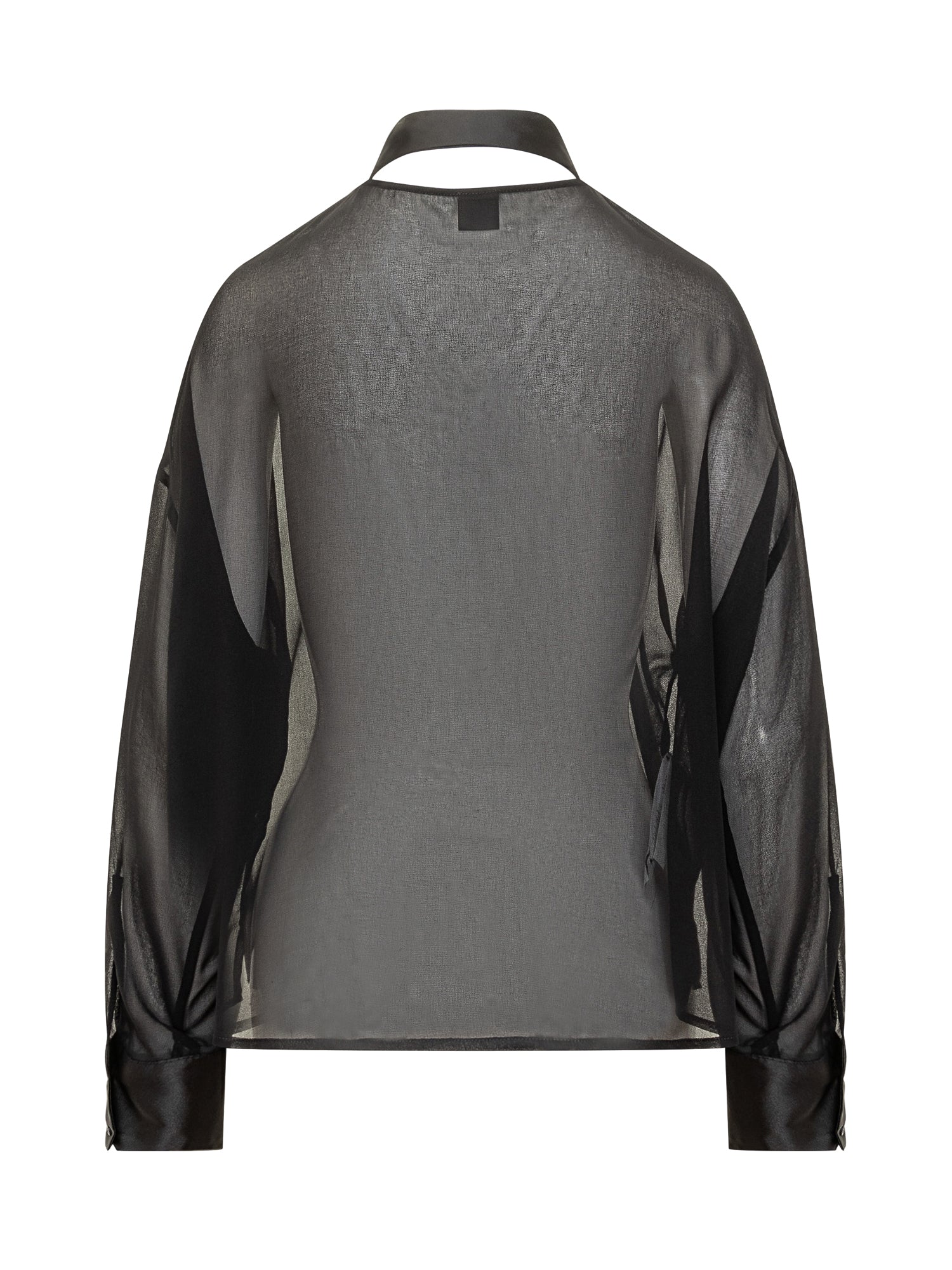 Pinko sheer black organza shirt with classic collar and front button closure.