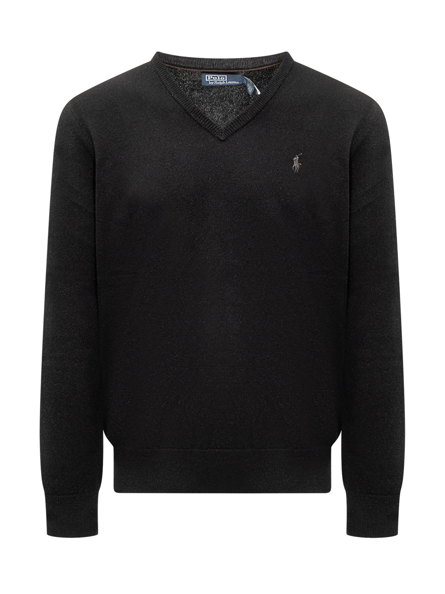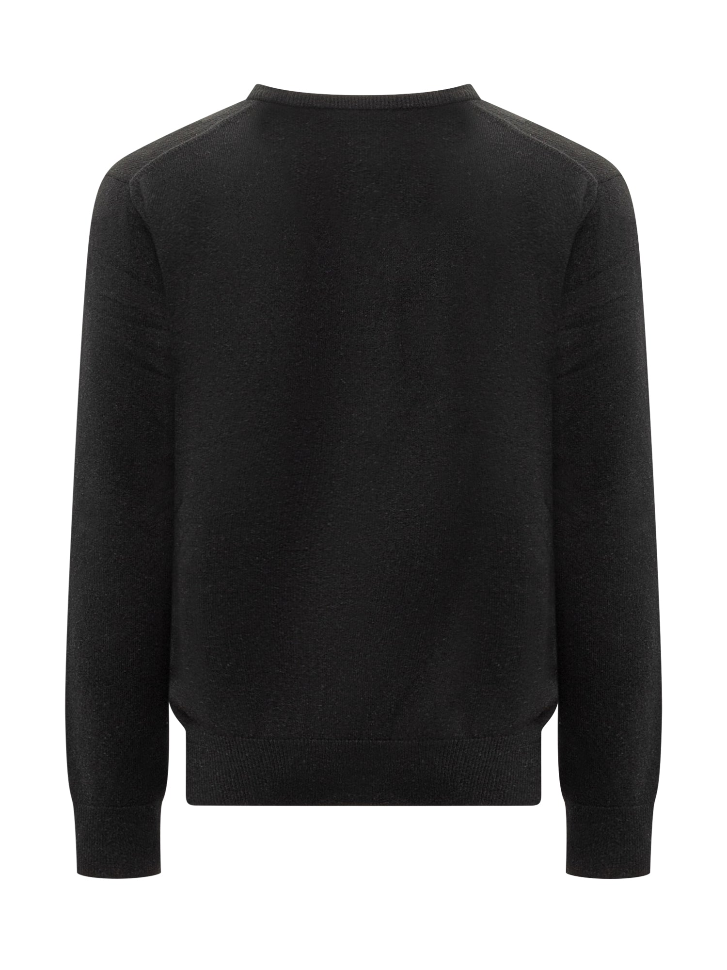 Long-sleeved wool sweater. V-neck. Ribbed hem. Logo on the chest.